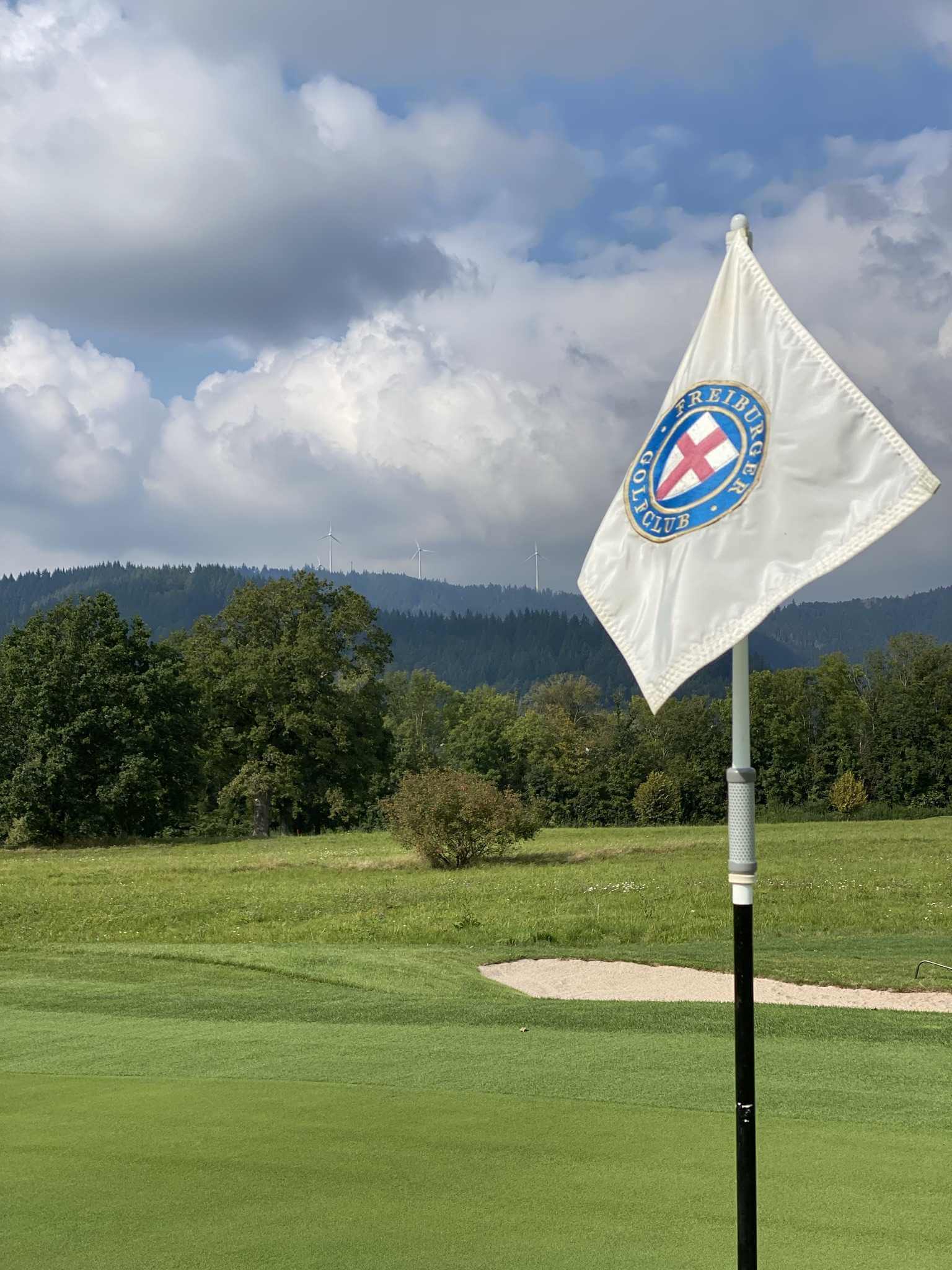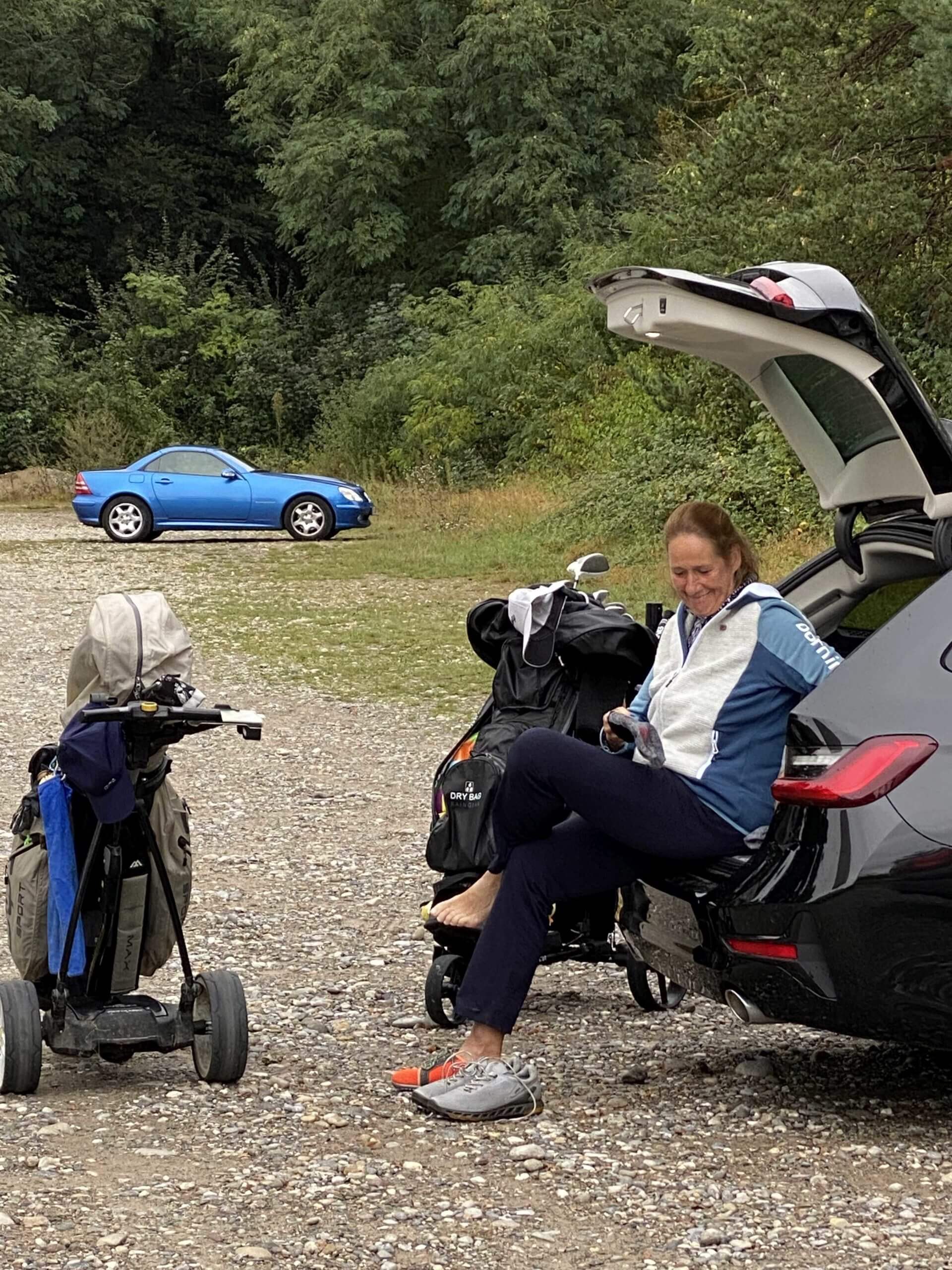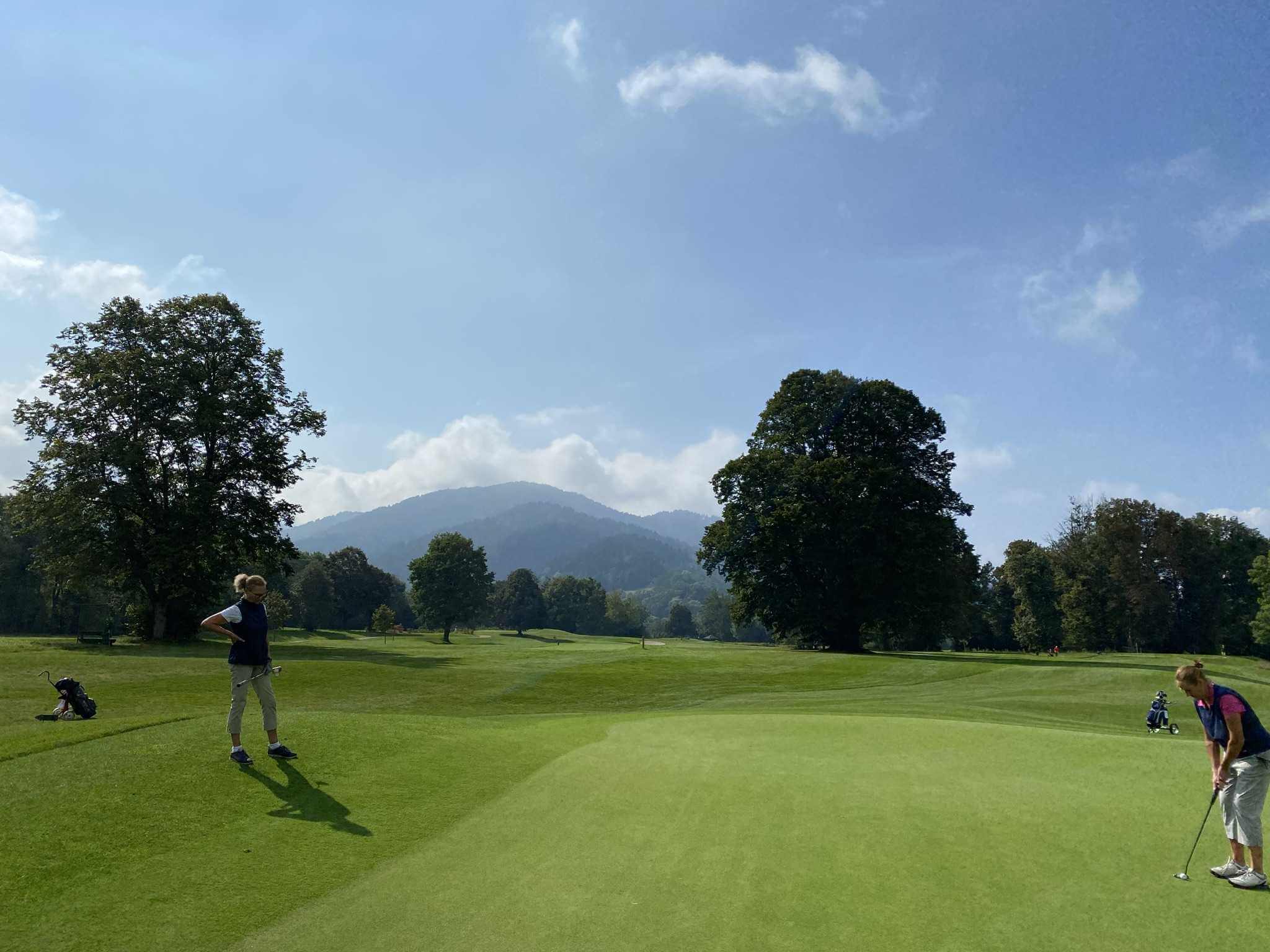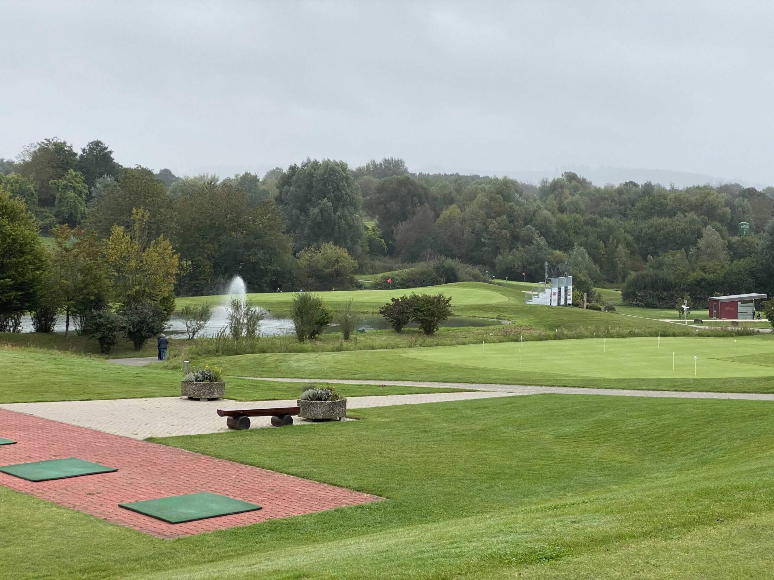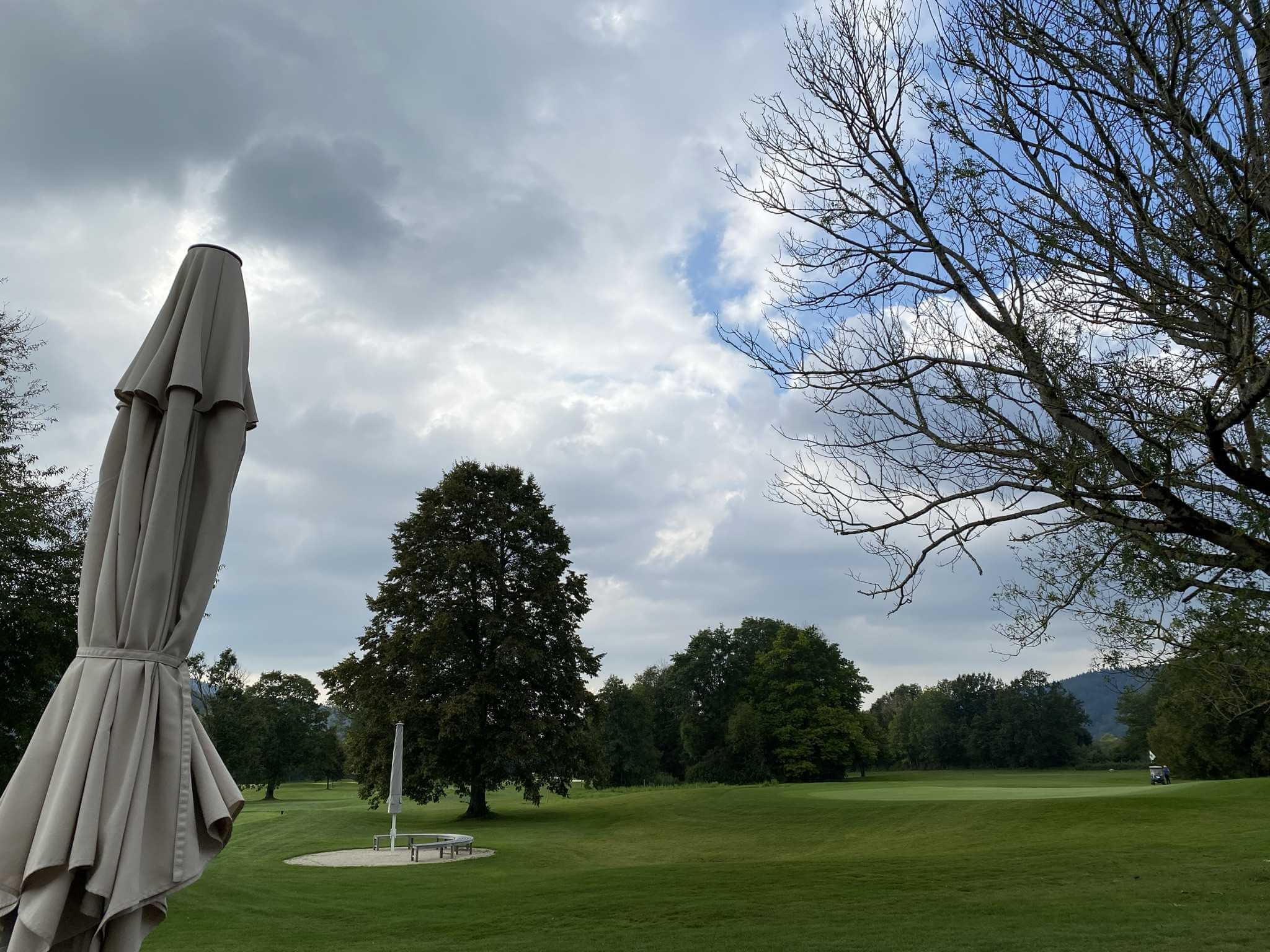 Nach dem Frühstück fahren wir zum Golfclub Freiburg in Kirchzarten. Wieder einmal fahren wir grauem Himmel entgegen und dort angekommen stellen wir fest, dass es heute auch noch ziemlich windig ist. Also alle Jacken über einander gezogen und die Bermudas bleiben im Auto.