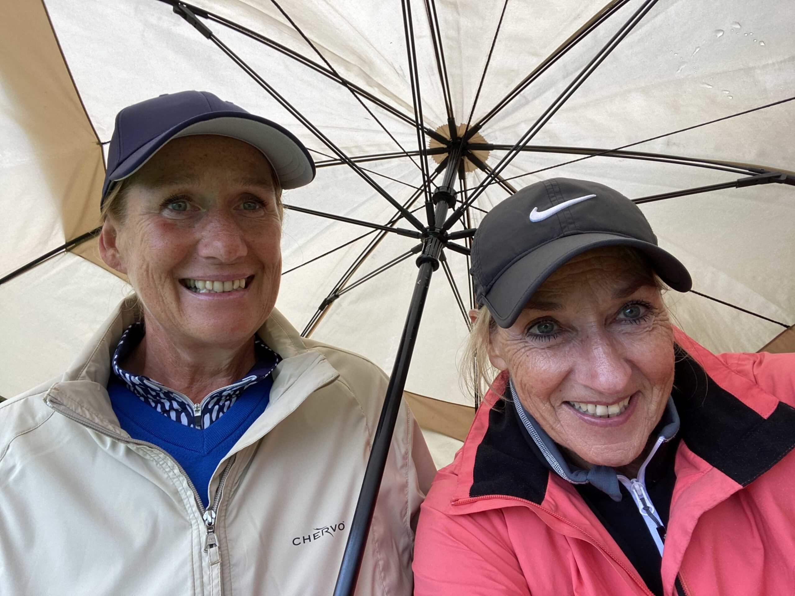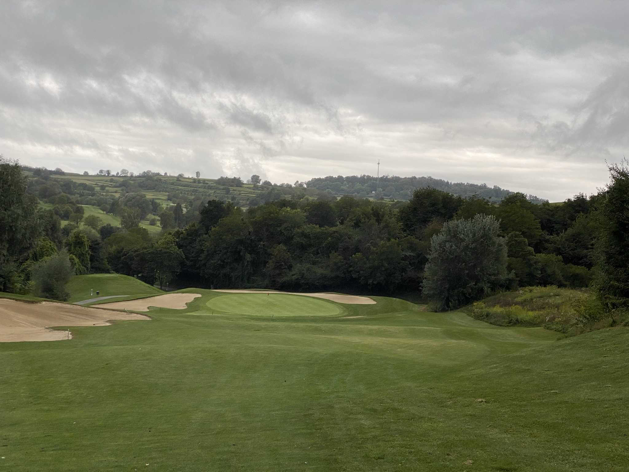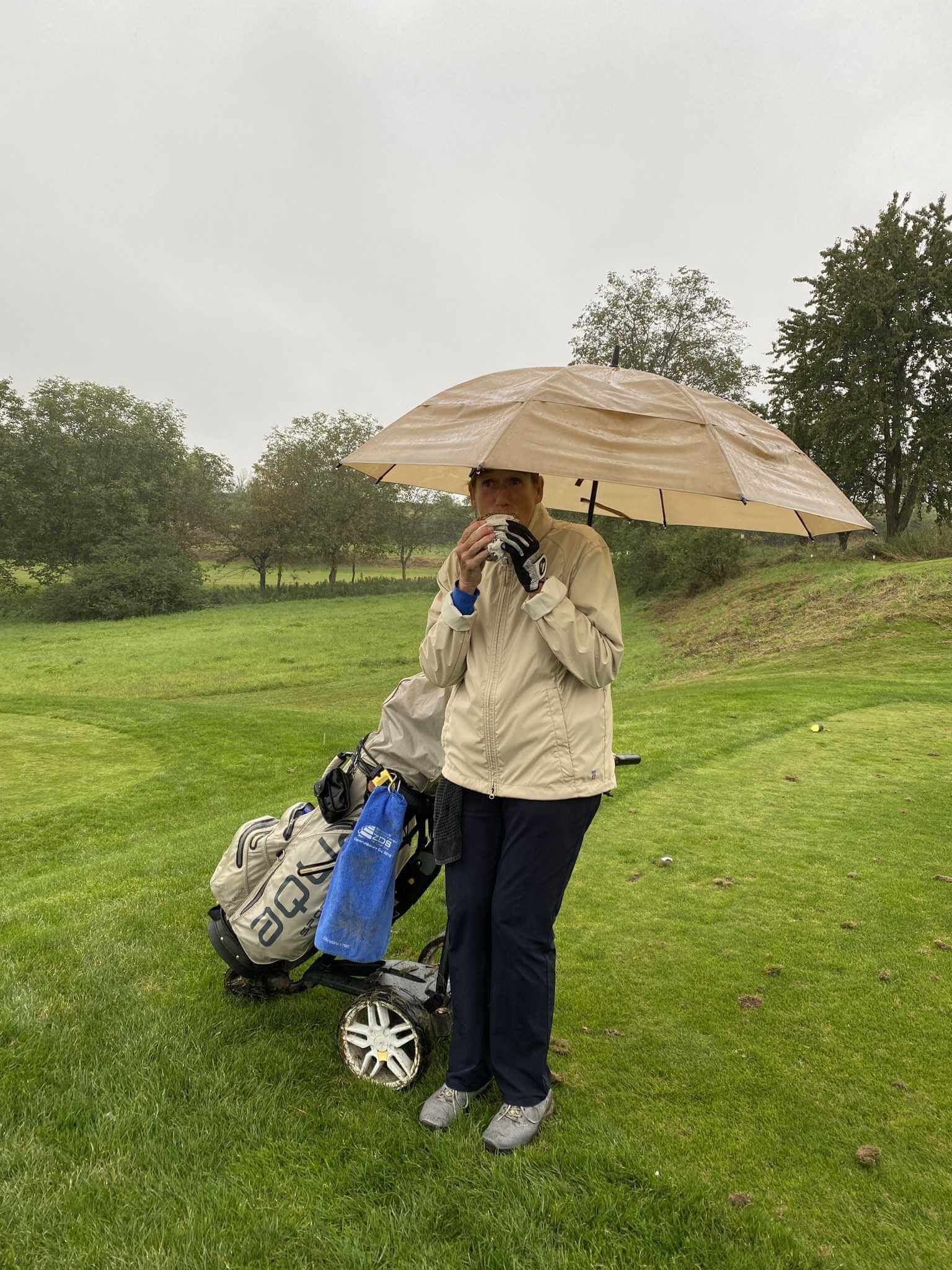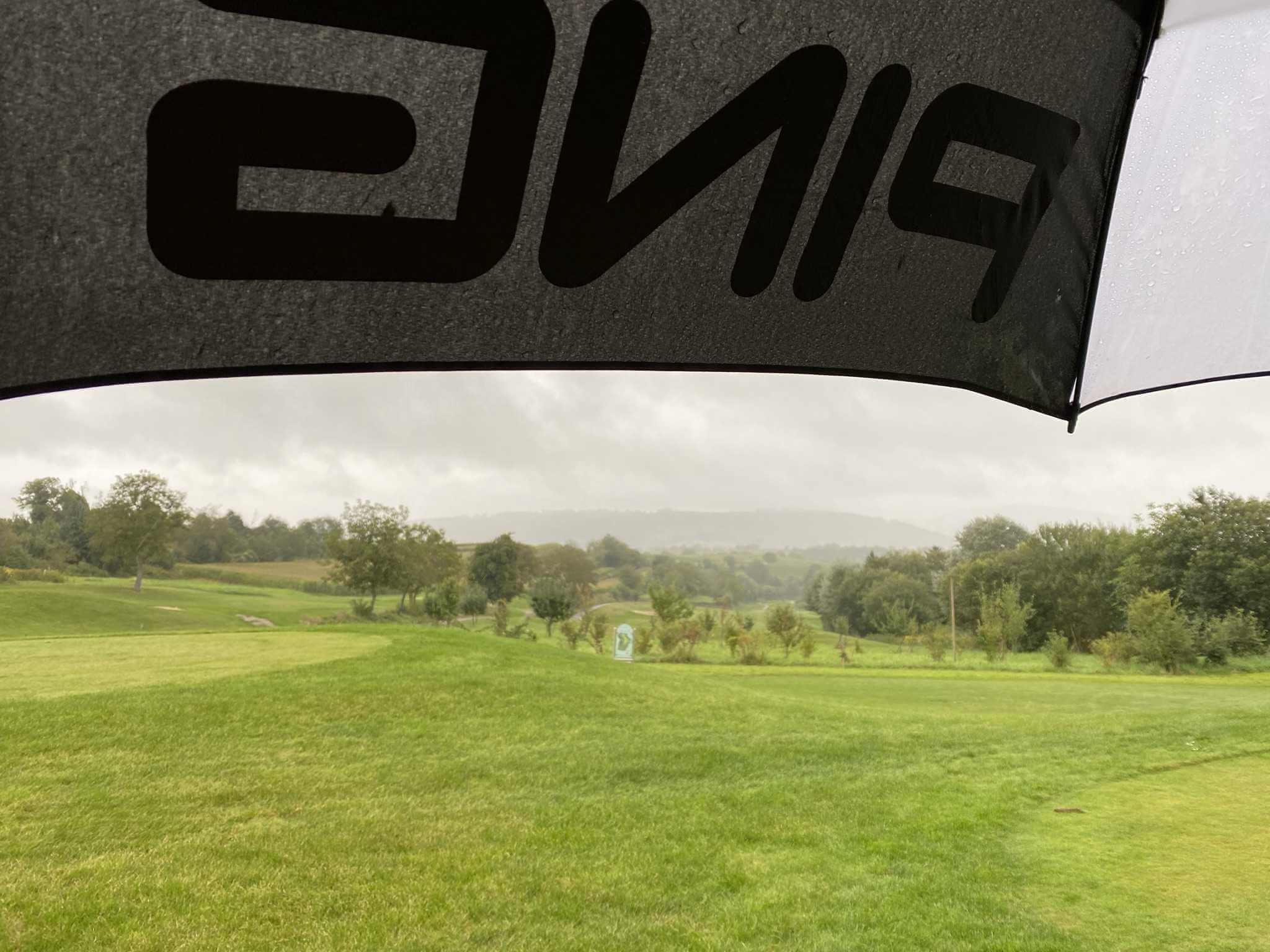 Ungefähr nach der Hälfte laufen wir auf den letzten Flight des Turniers vor uns auf. Nun wird es zäh und langsam. Wir warten an jeder Bahn und beobachten die Spieler vor uns beim langwierigen und meist erfolglosen Putten. Vermutlich spielen die beiden ihr erstes Turnier und versuchen ihr 54-er HCP zu verbessern. Zur gleichen Zeit setzt mäßiger Regen ein. (Ja, so war es vorhergesagt).