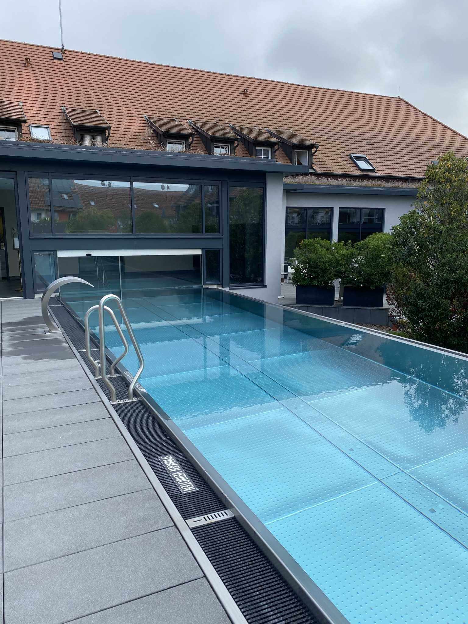 Ich wache auf und stelle fest, dass es auch ein halbes Viertele weniger hätte sein dürfen. Also ab in den beheizten Aussenpool. Zunächst teile ich mir diesen nur mit einer Dame, dann kommt ein Herr dazu und zuletzt Christina. Nun ist das schmale Becken schon ziemlich voll. Artig schlängle ich mich zwischen der Dame und der beherzt Rückenkraulenden Christina hindurch. Auf jeden Fall war es erfrischend und belebend.