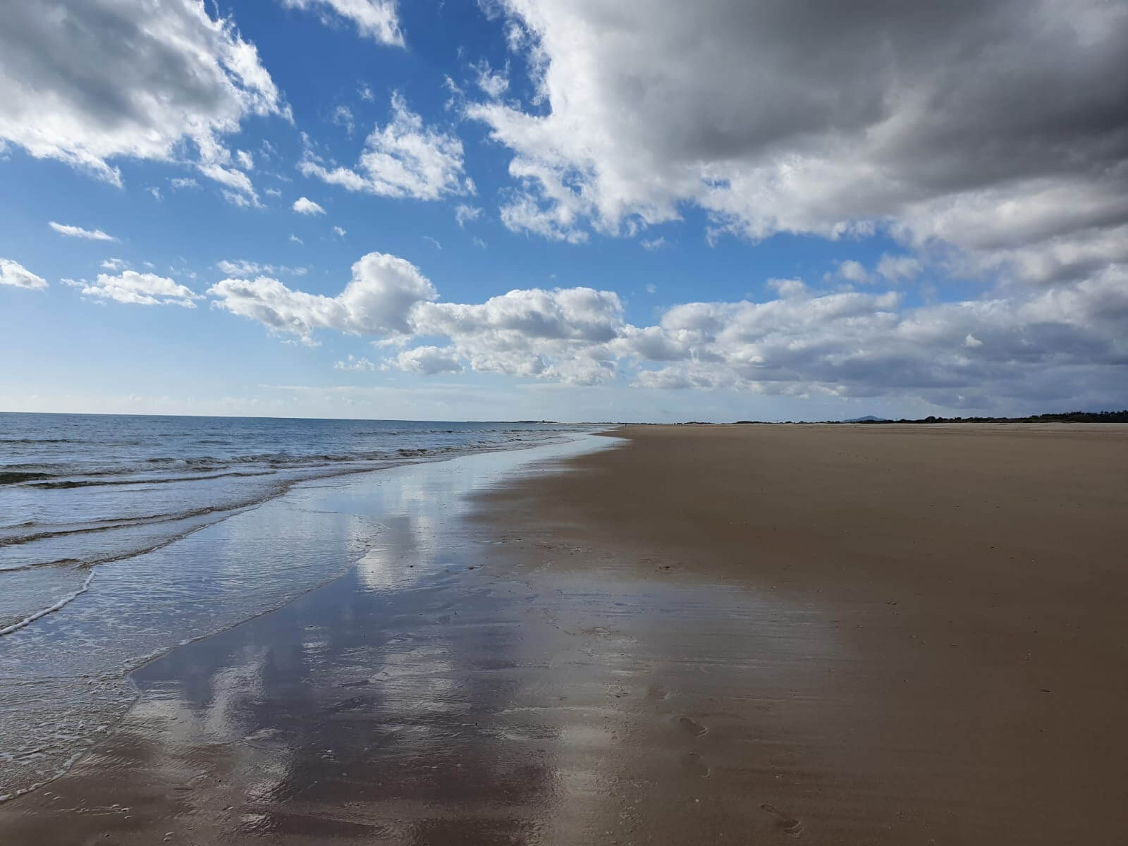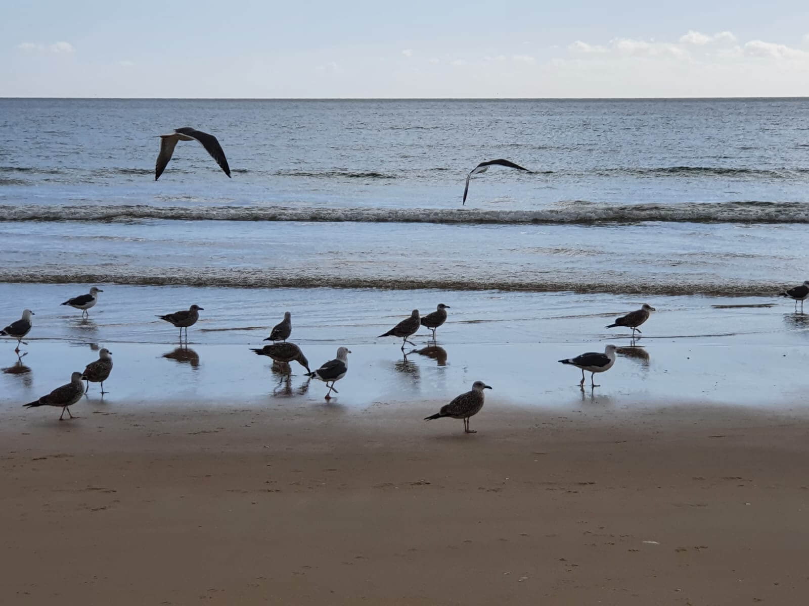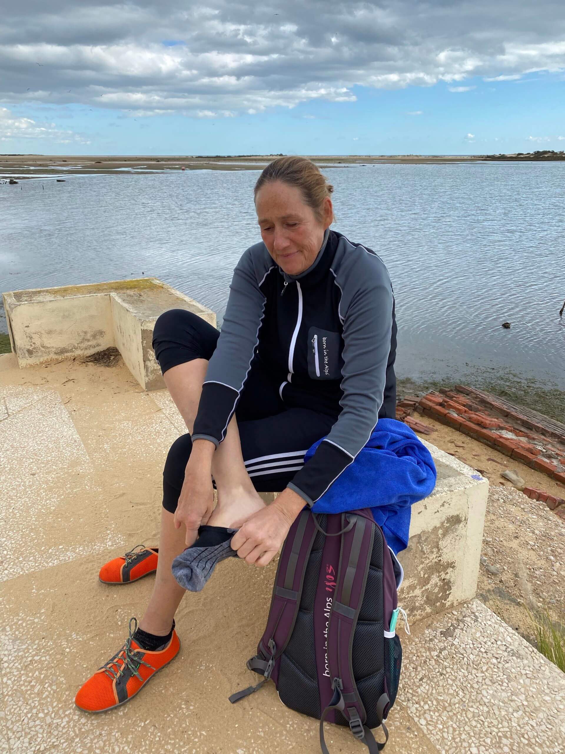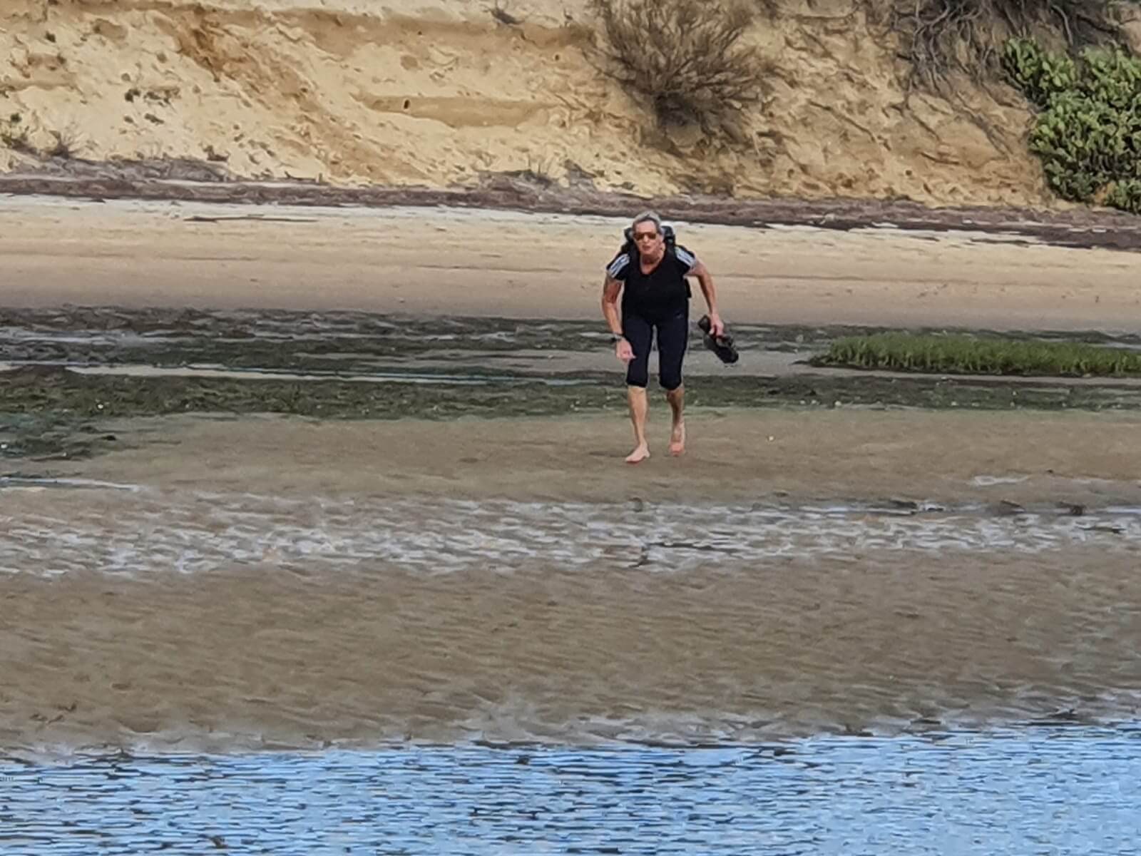 Schließlich erreichen wir die Sandbank und marschieren am Meer entlang.