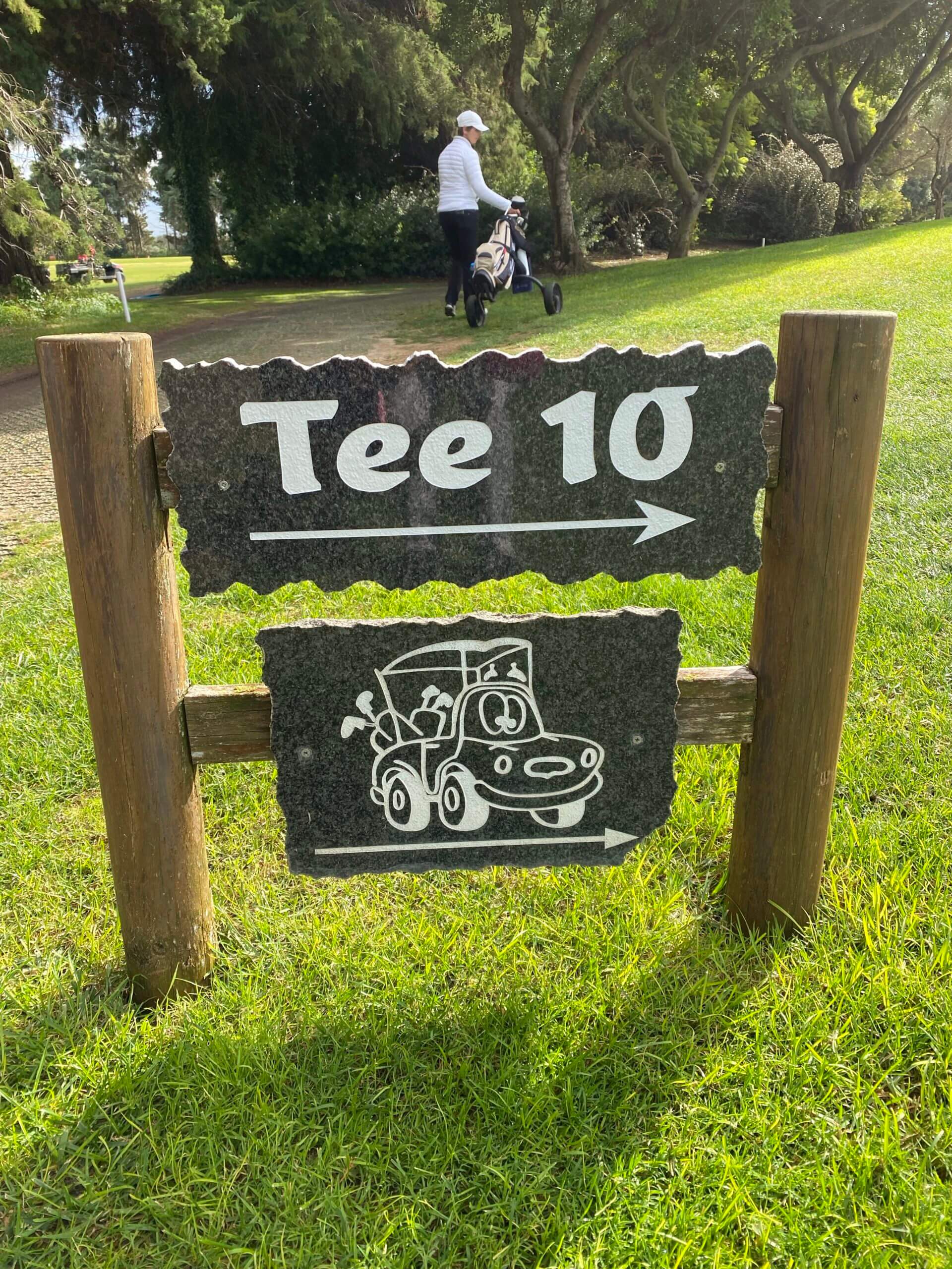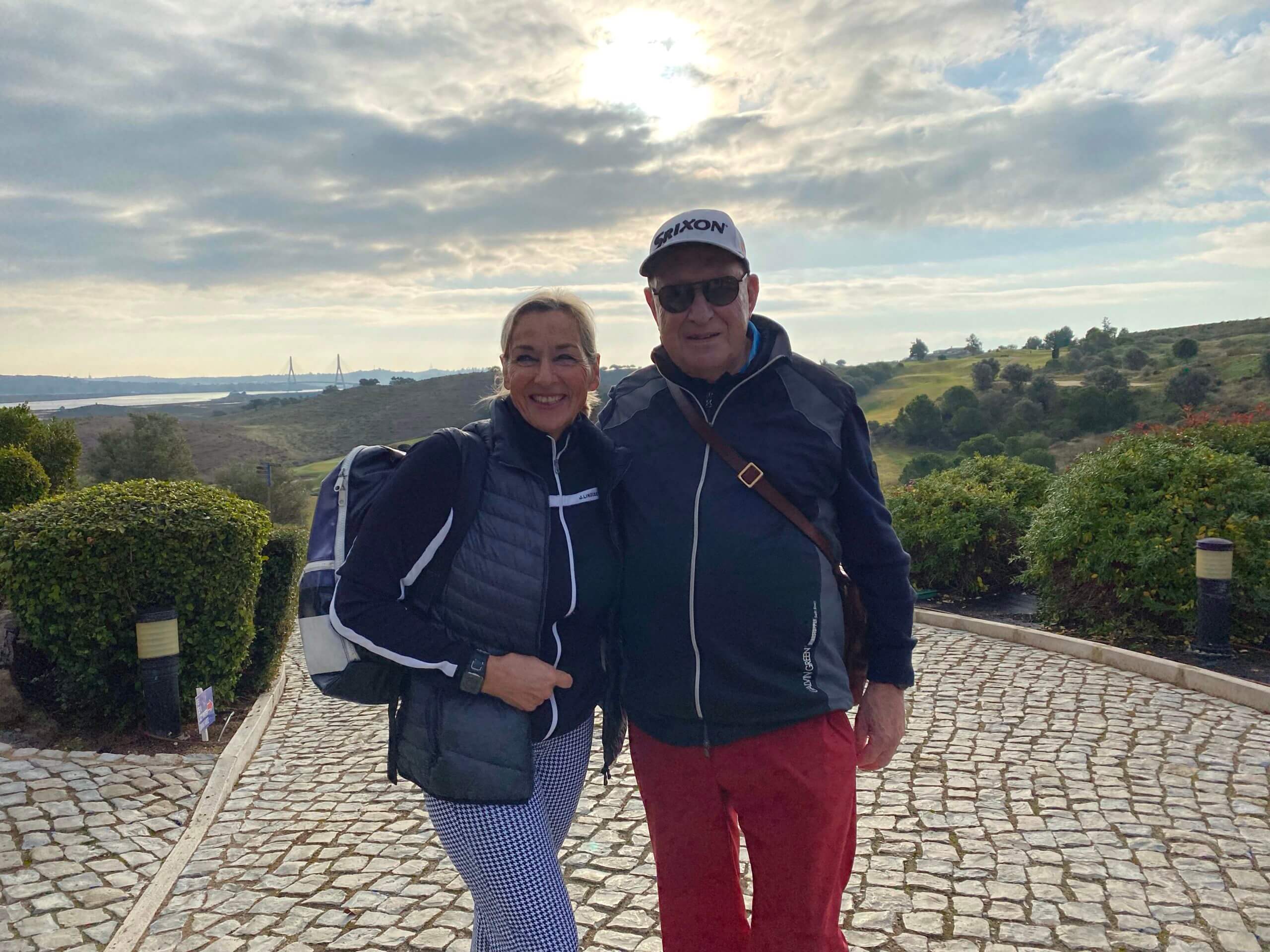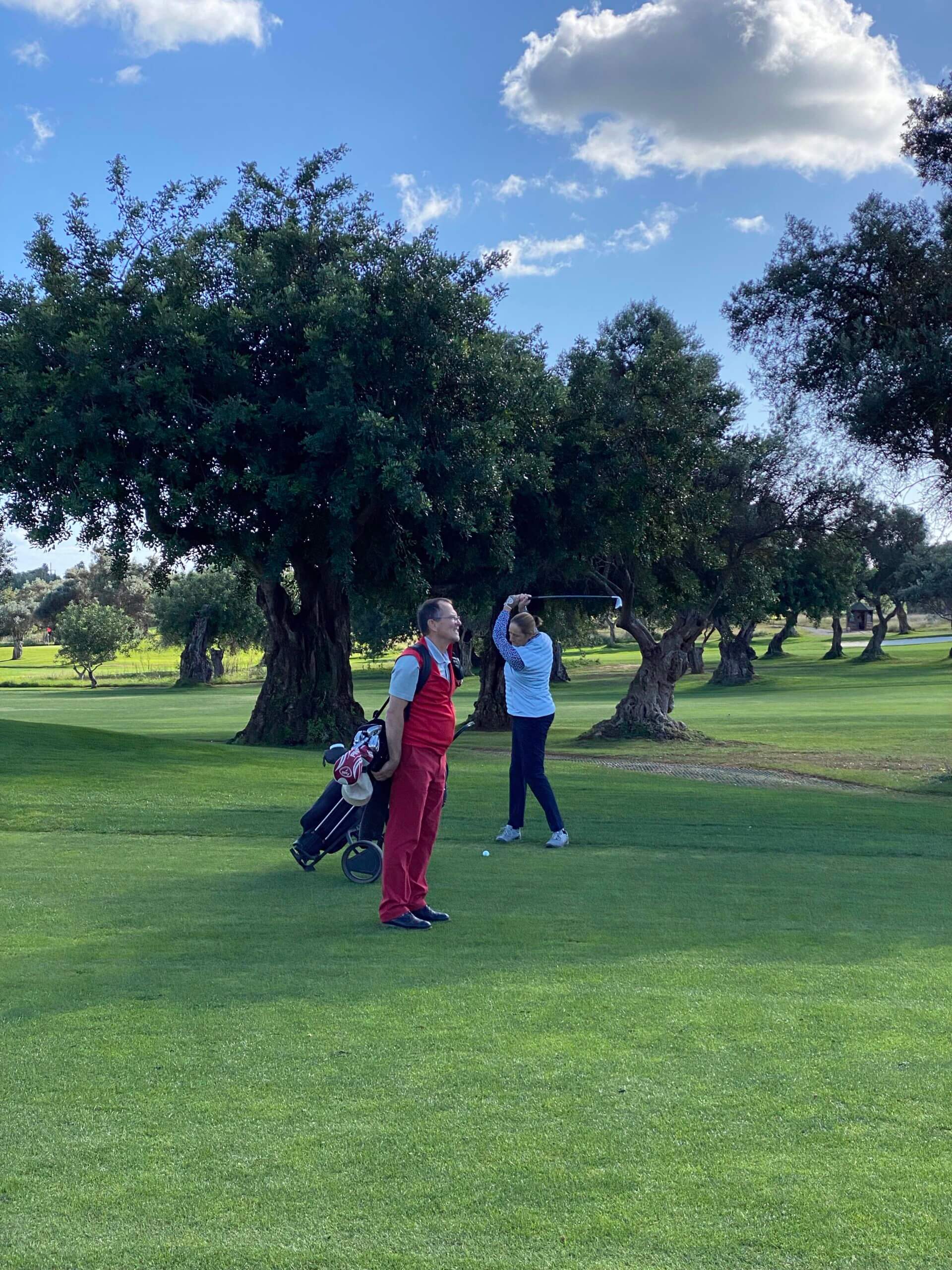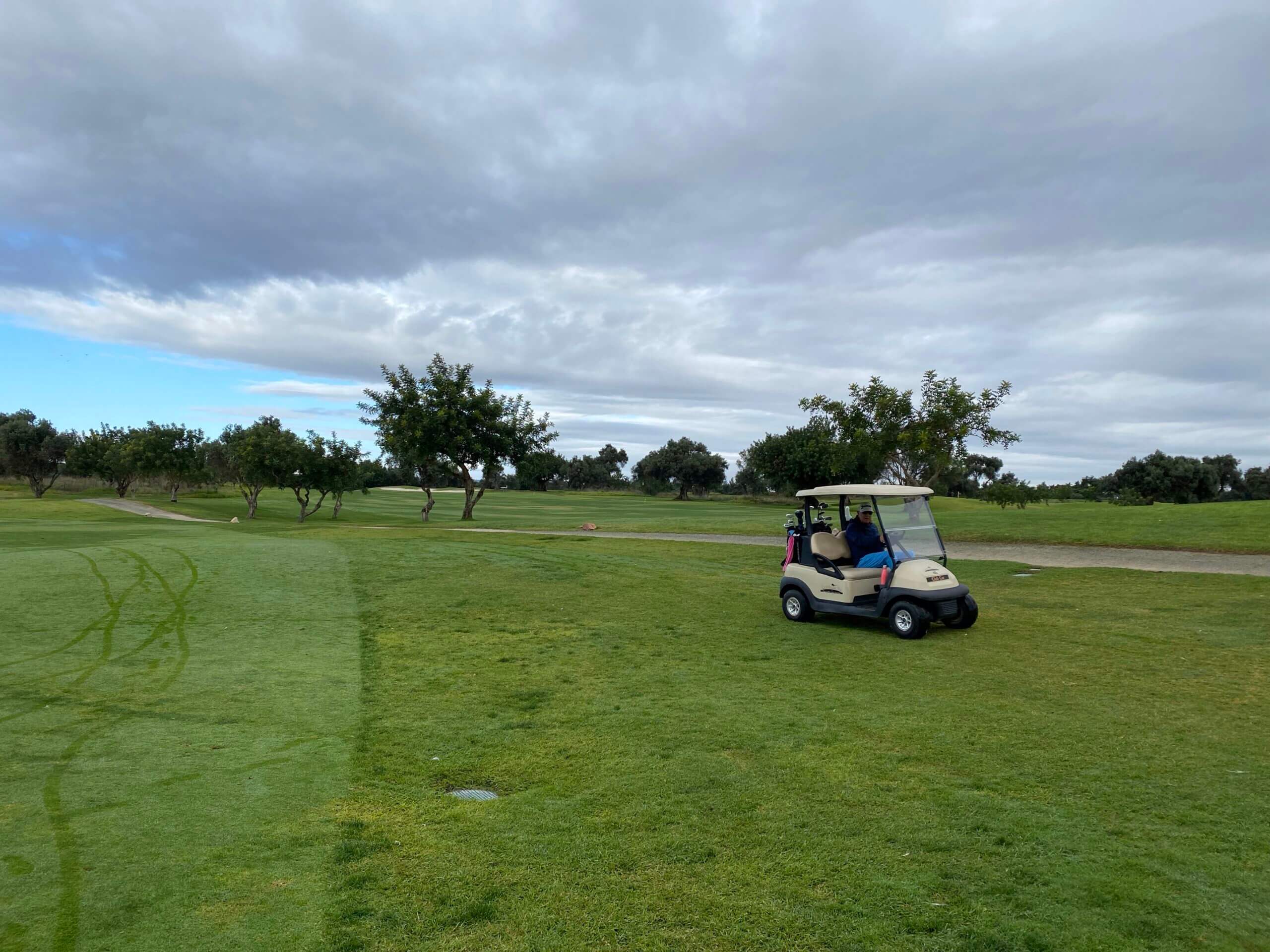 Moni und Horst teilen sich ein Wägele (Cart). Moni schlägt sich richtig gut trotz Schiene am Bein und hat sich bereits mit ihrem Schlägersatz angefreundet (einschließlich Driver). Ronald sei Dank!