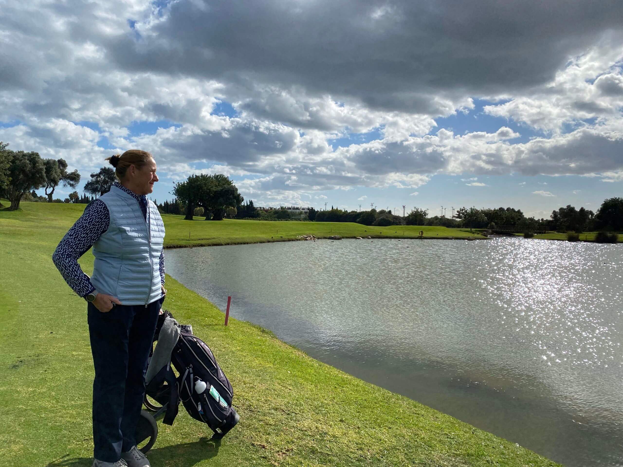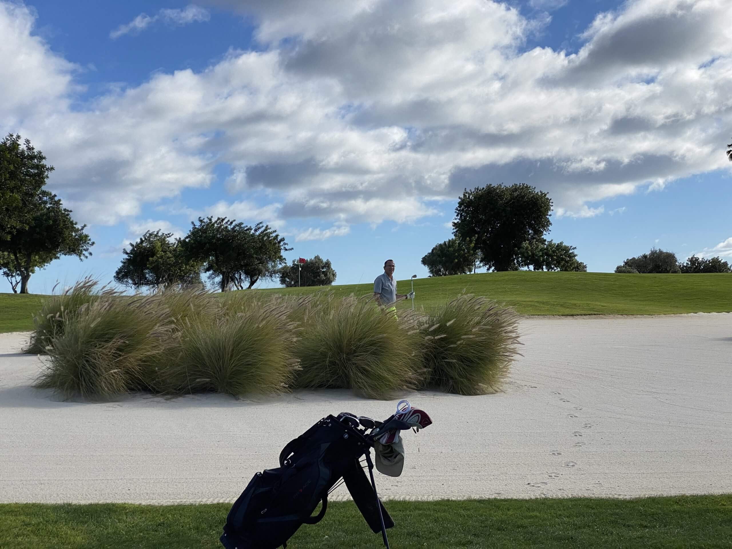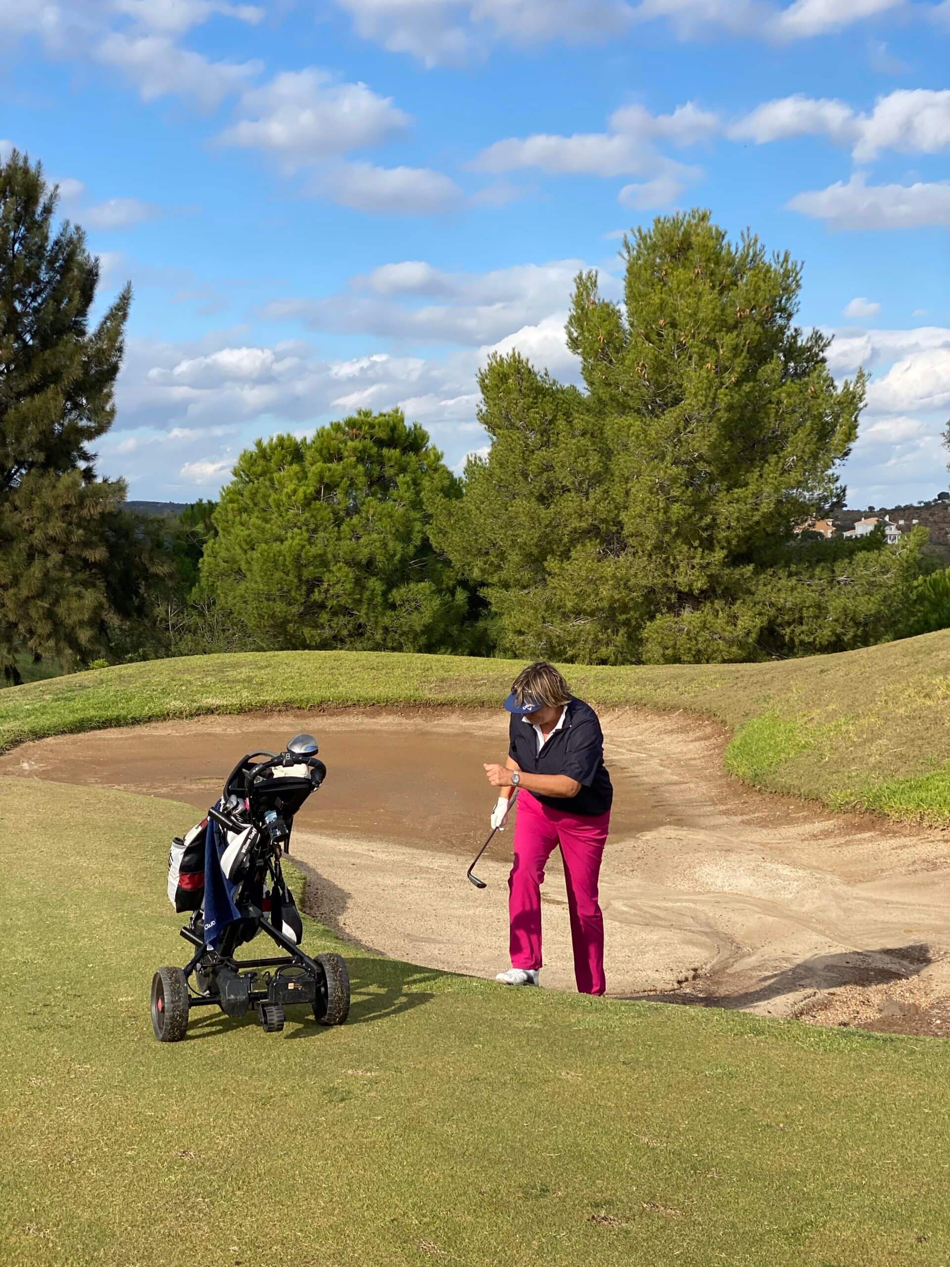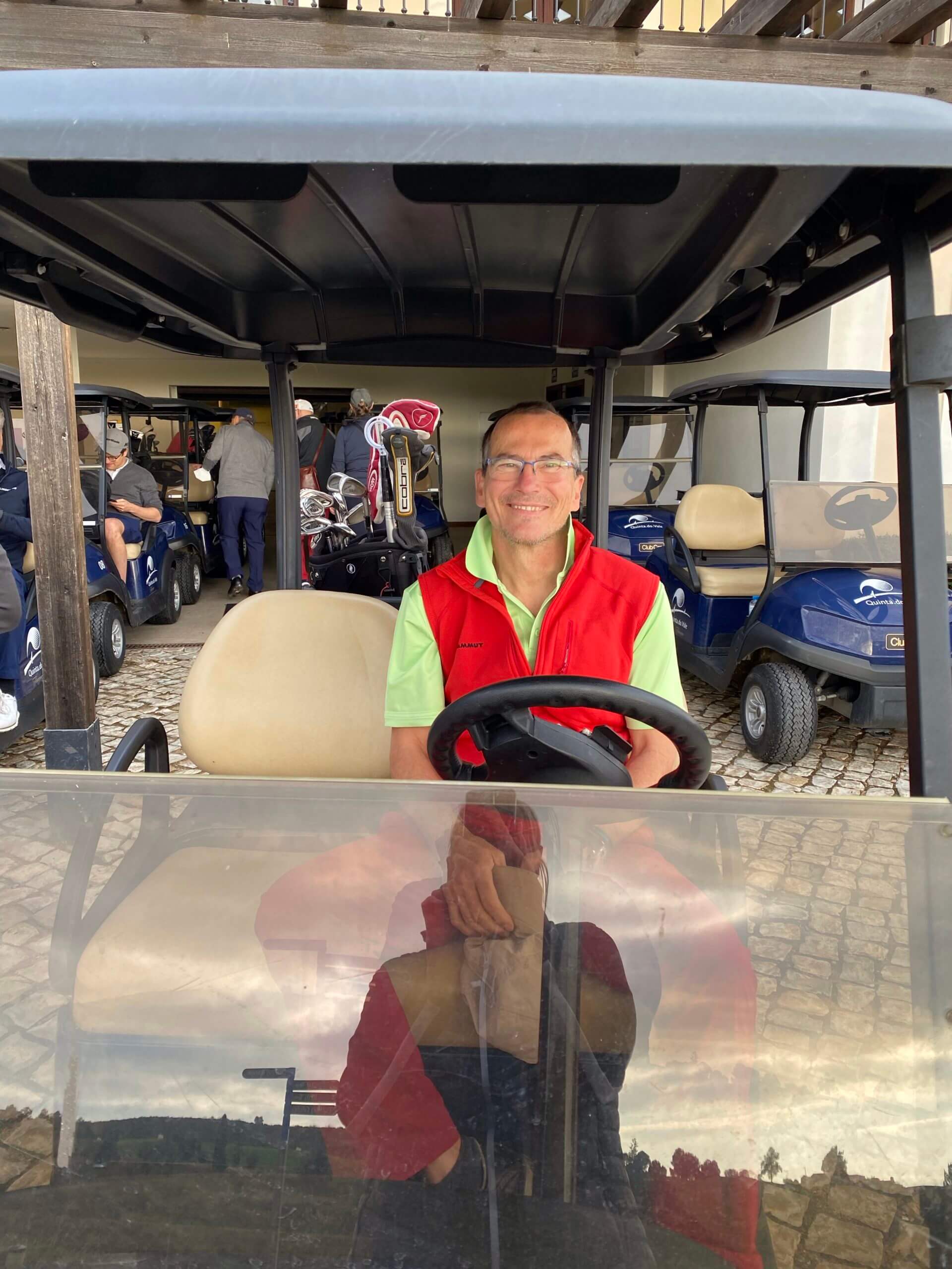 Moni und Horst teilen sich ein Wägele (Cart). Moni schlägt sich richtig gut trotz Schiene am Bein und hat sich bereits mit ihrem Schlägersatz angefreundet (einschließlich Driver). Ronald sei Dank!
