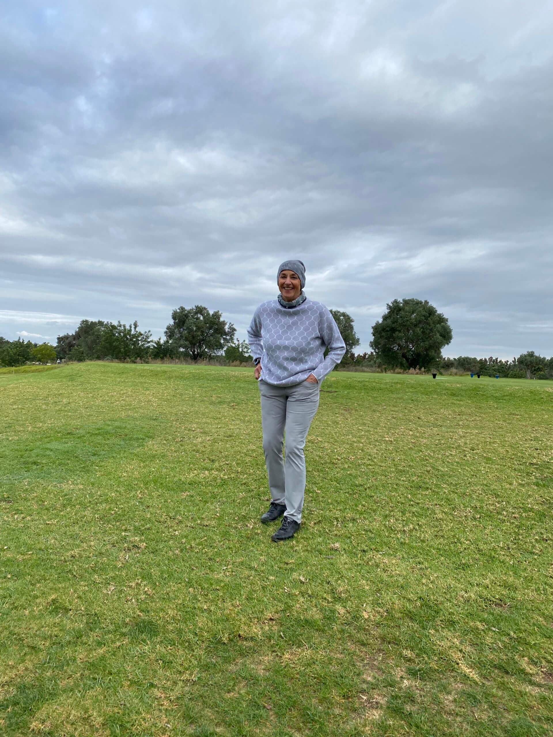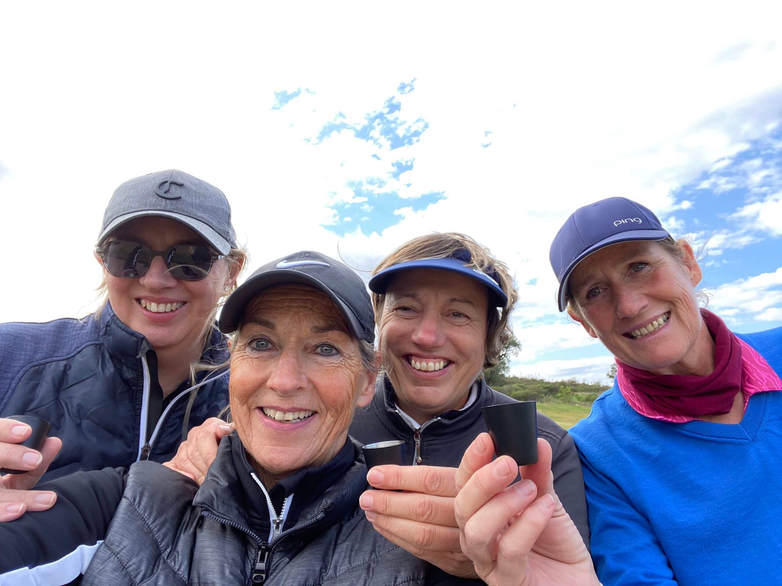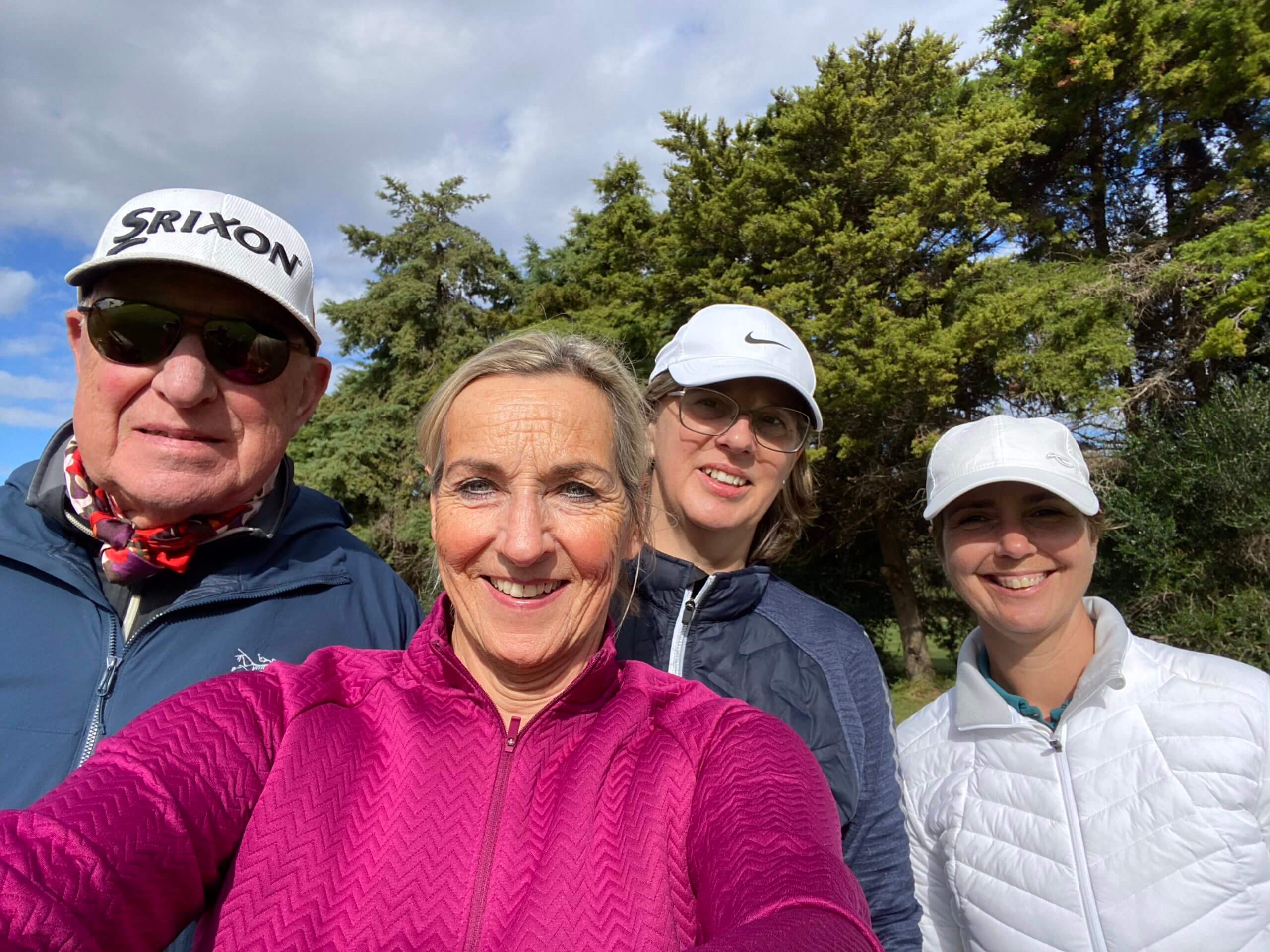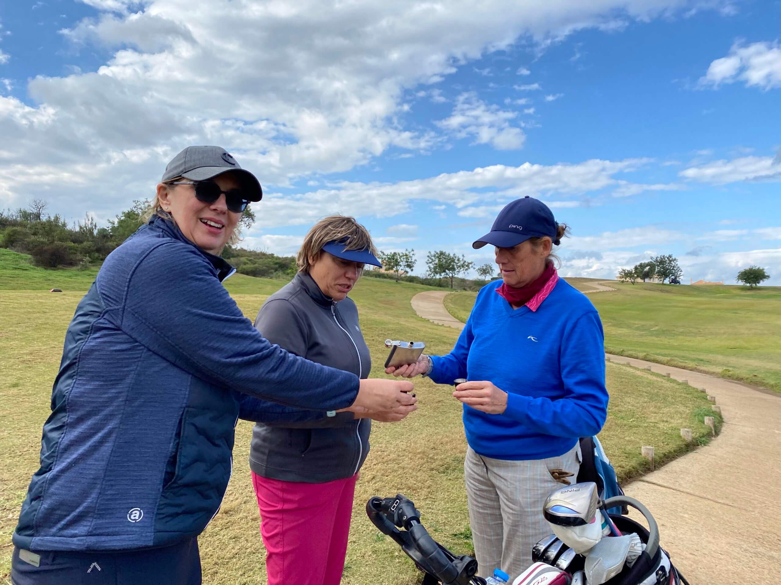 Moni und Horst teilen sich ein Wägele (Cart). Moni schlägt sich richtig gut trotz Schiene am Bein und hat sich bereits mit ihrem Schlägersatz angefreundet (einschließlich Driver). Ronald sei Dank!