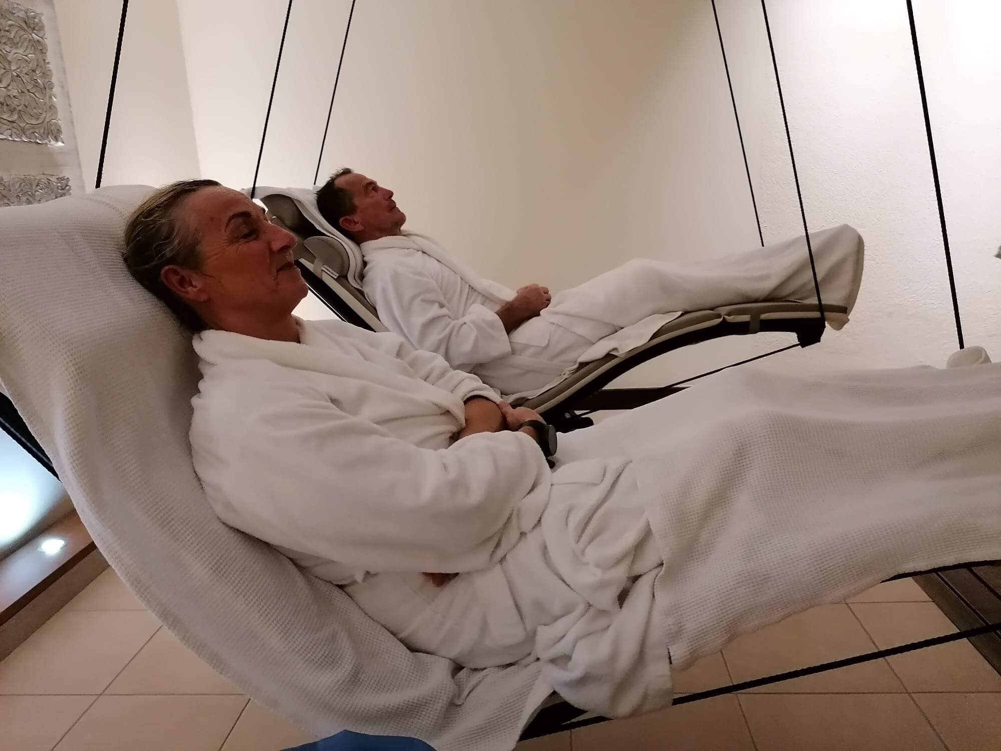 Nach dem Spiel sitzen wir in geselliger Runde in der Sonne zusammen und geniessen die letzten Sonnenstrahlen (sowie Essen und Wein). Am Ende sind noch Josef und ich übrig. Durchgefroren gehe ich in die Sauna und ruhe dann für eine Weile auf der Liebesschaukel.