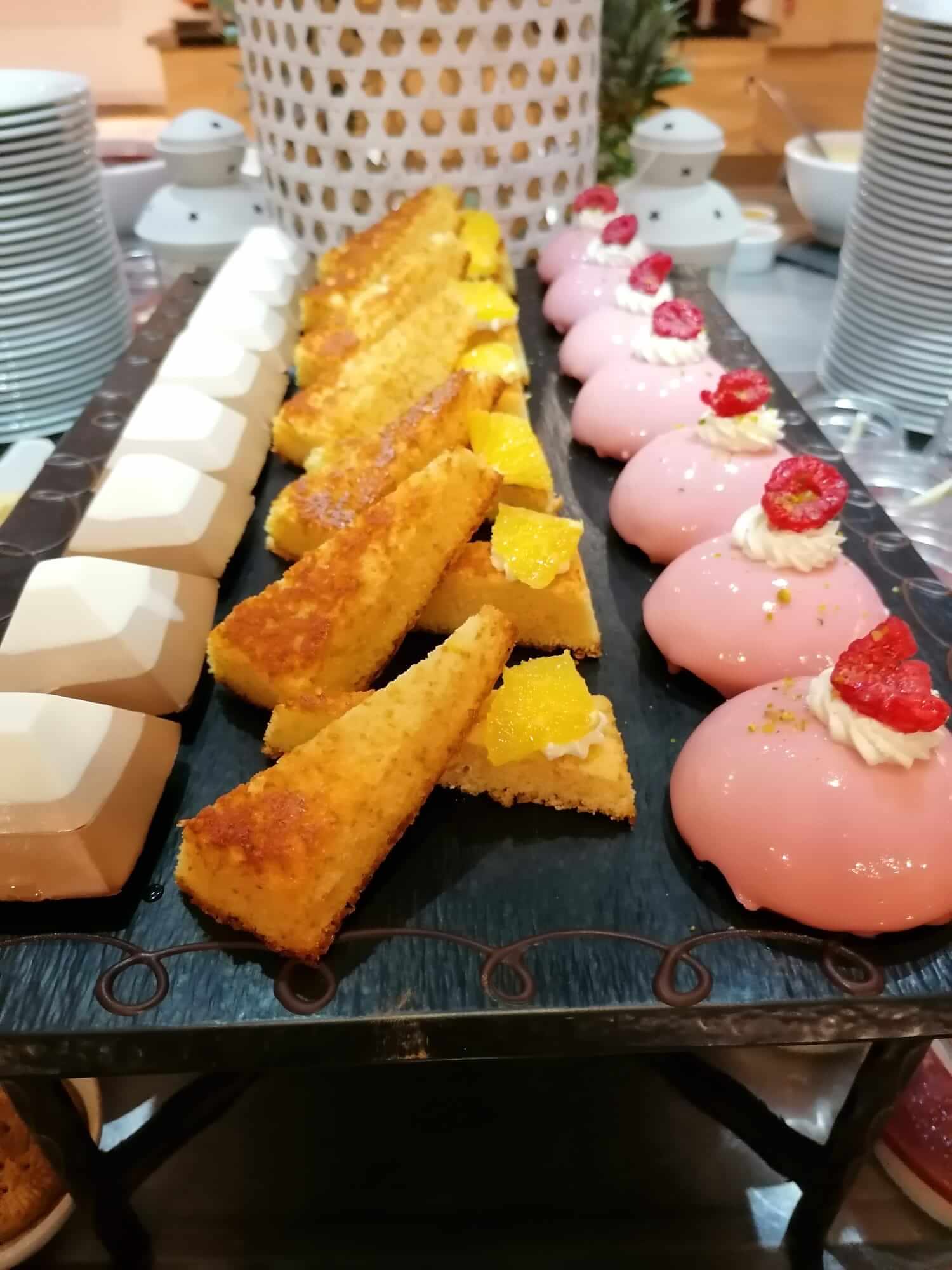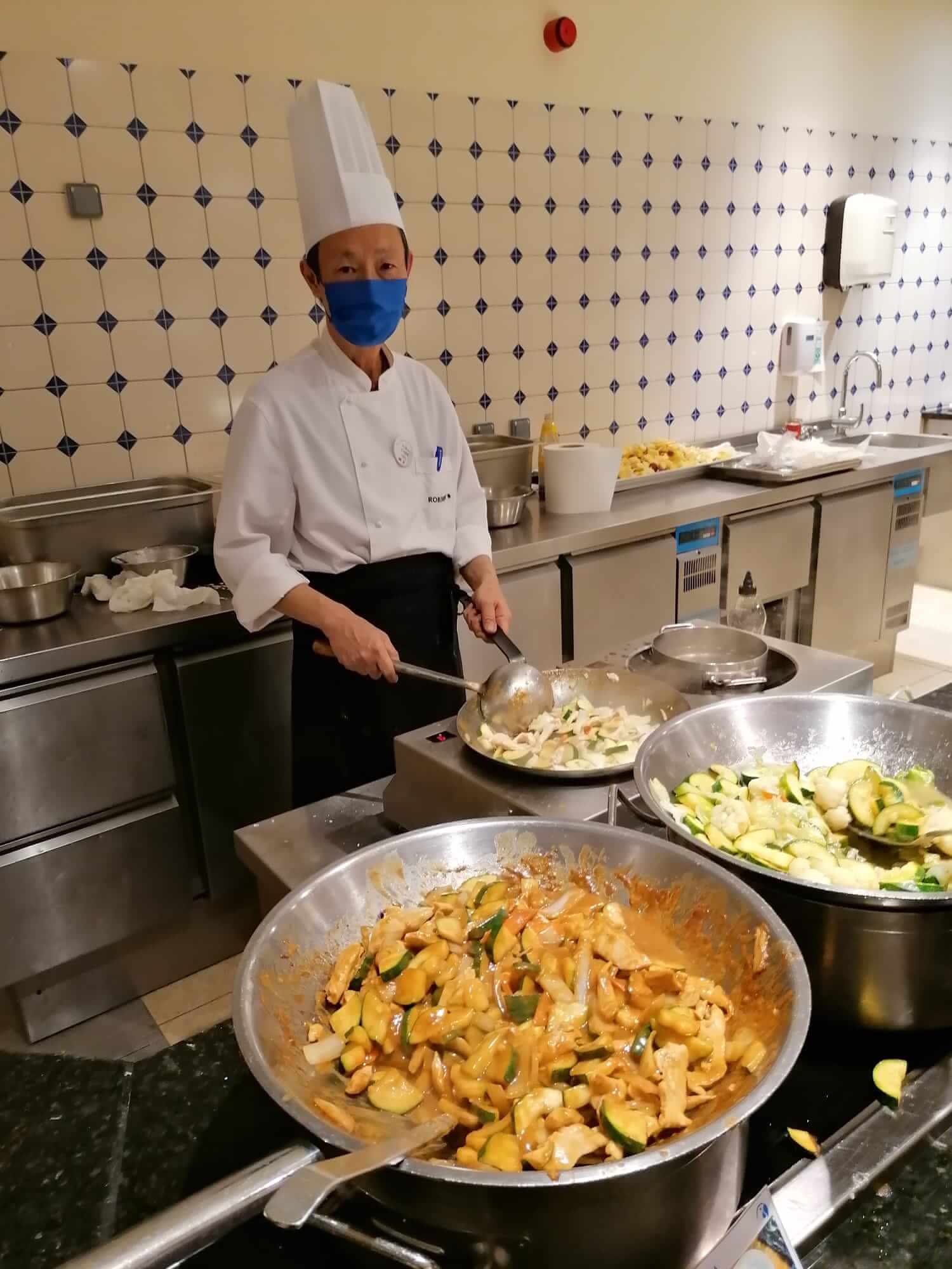 Wenn man den Buffetbereich betritt, wird man am Eingang von einer Person mit Sprühflasche empfangen. Man bekommt dann einen schwachen Sprühstoss Desinfektionsmittel auf eine Stelle eigener Wahl und darf dann erst weitergehen. Das findet allerdings nur beim Mittag- und Abendessen statt. Zum Frühstück wird man nicht desinfiziert. Am Buffet und in den Speisebereichen sind Pfeile für die Laufrichtung am Boden aufgebracht. Das blickt aber niemand und so hält sich keiner daran.