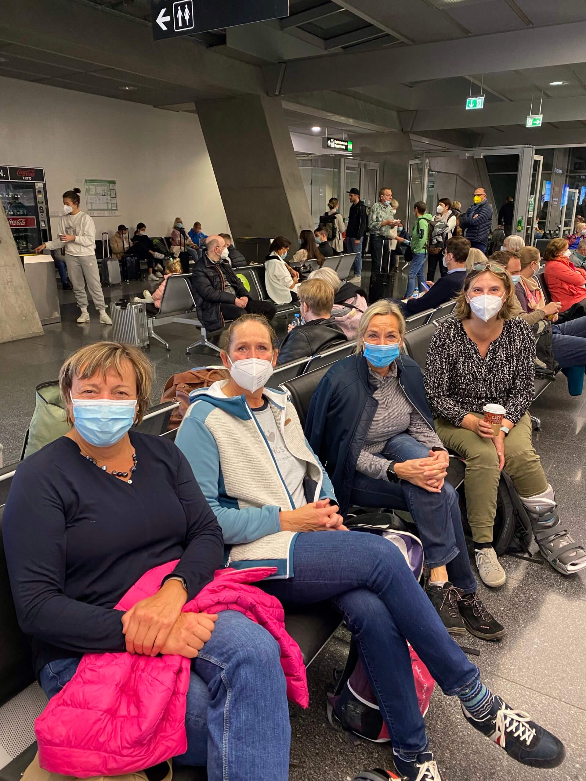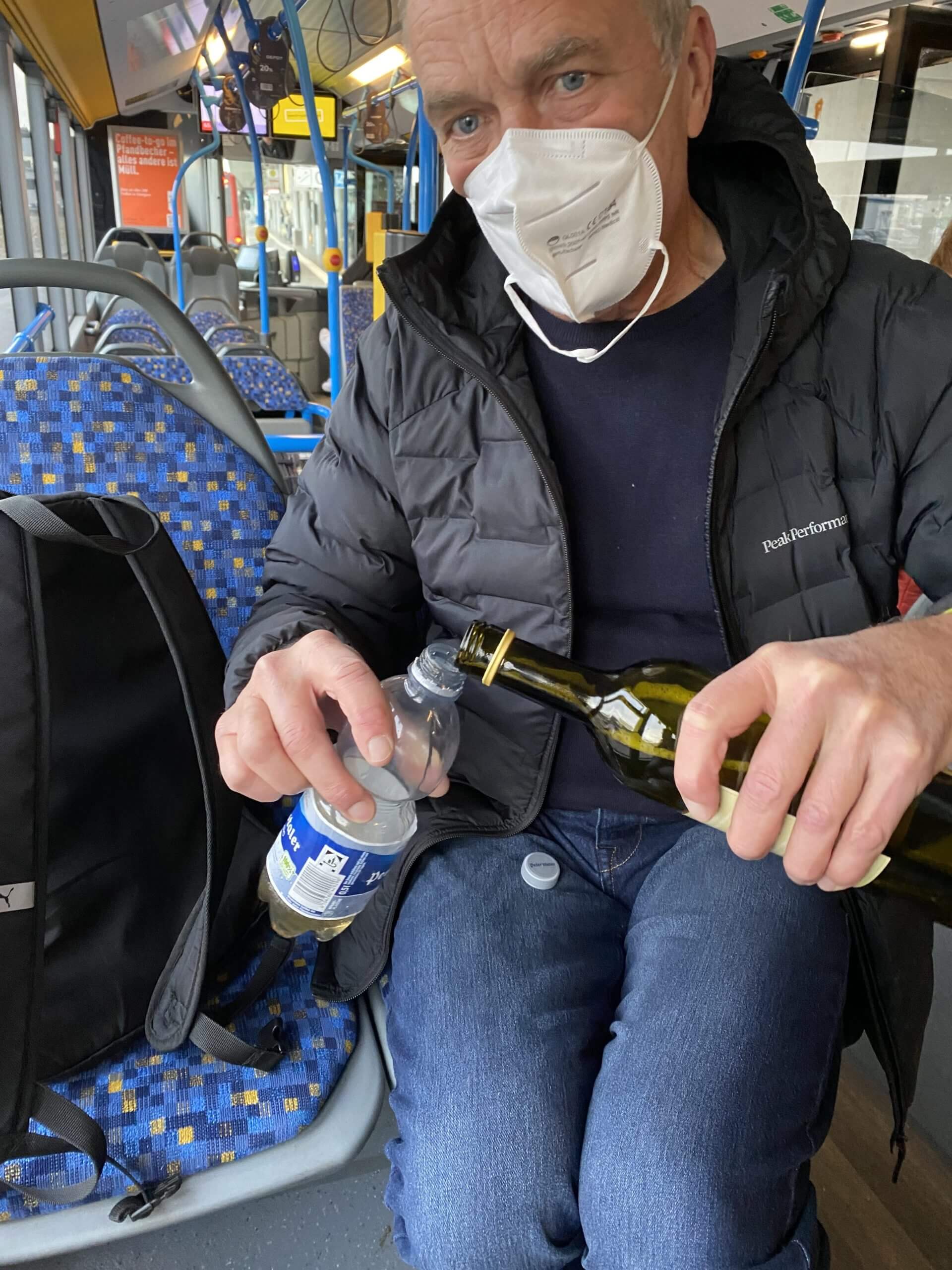 Wir verabschieden uns von unseren Mitreisenden und begeben uns zur Bushaltestelle. Ohne lange Wartezeit können wir wenig später den Bus besteigen und Rolf öffnet die mitgebrachte Weinflasche. Da werden wir gleich ganz böse von einem schwäbischen Spießer angemacht, weil wir zum Trinken kurz unseren Gesichtslappen lüften müssen. Wir informieren den guten Mann, dass man im Flugzeug zum Trinken auch den Lappen entfernen darf und bieten ihm an, unseren Impfausweis zu zeigen. Da gibt er Ruhe.