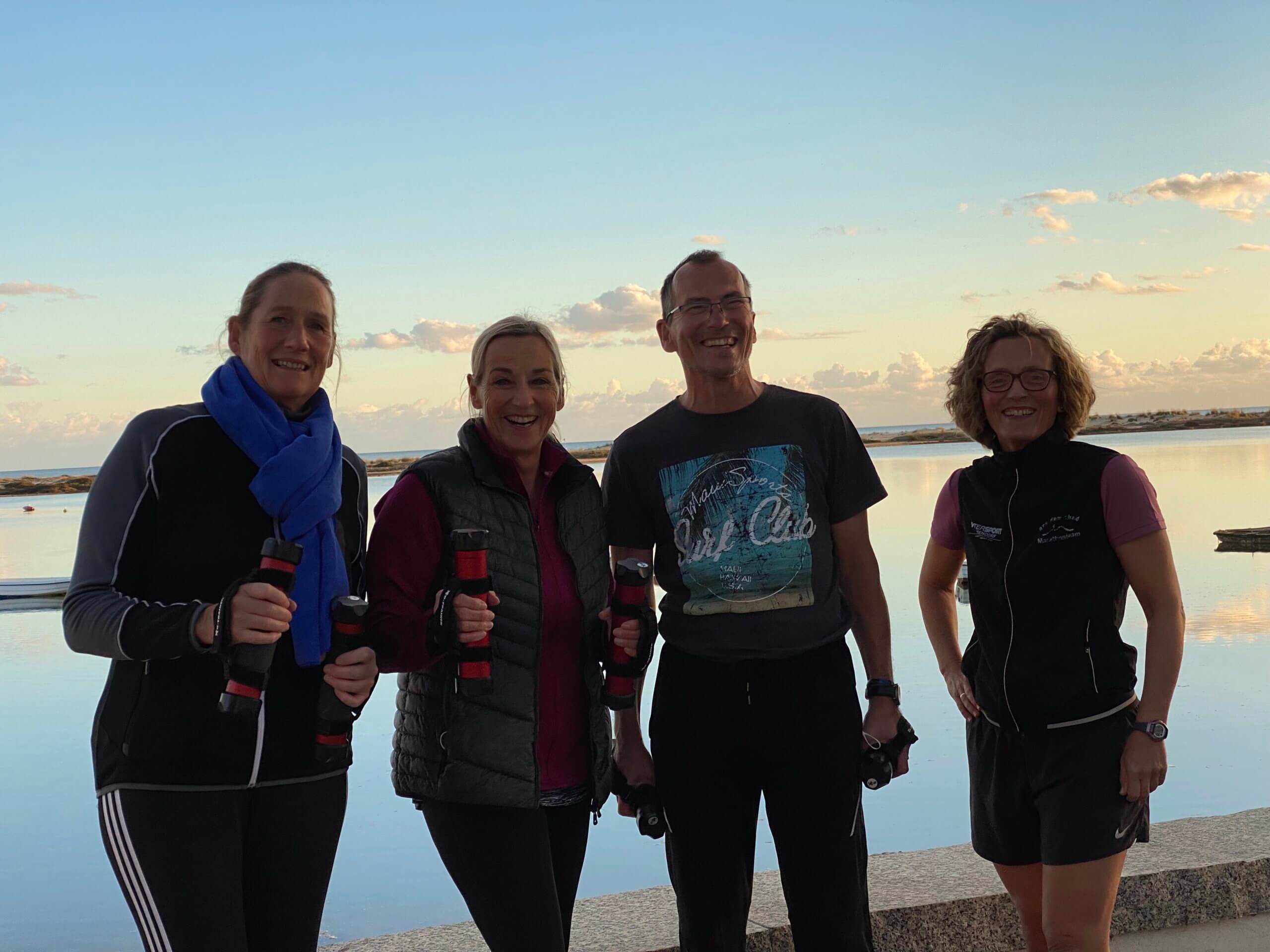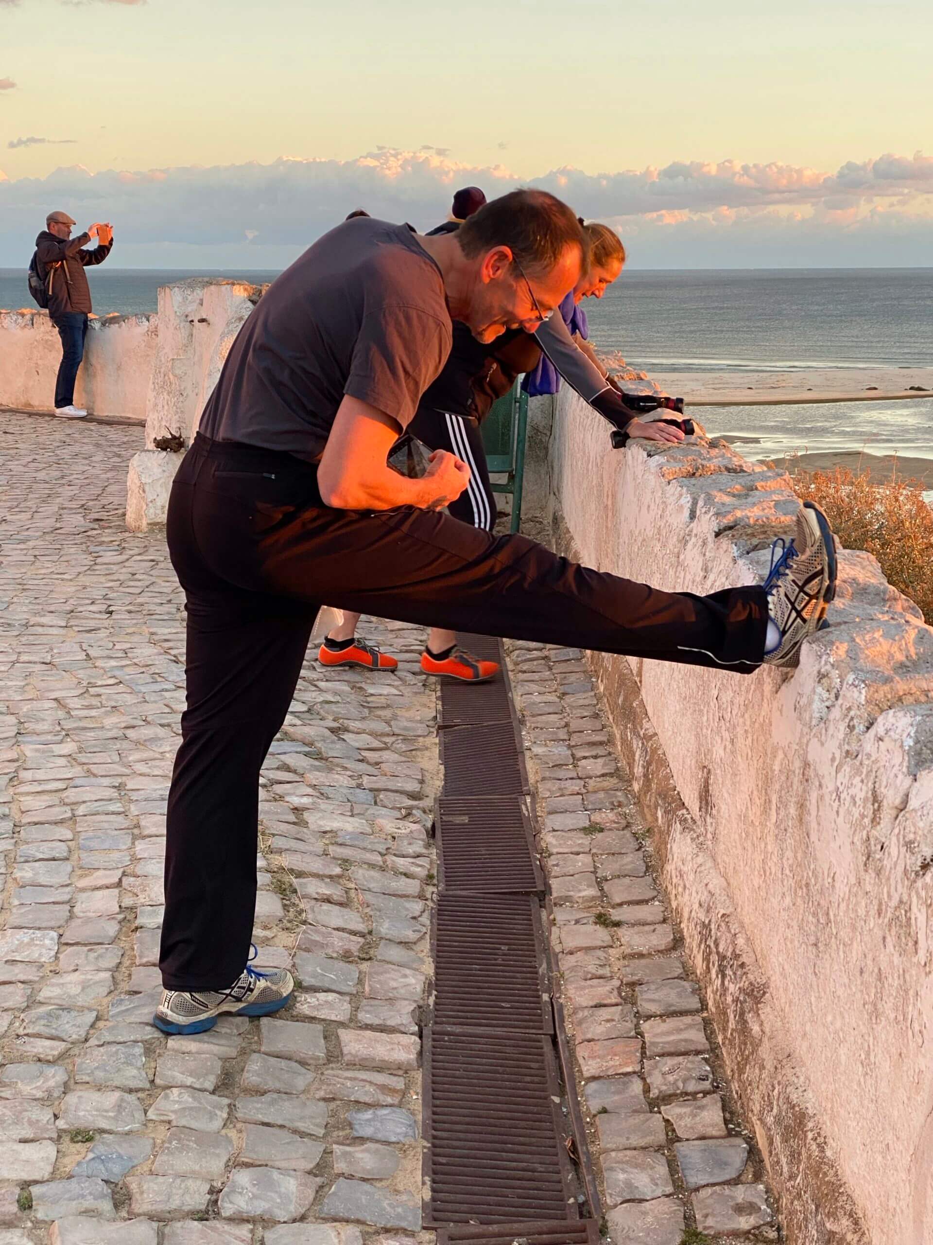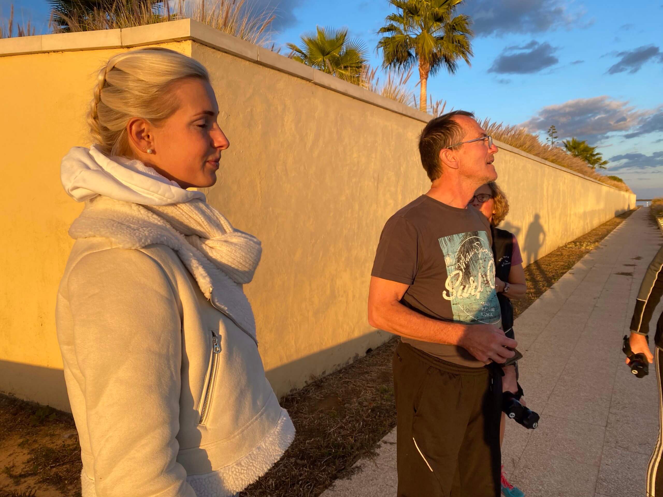 Die geplante Fahrt mit dem Solarboot treten wir nicht an, weil es inzwischen wolkig und kalt ist. Statt dessen besuchen wir mit Josef den XBC-Kurs (oder so ähnlich). Wir hatten ein leichtes Cardiotraining erwartet. Tatsächlich aber walken wir mit Gewichten in den Händen bis zum nächsten Dorf und über den Strand. Super, denke ich mir… da laufe ich vier Stunden über den Golfplatz und gehe dann noch walken… Immerhin werden wir mit einem traumhaften Sonnenuntergang über dem Meer belohnt.