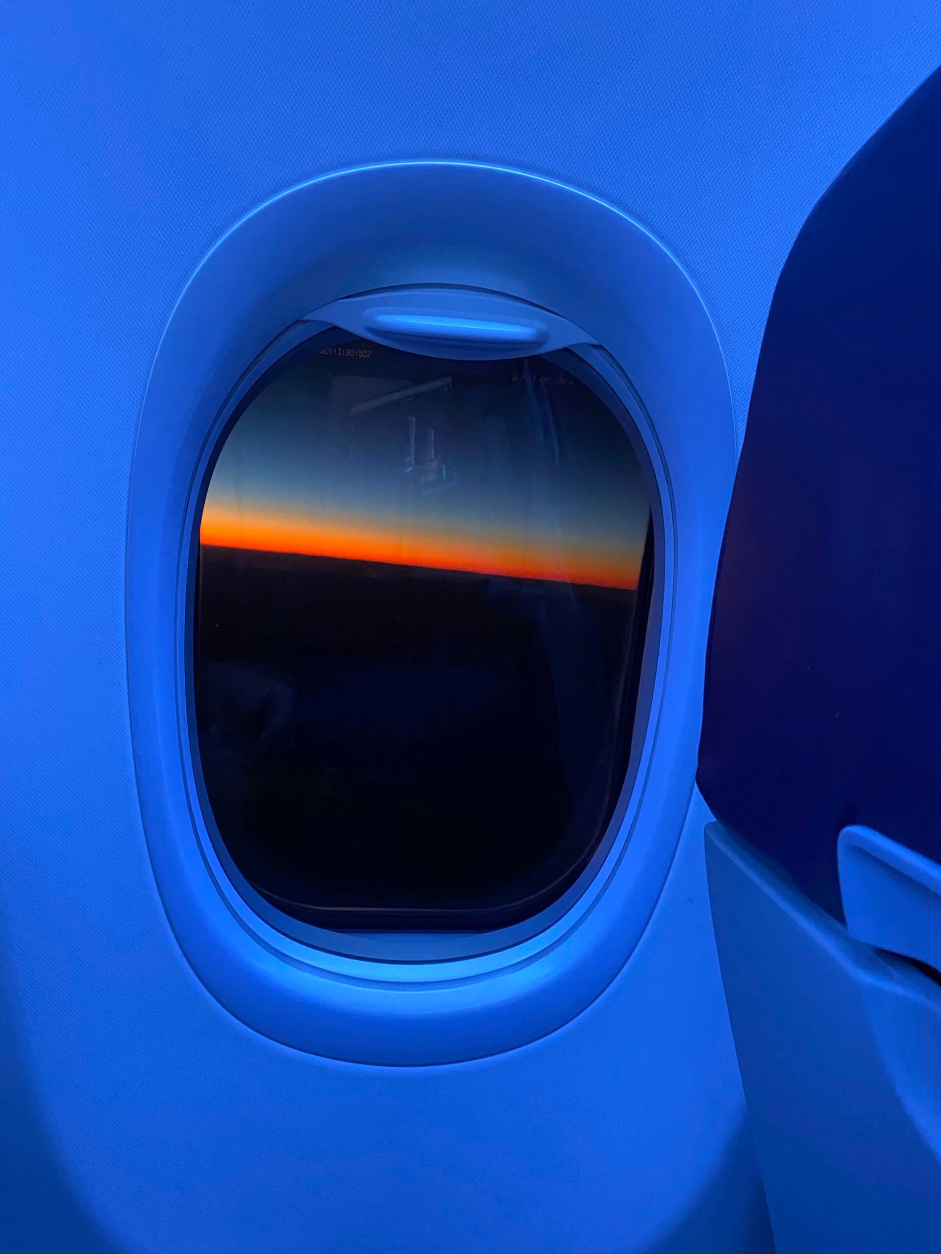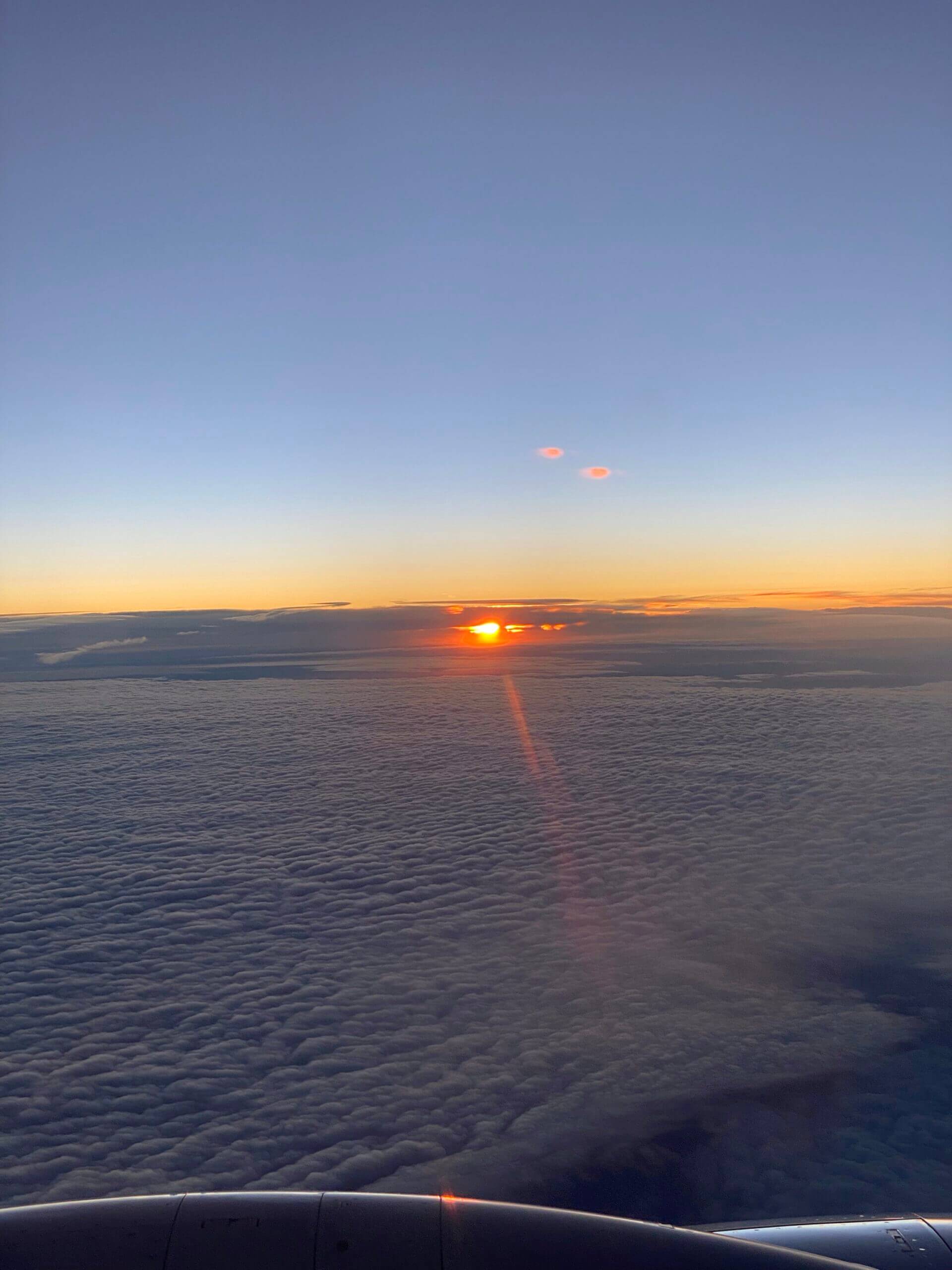 Wir starten fast pünktlich (enteisen) und dürfen auf der linken Seite den Sonnenaufgang bewundern. Wir sitzen rechts 🤪