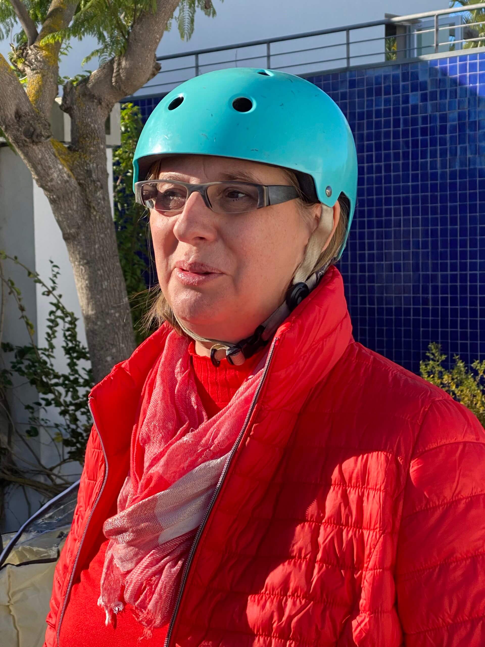 Christina und ich sind ganz vorne in Sachen Hygiene und tragen unter dem Leihhelm einen Buff. Mit Helm sieht man ohnehin blöd aus. Da kann man auch unter dem Helm blöd aussehen.
