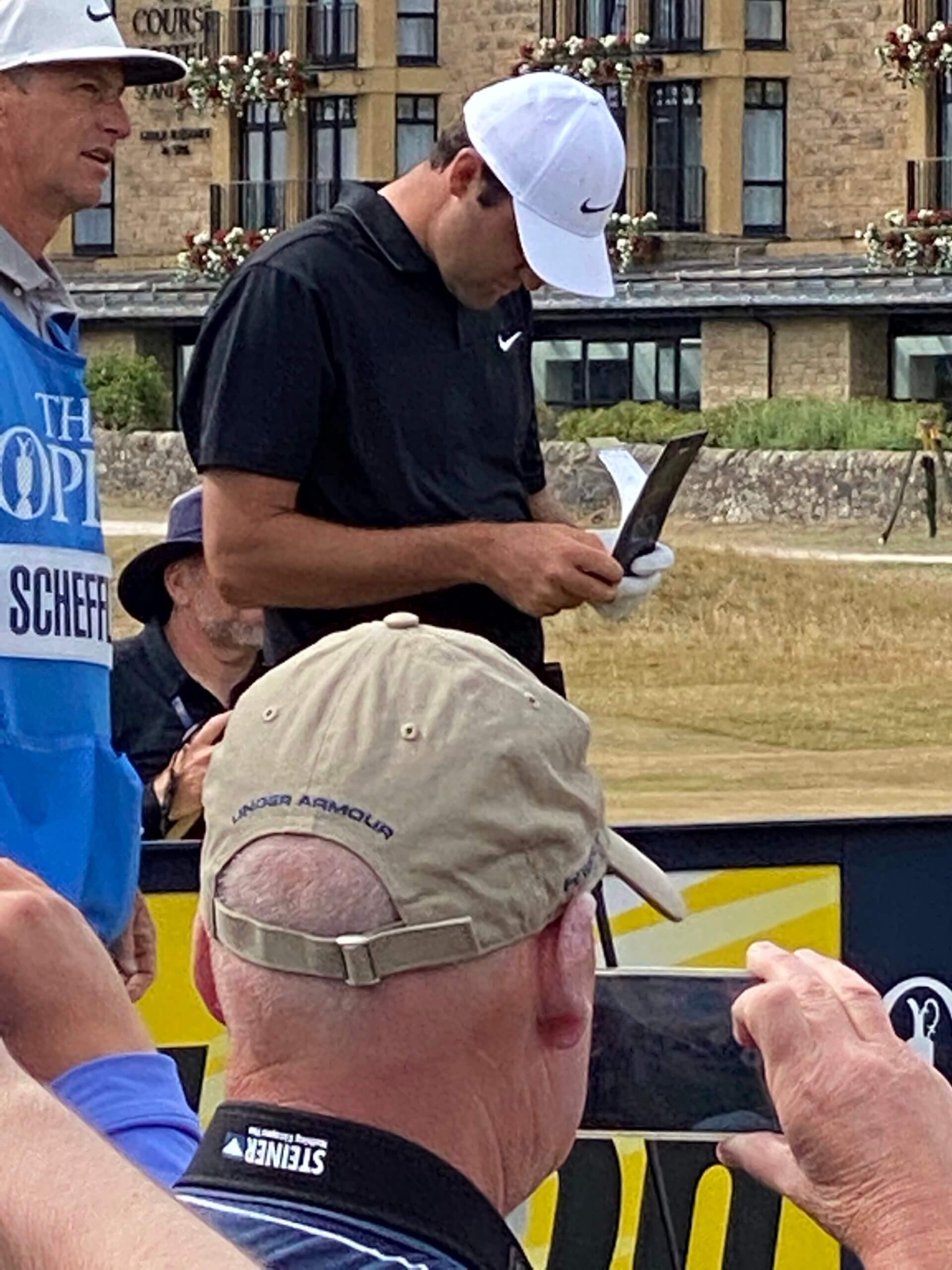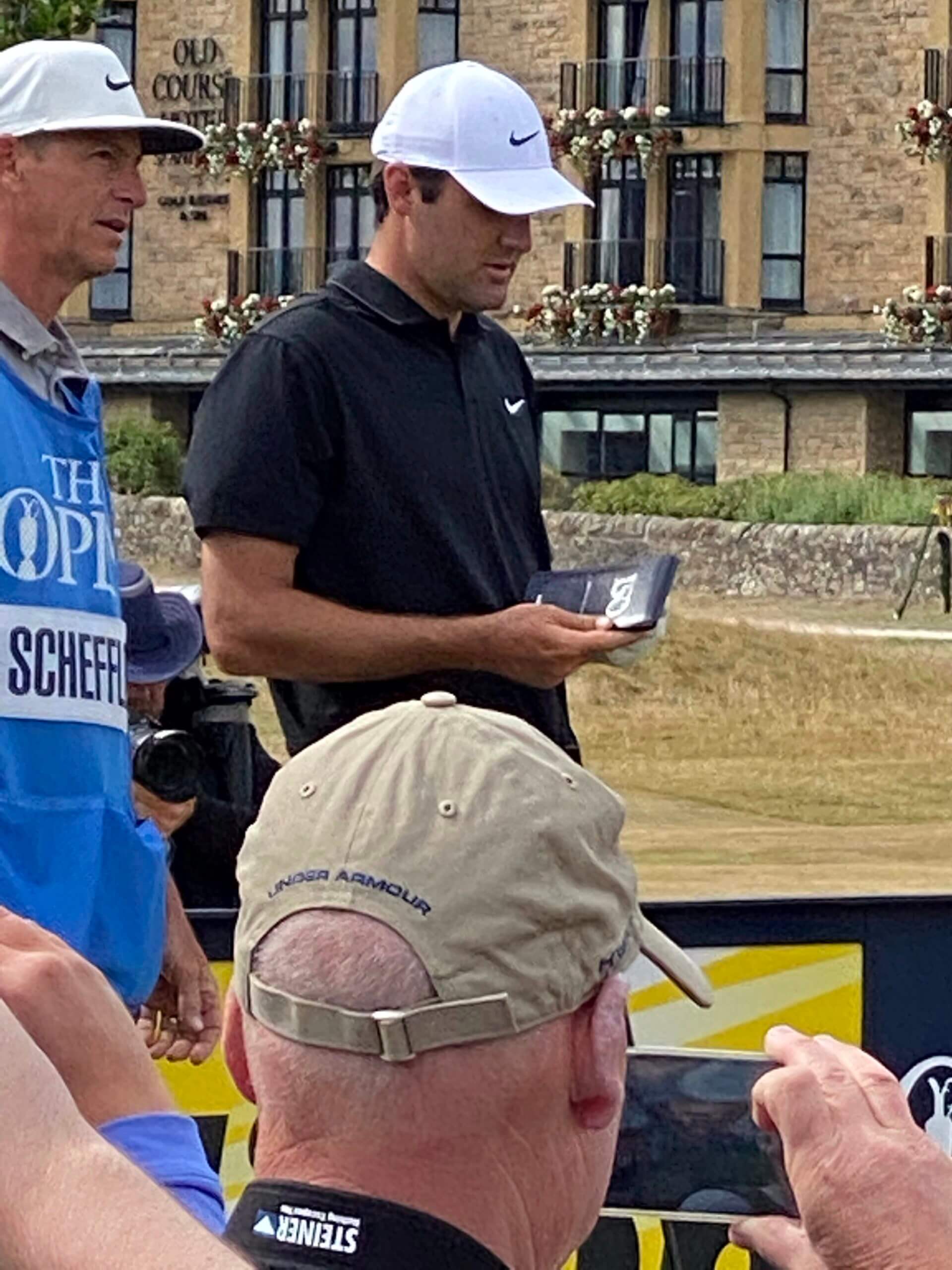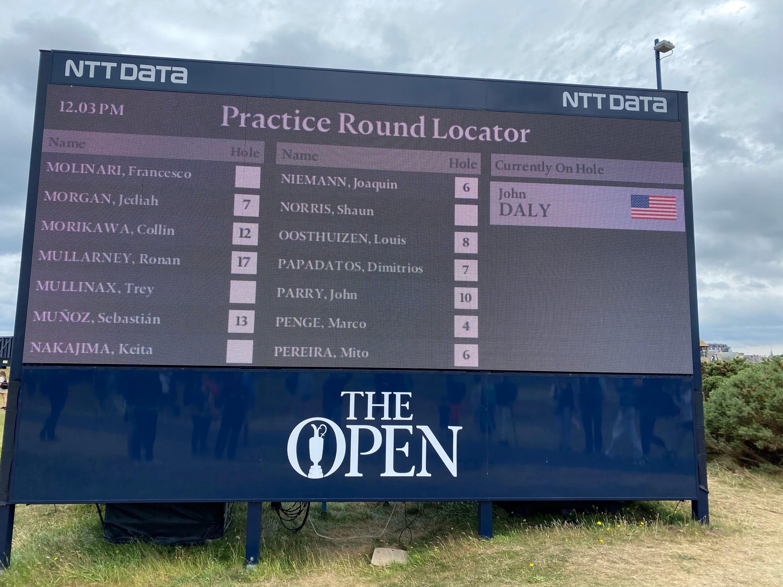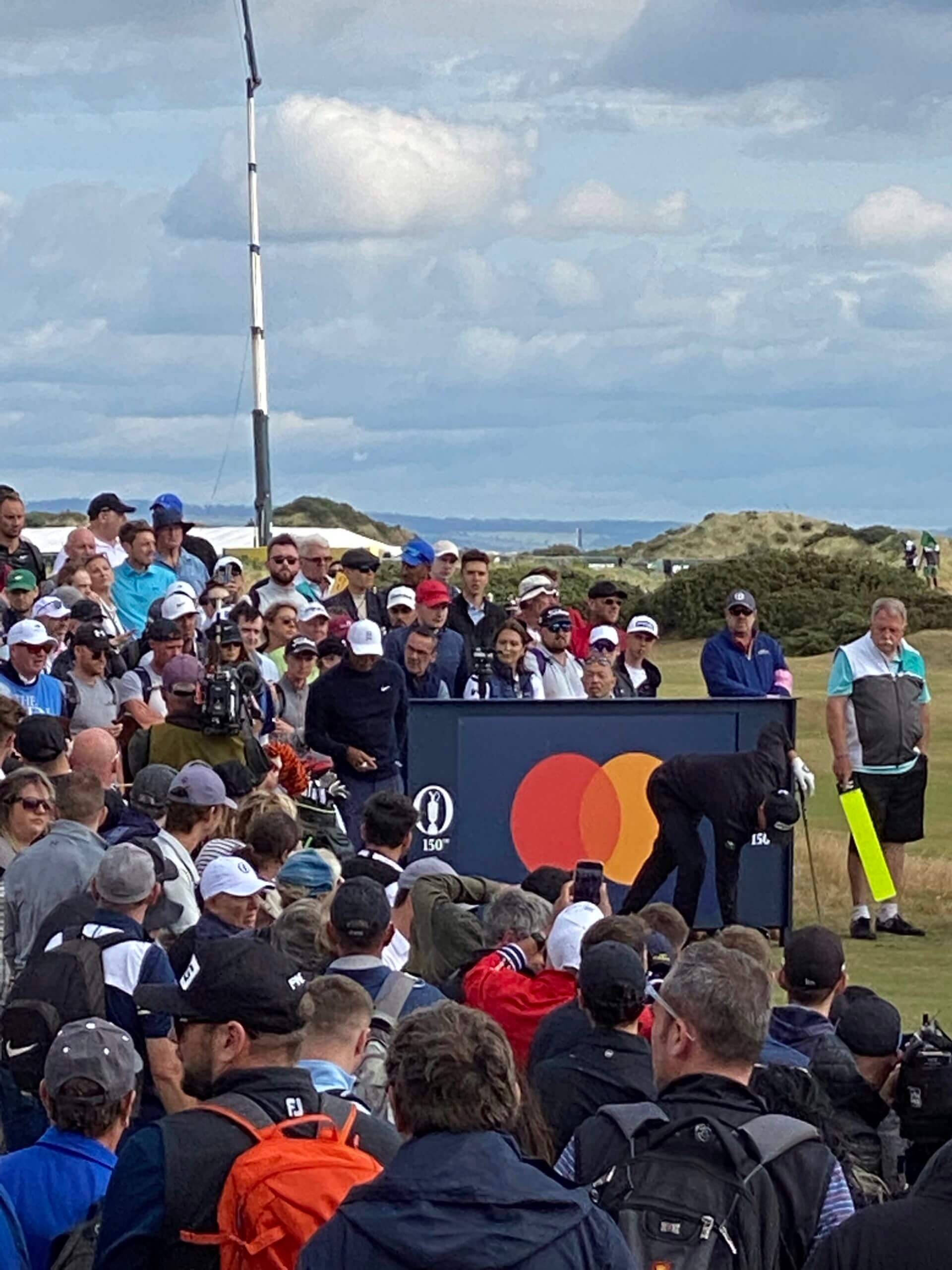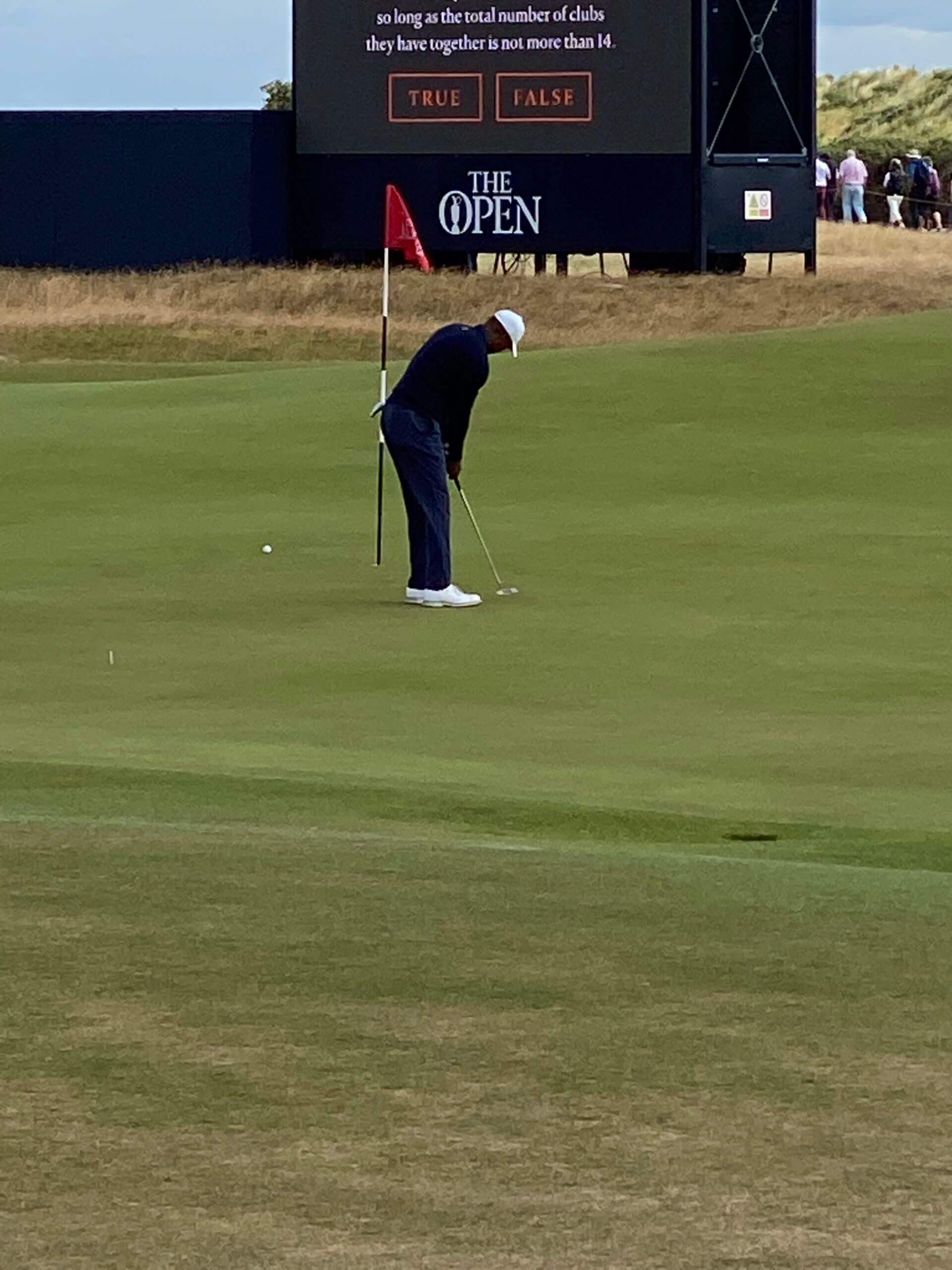 Dann orientieren wir uns auf dem Platz. Es gibt Anzeigeboards, die zeigen wer gerade auf welcher Bahn trainiert. Gleich zu Beginn finden wir Tiger. Da sind natürlich die größten Menschenmassen. Im Laufe des Tages lassen wir uns treiben, gehen mal zu dieser Bahn, mal zu jener, mal zum Putting Green und zur Driving Range, schließlich umrunden wir auch einmal den ganzen Old Course. Schließlich haben wir fast jeden interessanten Spieler mindestens einmal gesehen.