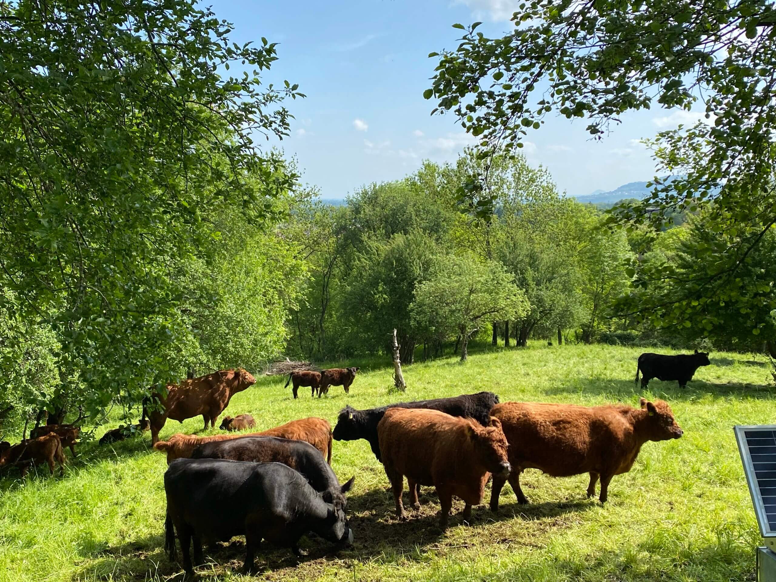 Vorbei an einer Bisonherde (zumindest vermuten wir das) steigen wir durch saftig grüne Natur bergan. Da es ja nun seit Wochen regnet, ist alles herrlich grün. Heute scheint ausnahmsweise die Sonne. Kalt ist es allerdings und auch windig.