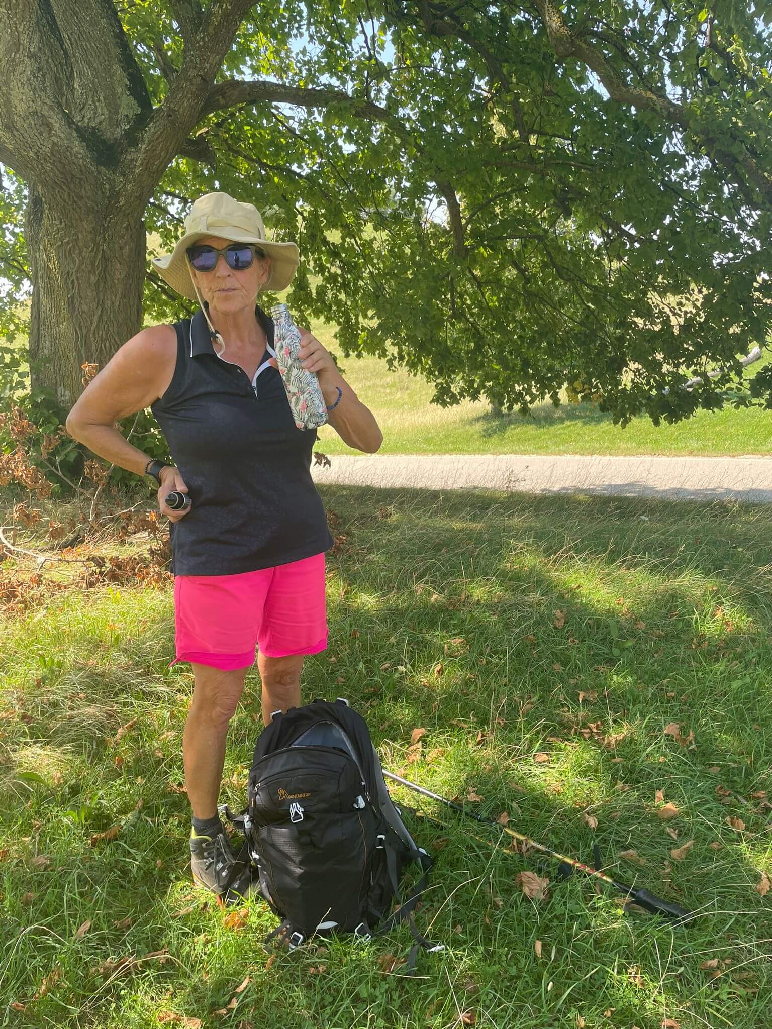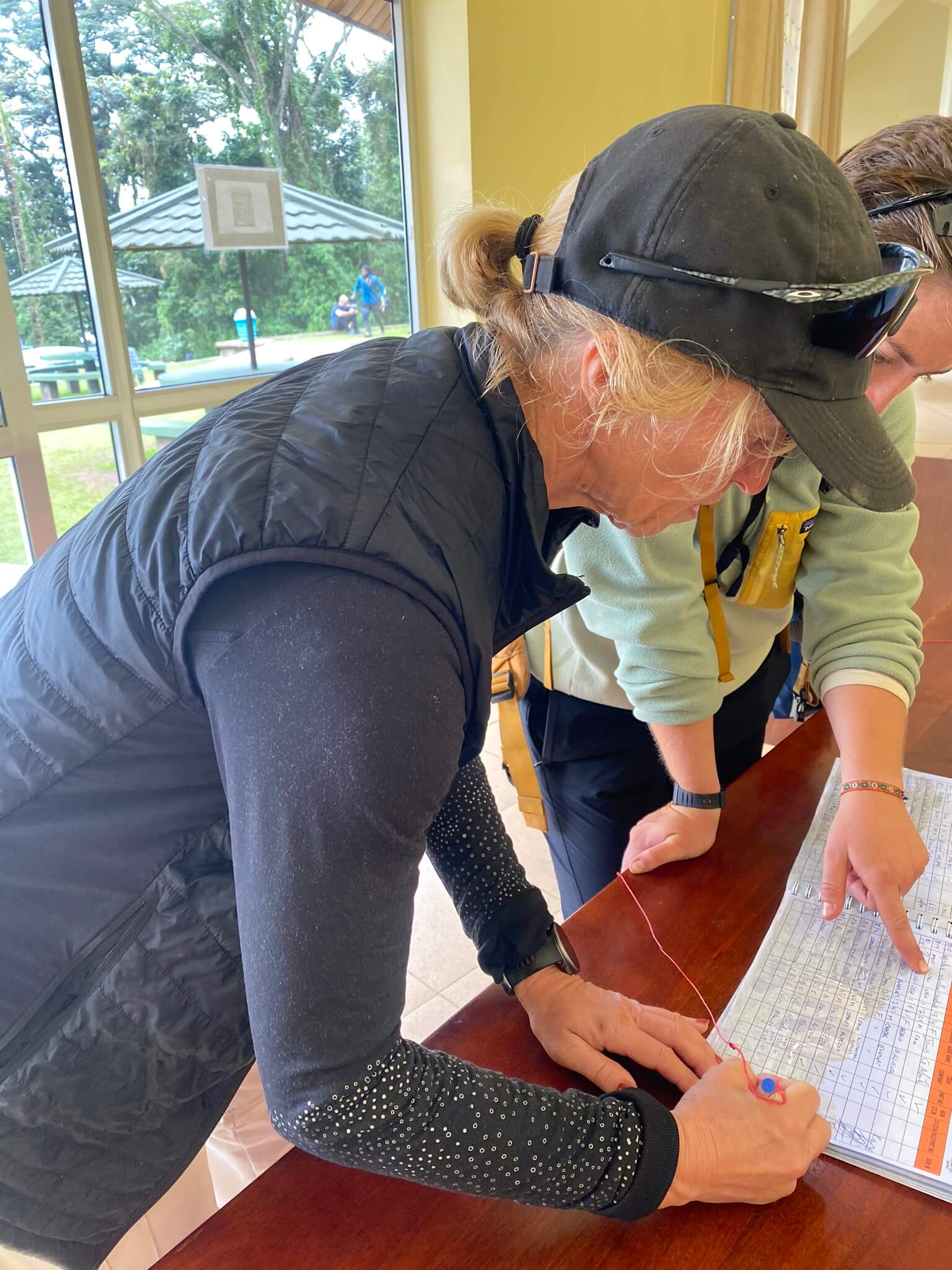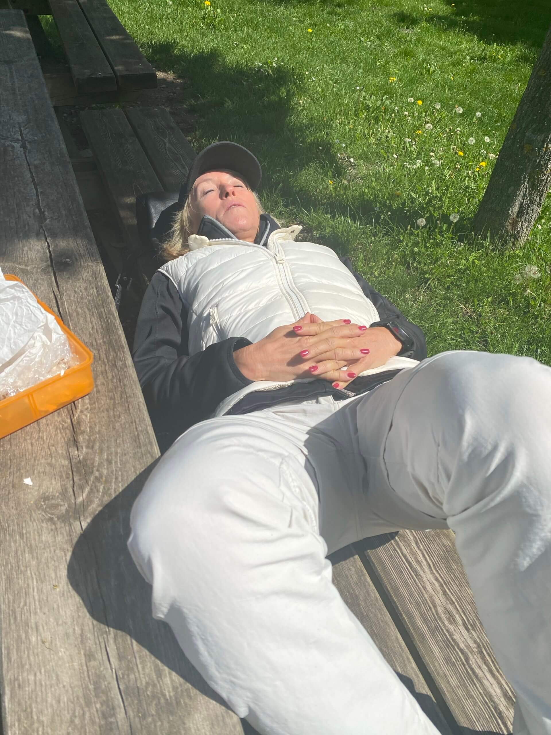 Gegen 13:30 Uhr erreichen wir wieder das Auto und sind sehr stolz auf unsere erste gemeinsame Wanderung. Nun geht es weiter zum Golfplatz, wo wir uns vor der Runde mit Kaffee und Rhabarberkuchen stärken. Auch Coni!