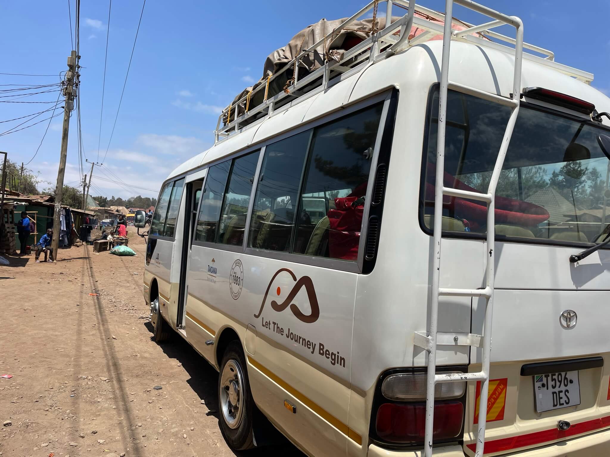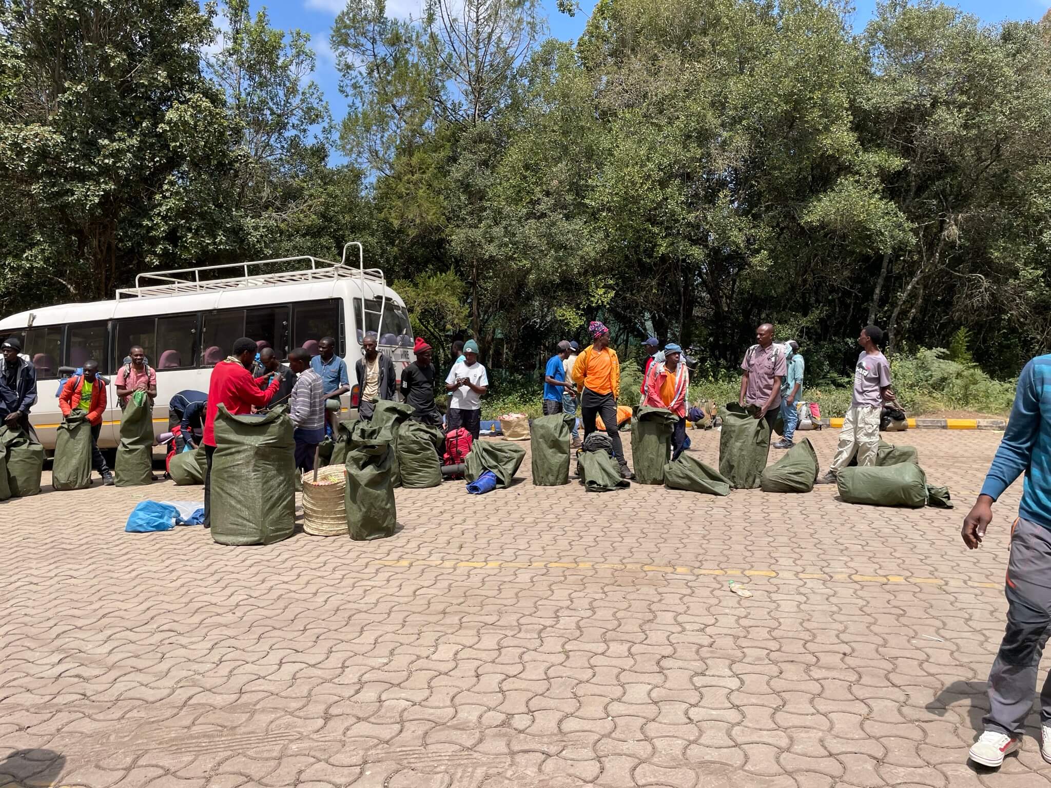 Dann lernen wir unsere Begleitmannschaft kennen und unseren etwas klapprigen Tourbus, der uns zum Rongai Gate bringt. Wir haben eine Begleitmannschaft von sage und schreibe 14 Personen. Im Laufe der Fahrt vergrößert sich die Anzahl noch, denn der Fahrer hält immer mal wieder an, um einen Bekannten auf der Straße aufzusammeln.