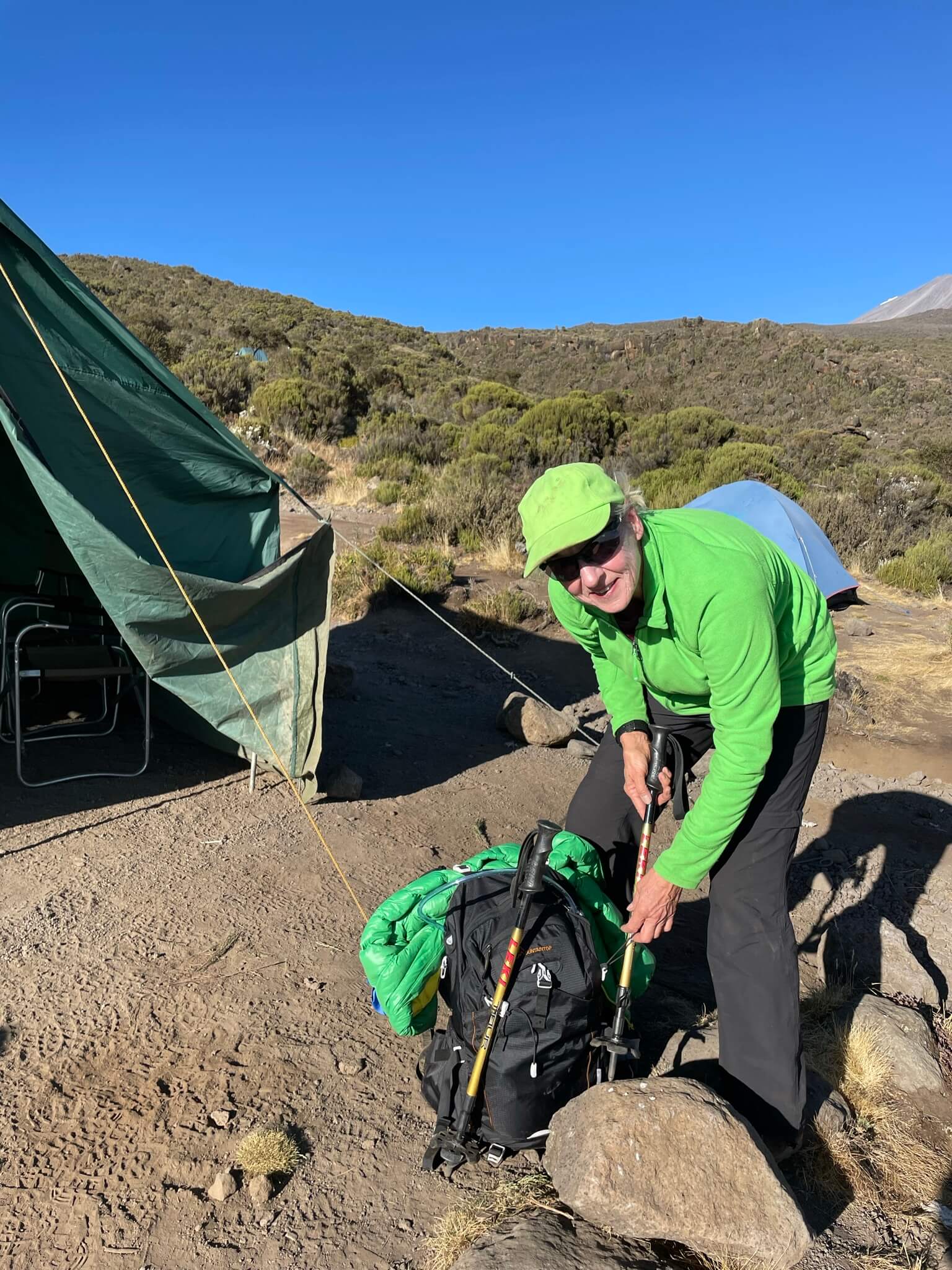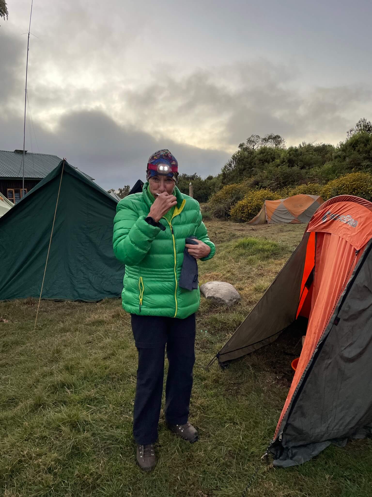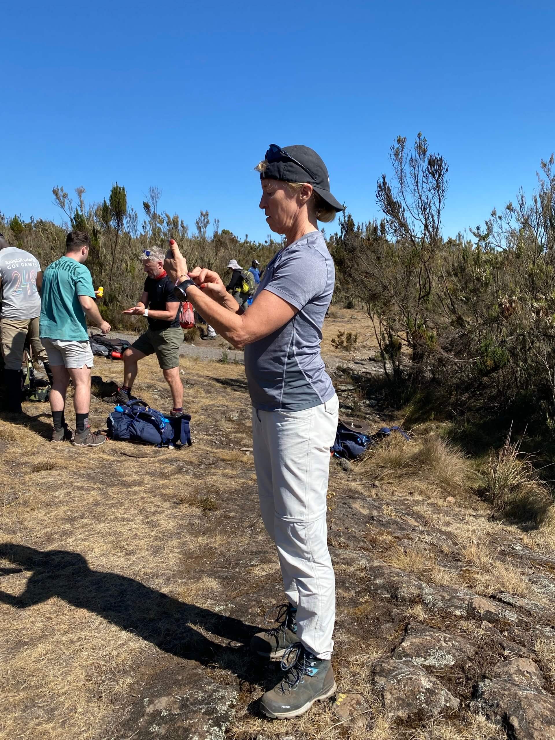 Am späten Nachmittag kommen wir im Kikelelwa-Camp an. John muss nun unsere Sauerstoffsättigung prüfen. Wir sind alle so aufgeregt, dass wir einen viel zu hohen Puls haben. Dafür sind die Sauerstoffsättigungswerte in unserem Blut sehr gut. Bisher weist auch niemand von uns Anzeichen von Höhenkrankheit auf.