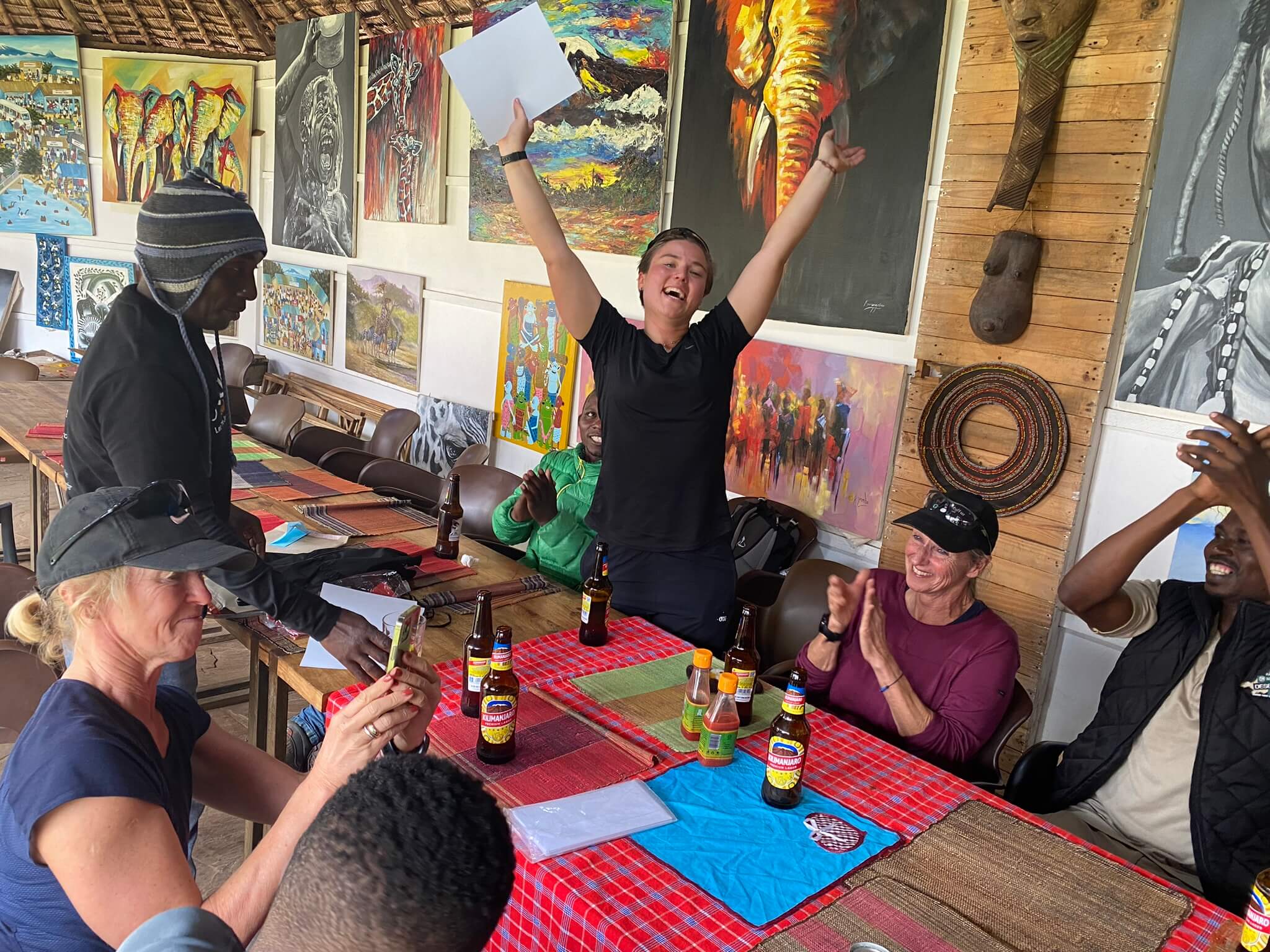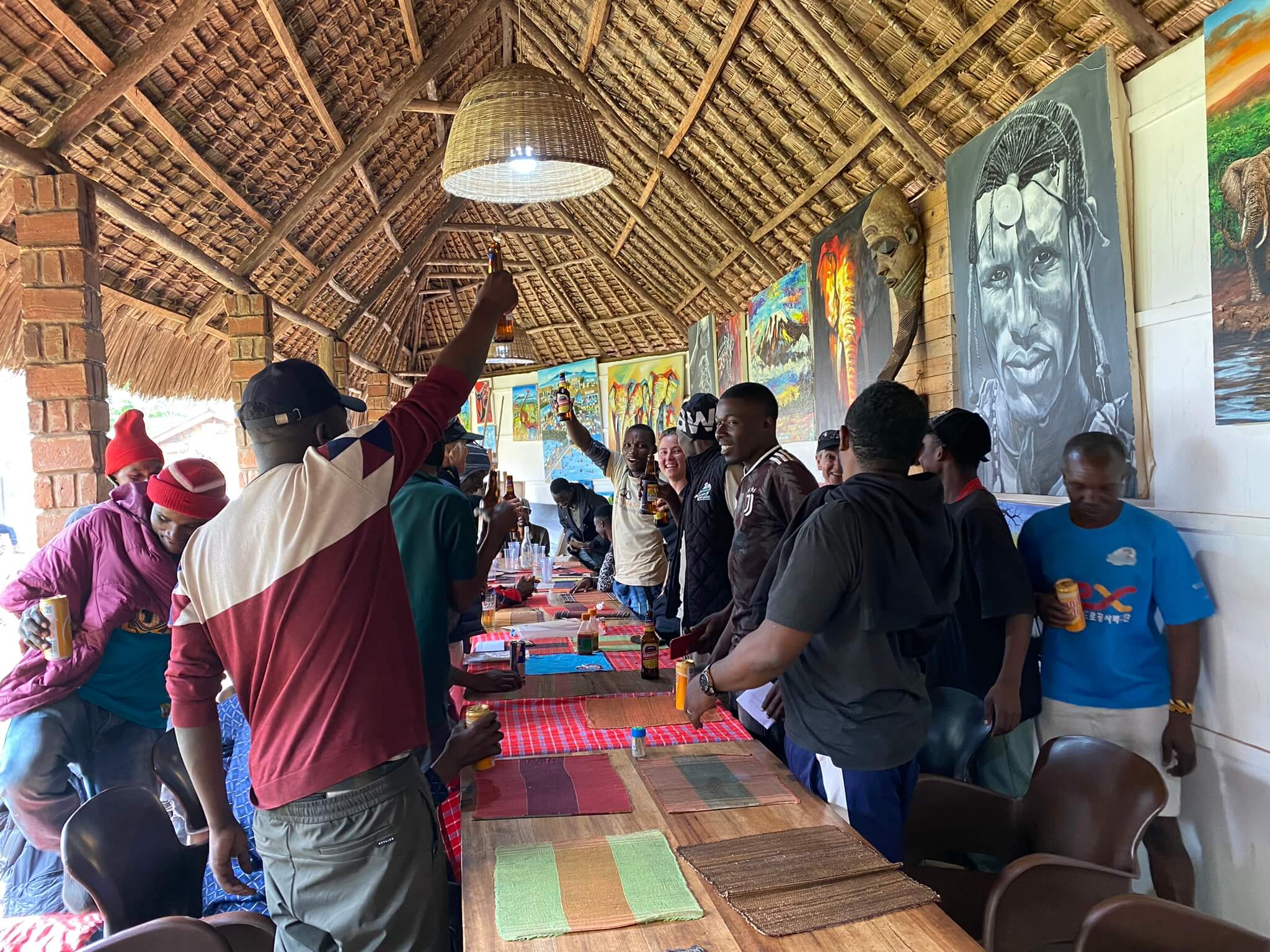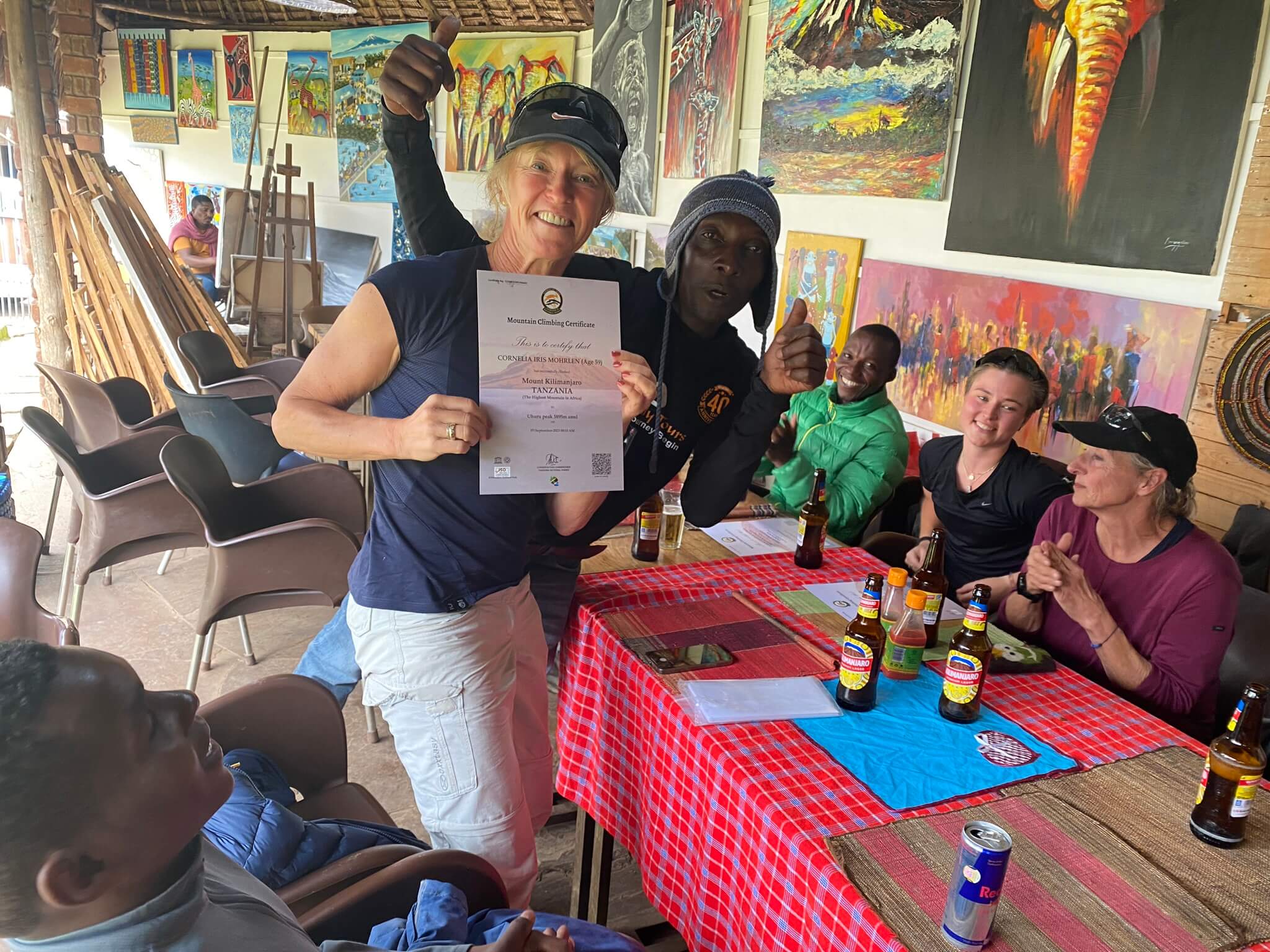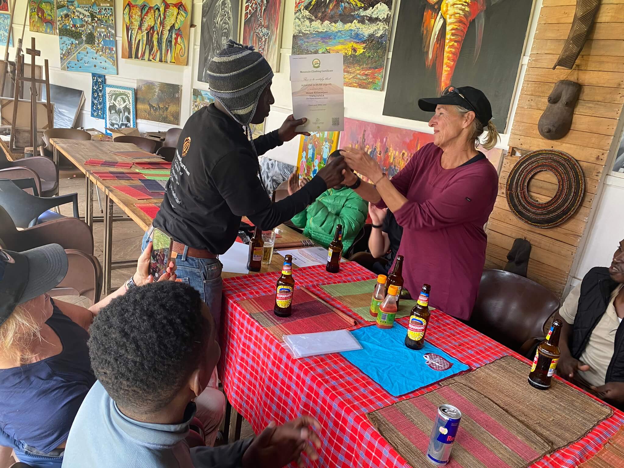 Wir essen zusammen mit Dingi und genießen ein köstliches Kilimanjaro-Bier. Anschließend stößt die gesamte Mannschaft hinzu für die Abschiedsreden, die Trinkgeldübergabe und die Übergabe der Geschenke. Damit sind Artikel gemeint, die wir übrig haben. Und wir bekommen unsere Besteigungszertifikate!