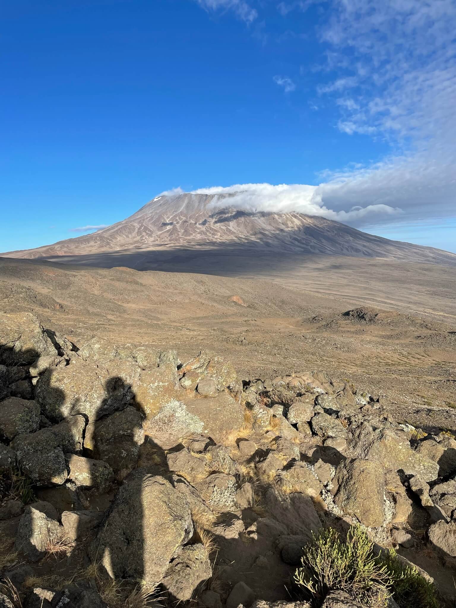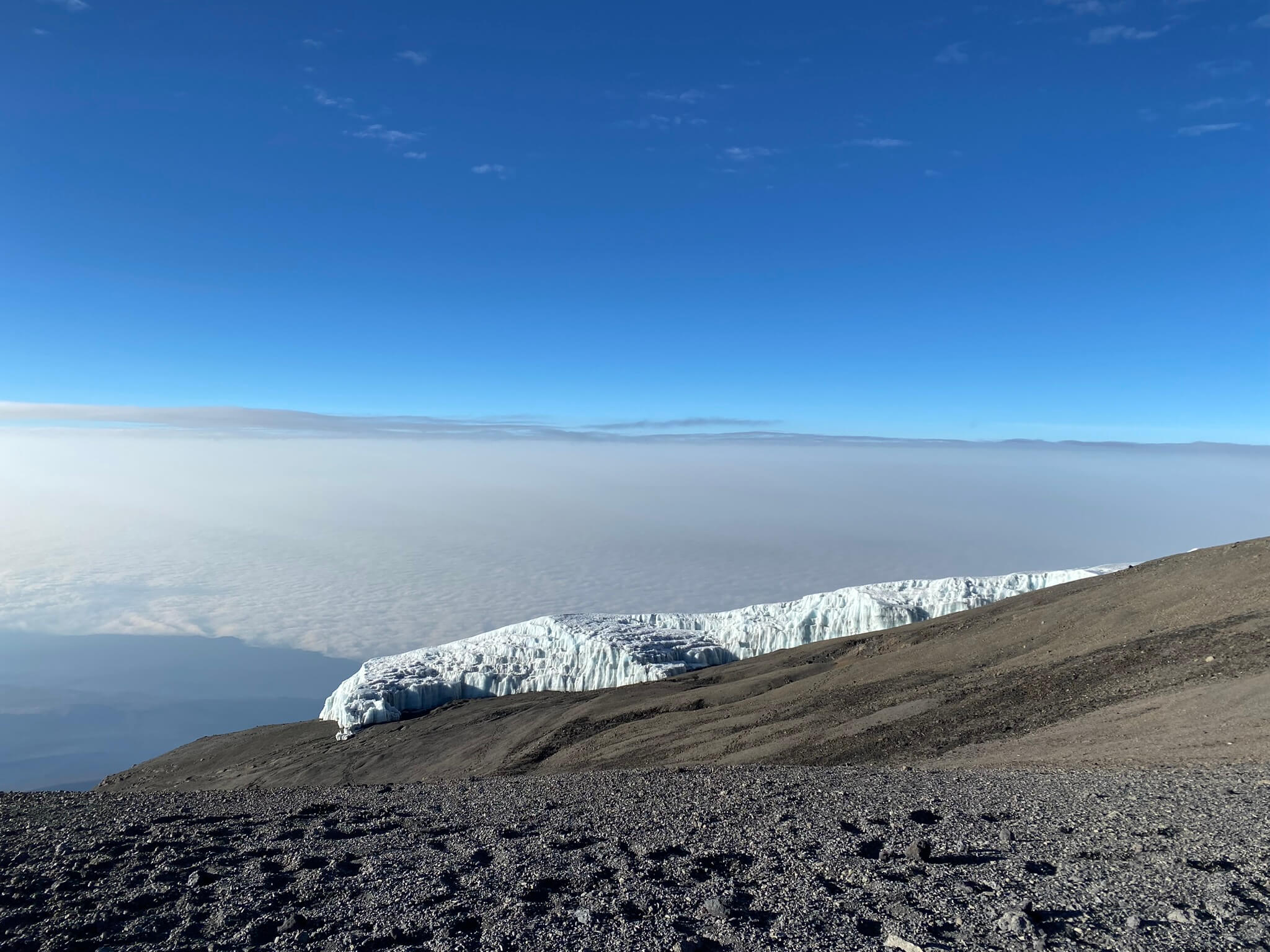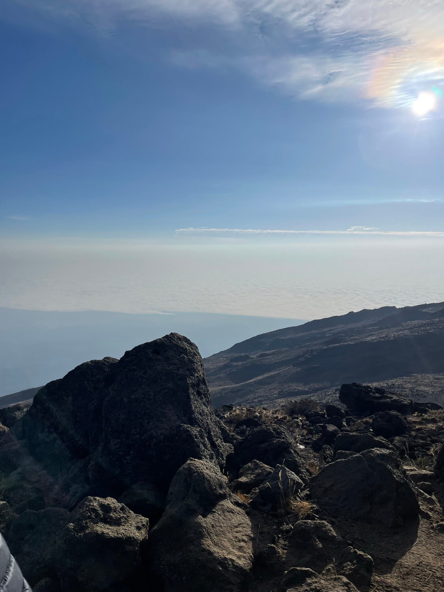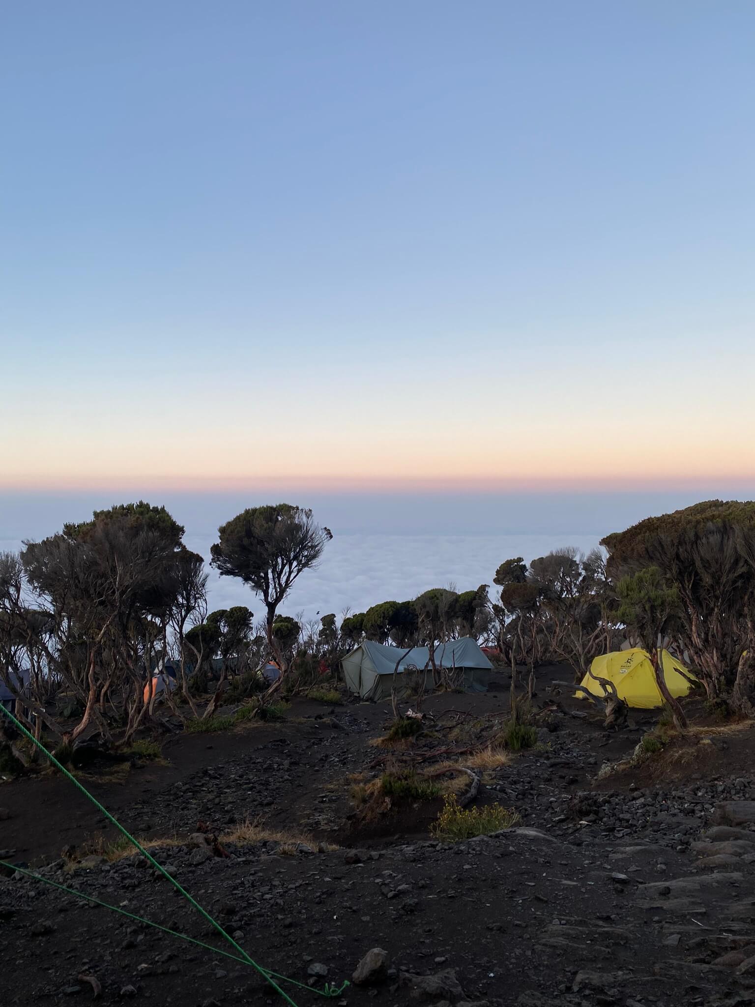 Als ich aus dem Zelt steige, bietet sich mir ein traumhafter Anblick. Wir sind hier auf 3800 m und damit deutlich über dem Wolkenmeer. Und hinter uns liegt der Kibo in der Morgensonne.