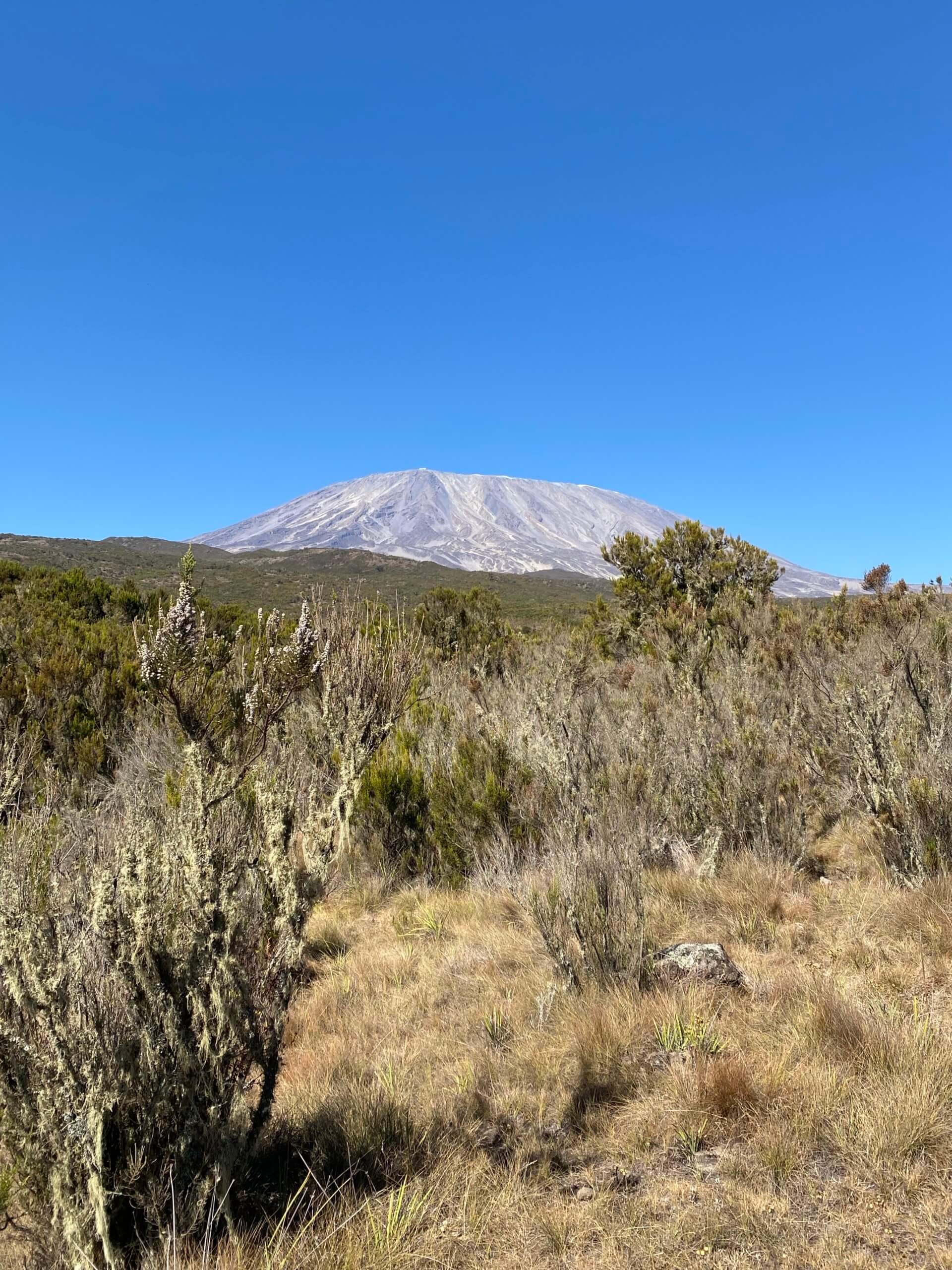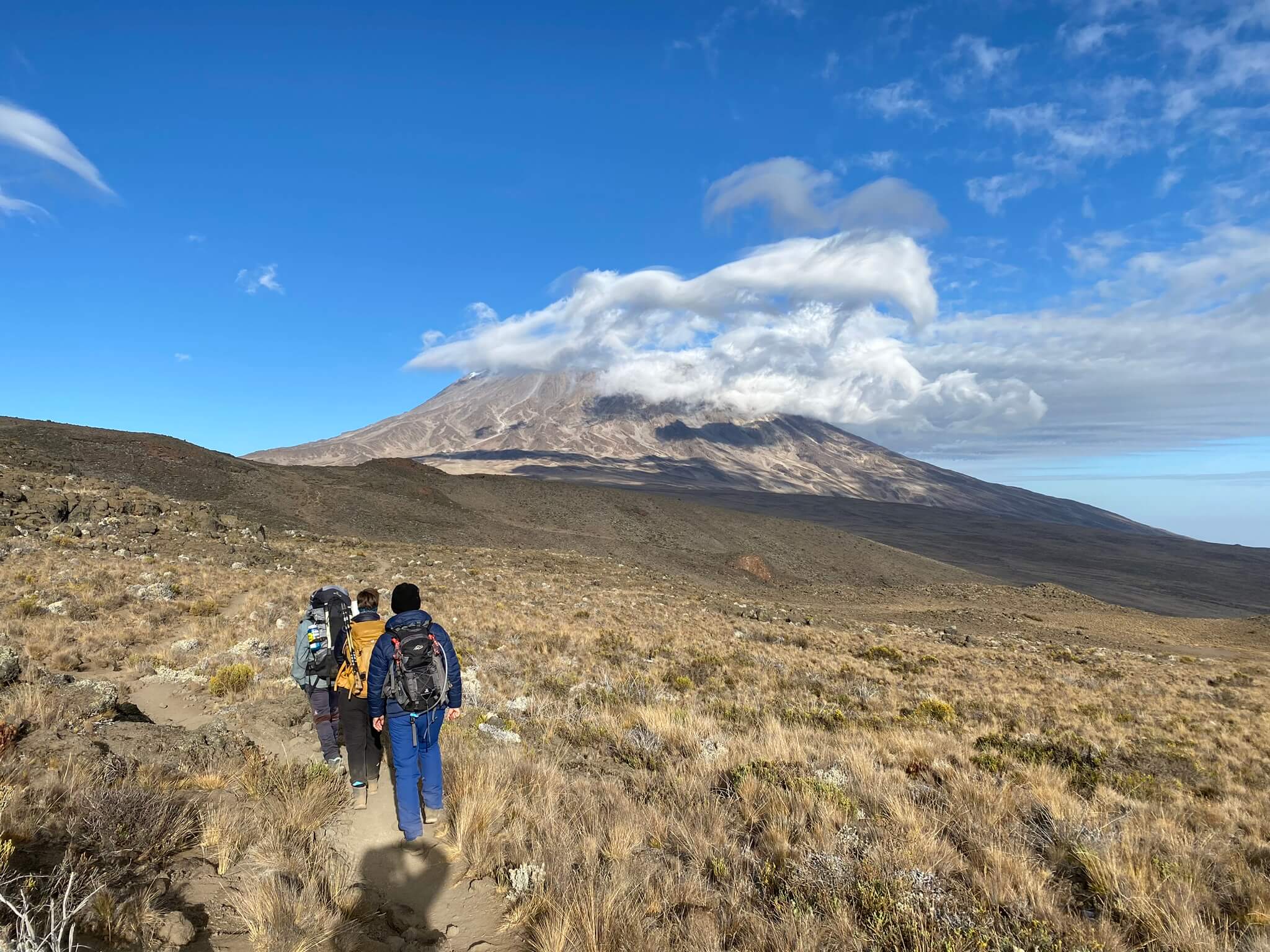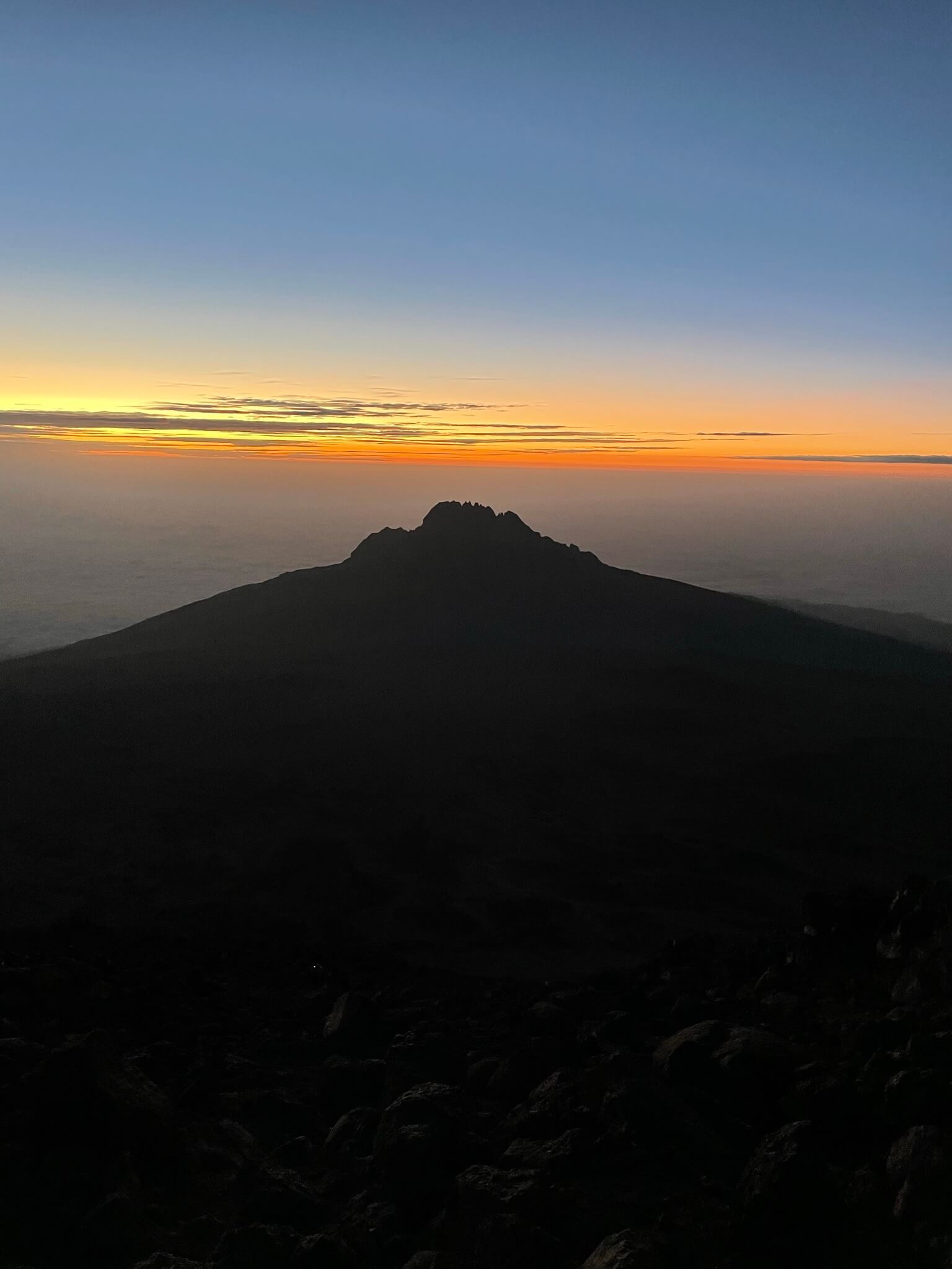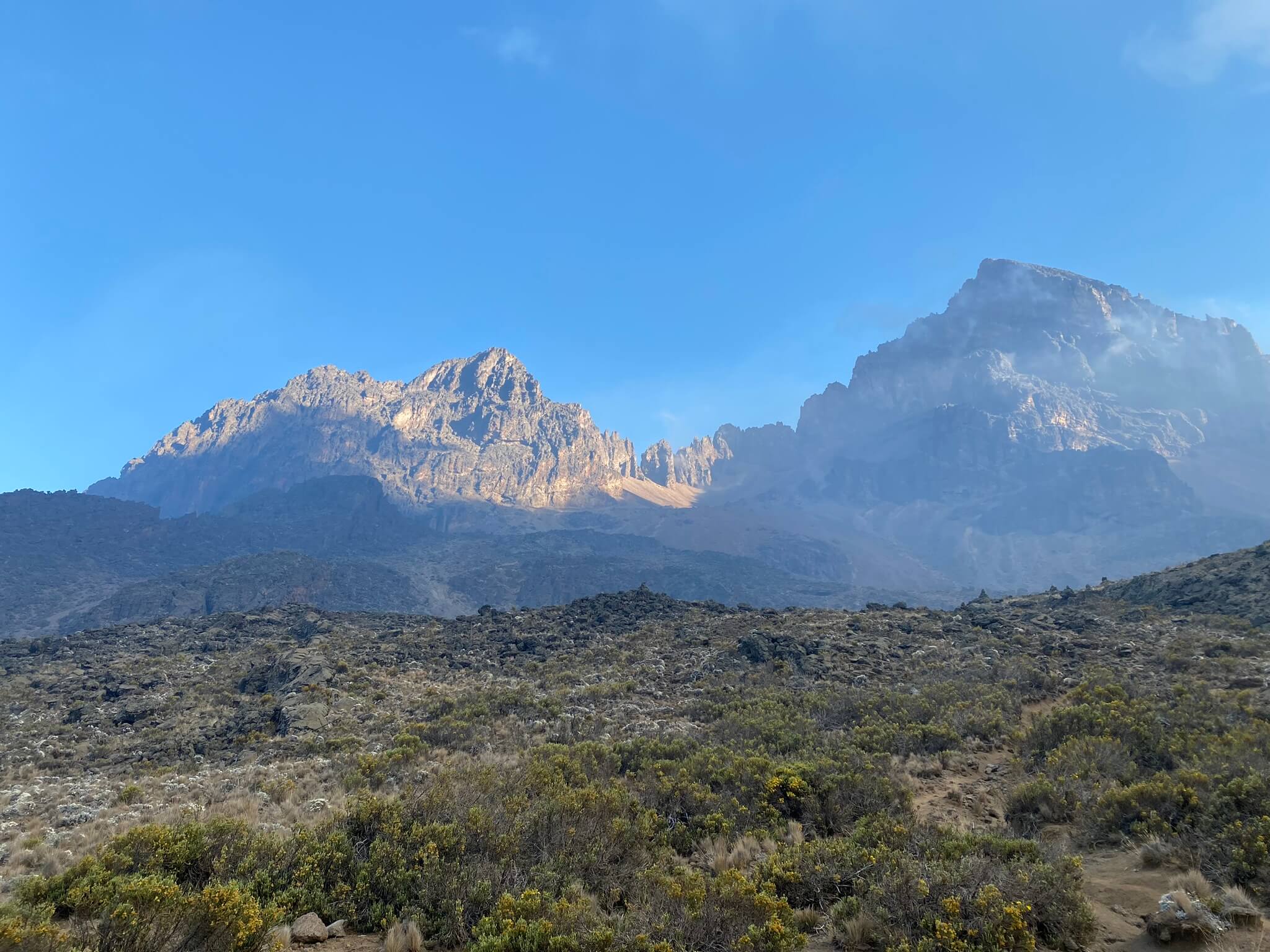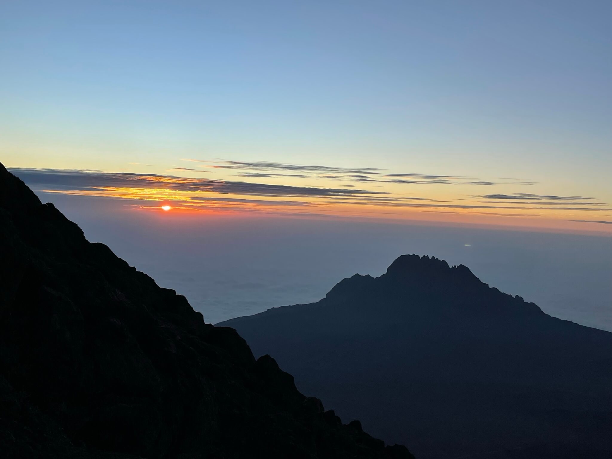 Als ich aus dem Zelt steige, bietet sich mir ein traumhafter Anblick. Wir sind hier auf 3800 m und damit deutlich über dem Wolkenmeer. Und hinter uns liegt der Kibo in der Morgensonne.