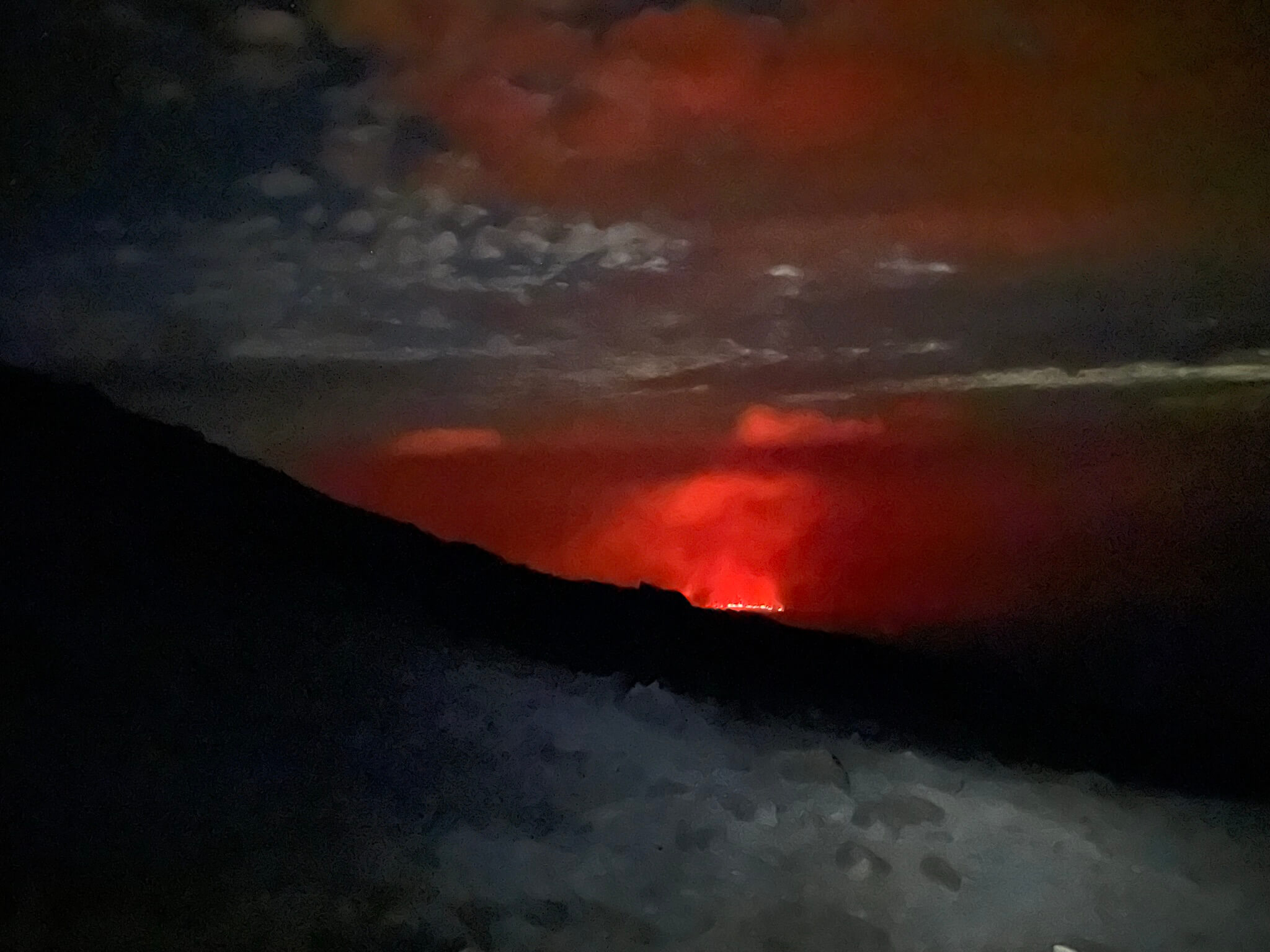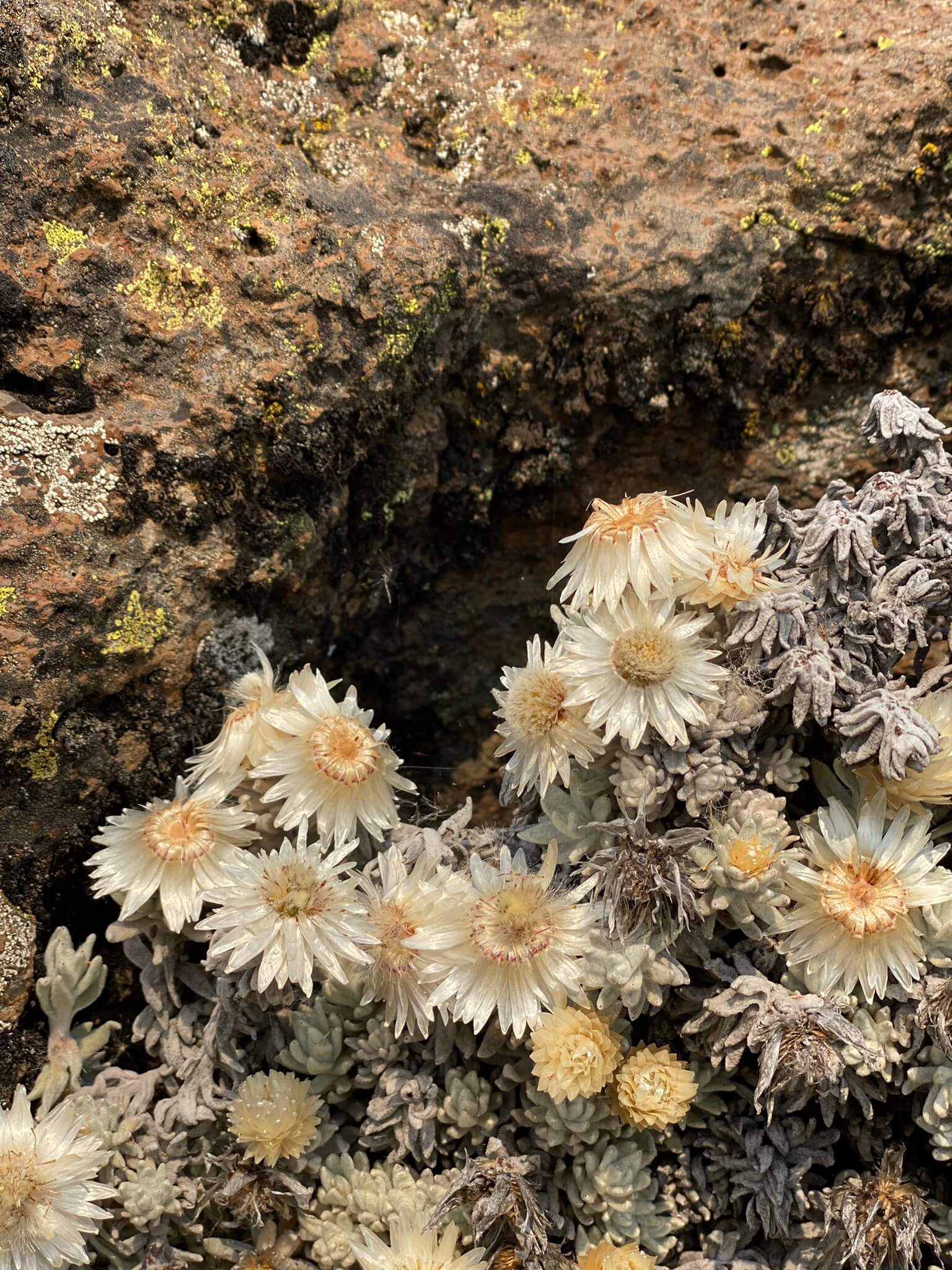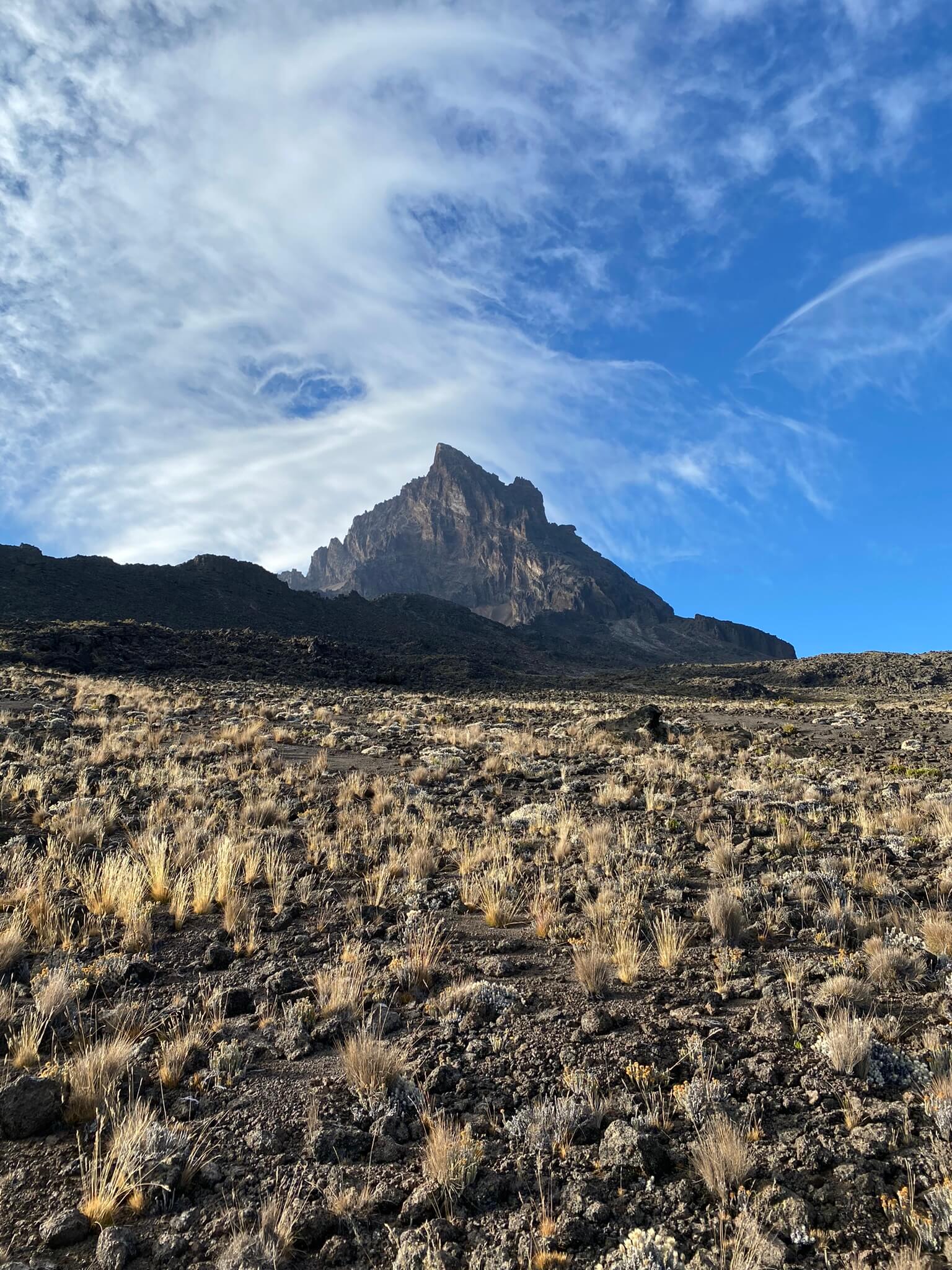 Nach einem Stündchen Pause machen wir noch einen „Ausflug“. D.h. wir steigen noch mal 120 Höhenmeter auf zur Akklimatisierung. Es heißt man soll hoch steigen und tief schlafen. Inzwischen hat sich eine Wolke vor den Berg geschoben und es ist ganz schön frisch. Zudem rieseln Aschepartikel auf uns herab und es riecht ziemlich nach Rauch. Offenbar ist irgendwo weiter hinten und unten ein Feuer ausgebrochen. Wir hatten das unseren Guides schon heute Früh gezeigt, aber sie haben uns nicht ernst genommen. Jetzt aber schon.