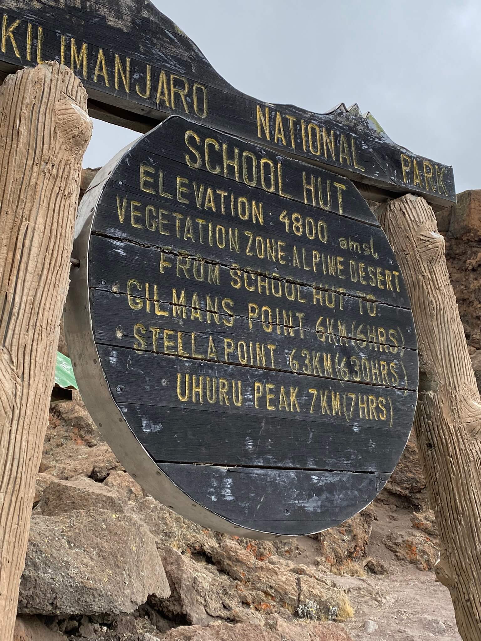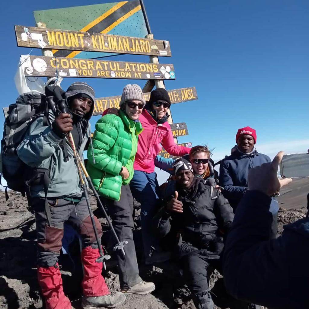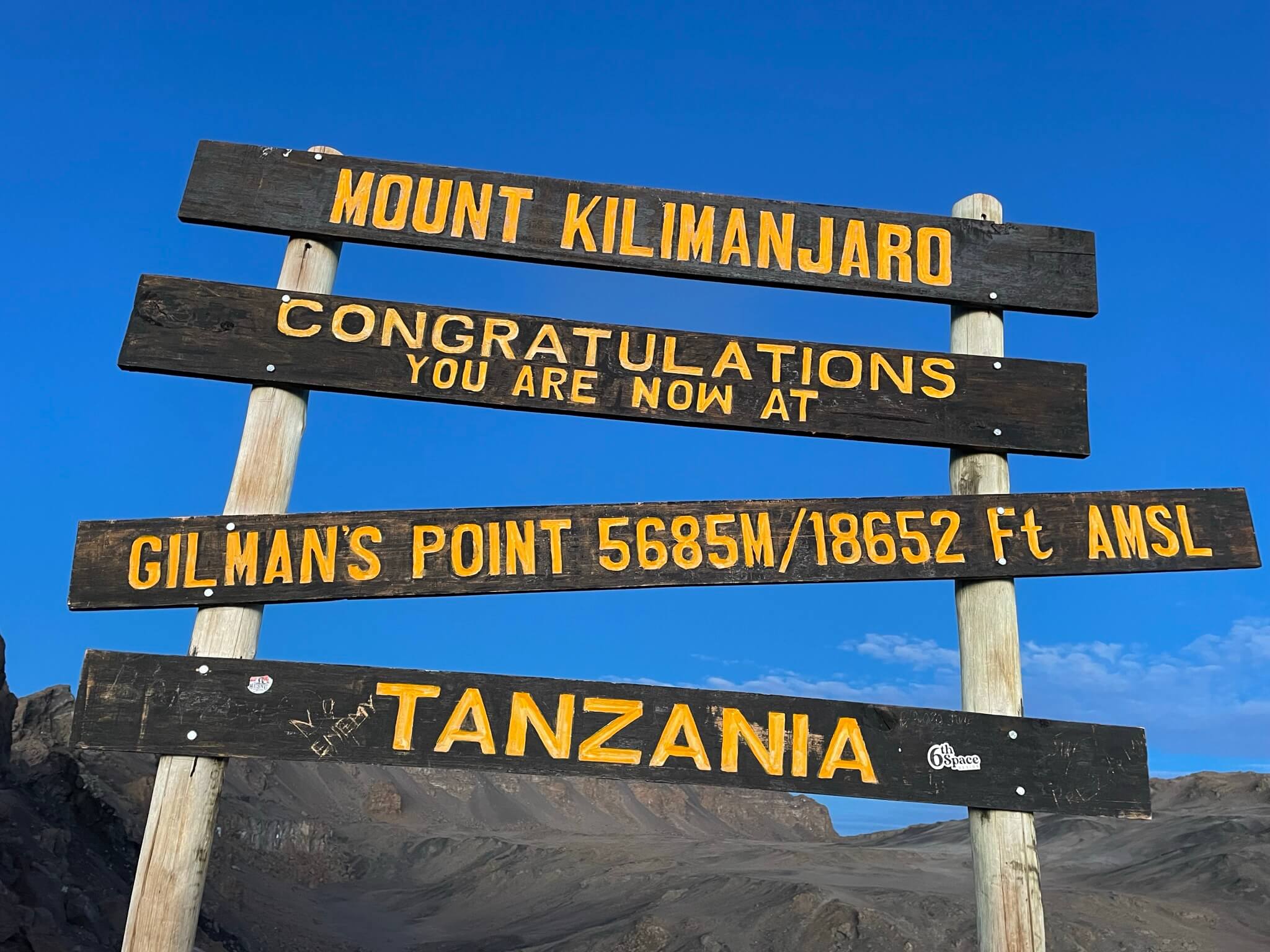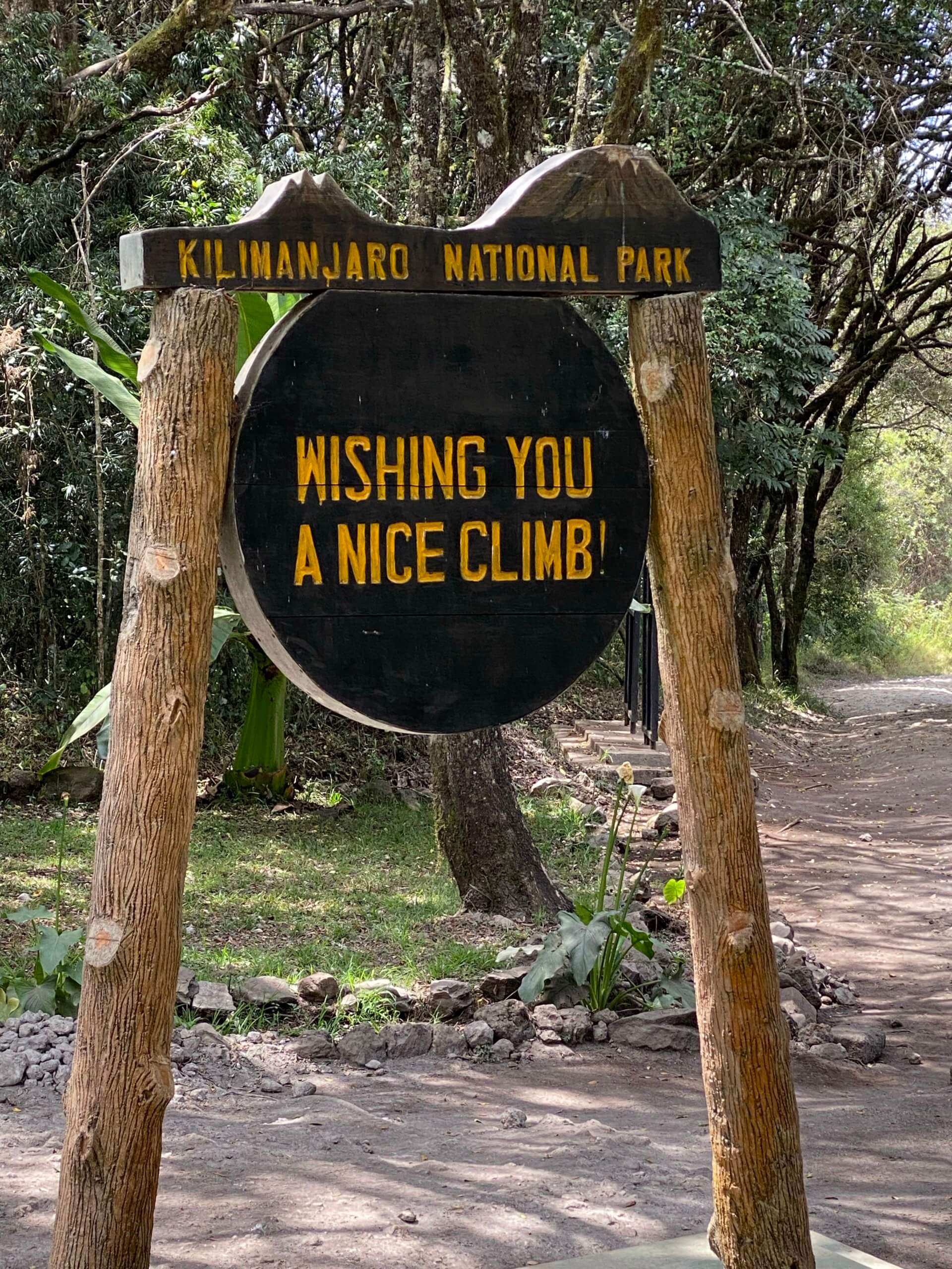 Planmäßig erreichen um wir nach viereinhalb Stunden das Marangu Gate. Jeder dort begrüßt uns freundlich und gratuliert uns zum Gipfelerfolg. Wir tragen uns in das Gipfelbuch ein, machen das obligatorische Foto vor dem Schild und dann steigen wir, dreckig, wie wir sind, in den Bus, der uns in ein nahegelegenes Dorf bringt, wo wir Mittag essen werden und uns von der Mannschaft verabschieden.