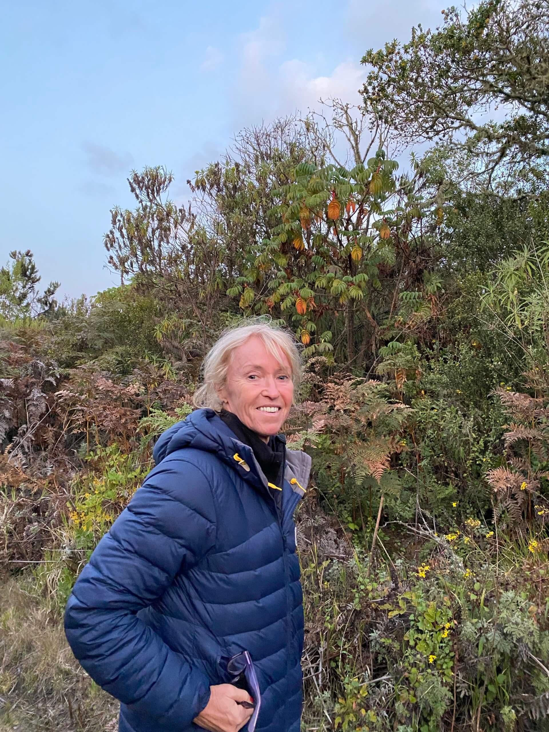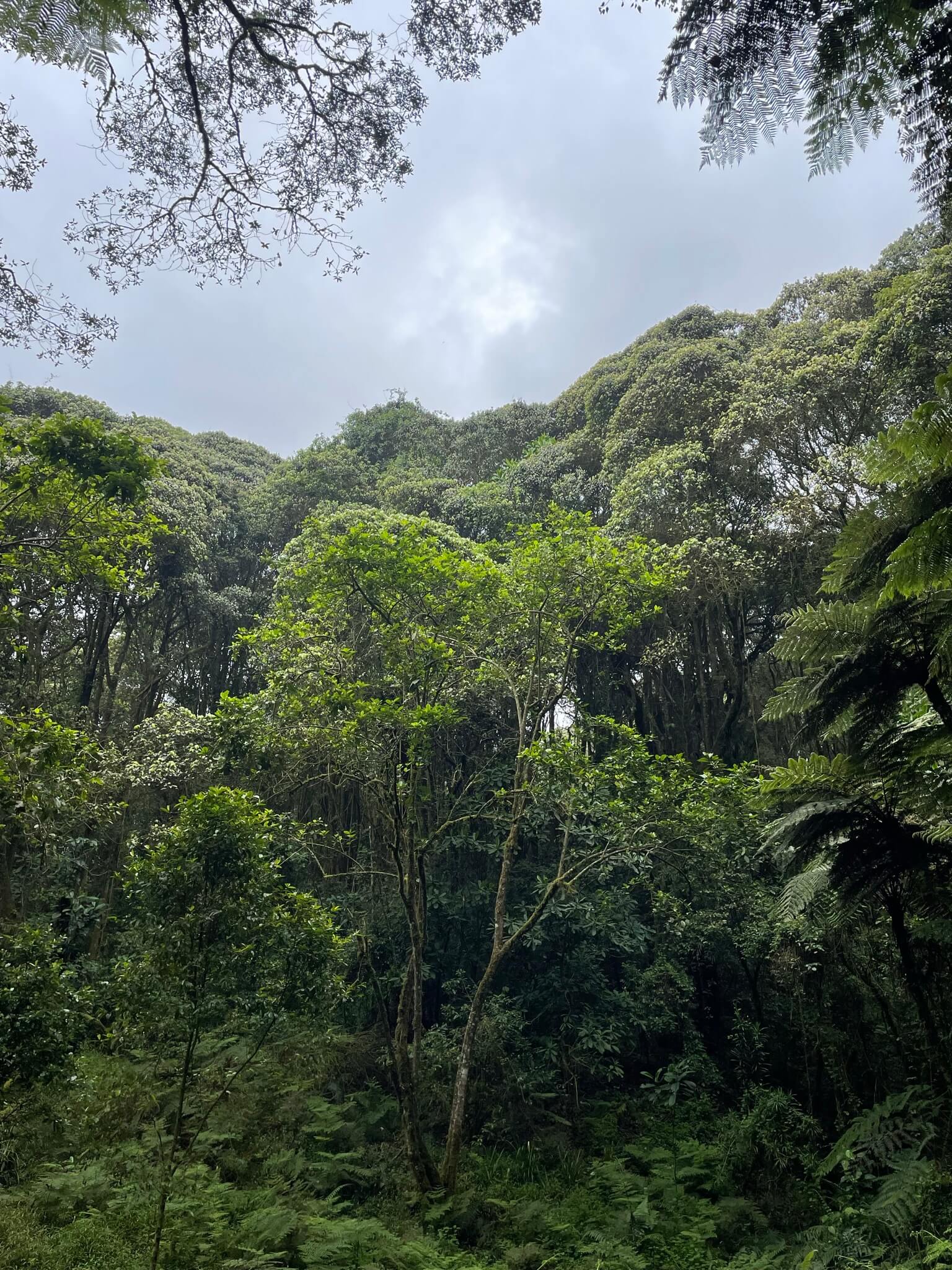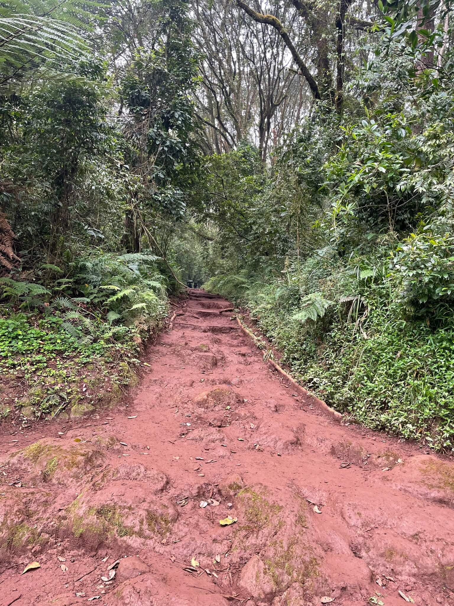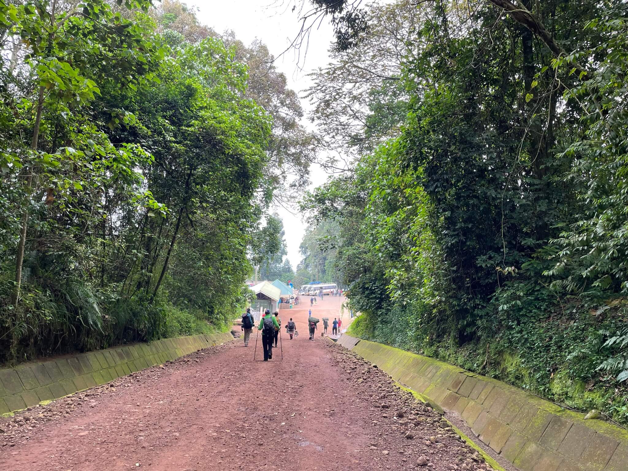 Dann machen wir uns an den Abstieg. Es liegen noch einmal 2100 Höhenmeter vor uns. Dafür sind viereinhalb Stunden eingeplant. Zuerst gehen wir über eine Art Weg, der aus unregelmäßigen Steinen zusammengesetzt ist, die wegen des Regens auch recht schlüpfrig sind. Das ist aber erst der Anfang. Wir gehen die ganzen 12 km entweder über feuchte, rutschige Steine oder durch tiefen Matsch oder beides. Ist ganz schön anstrengend. Zumal heute von unserem Assistant Guide Johnny richtig Gas gegeben wird. Wir steigen in wirklich raschen Tempo ab und überholen alle Gruppen, die vor uns losgegangen sind. Nur mit Mühe gelingt es mir immer wieder einen Ausblick auf den wunderschönen Regenwald zu erhaschen, der um uns herum wuchert.