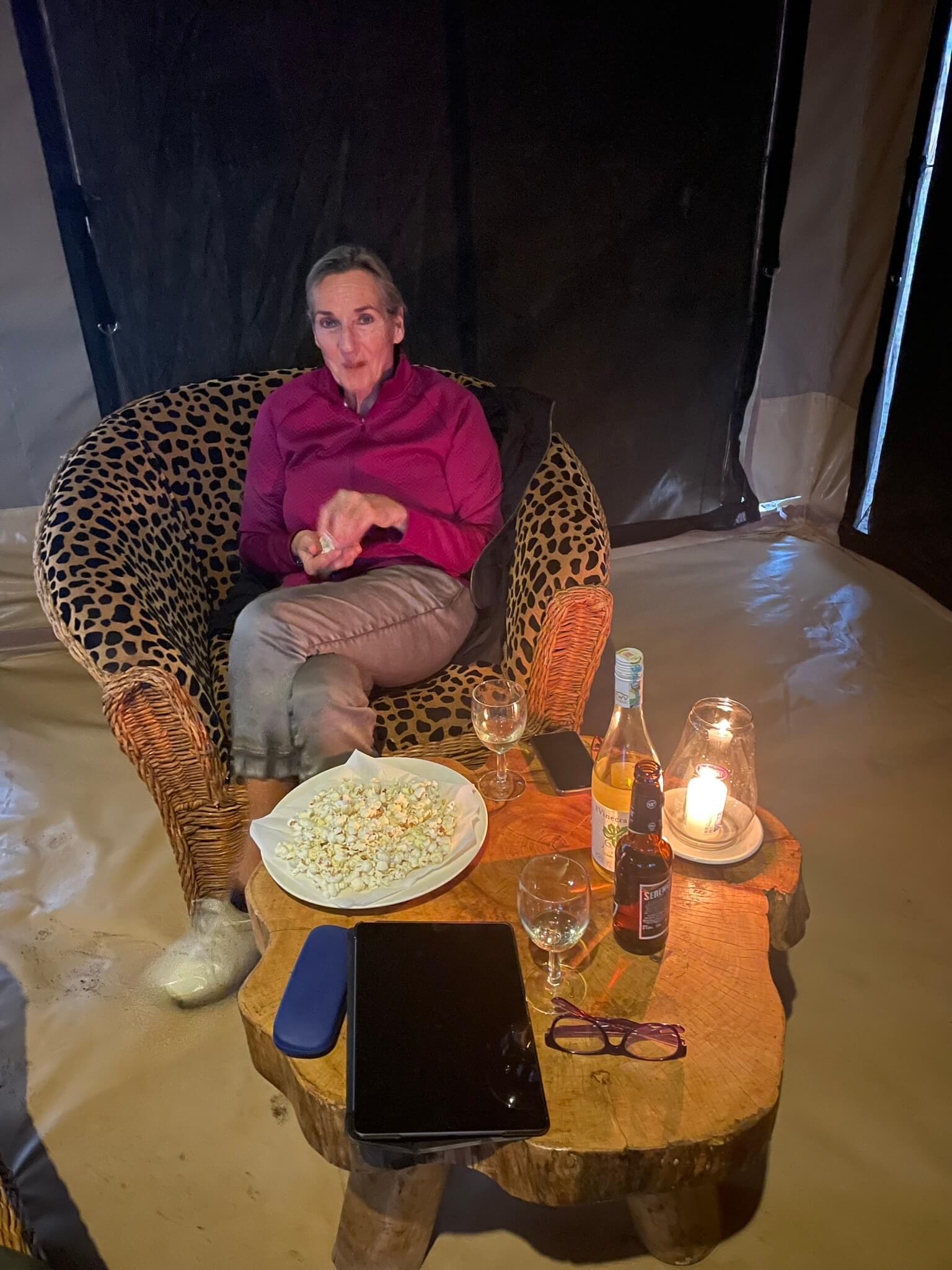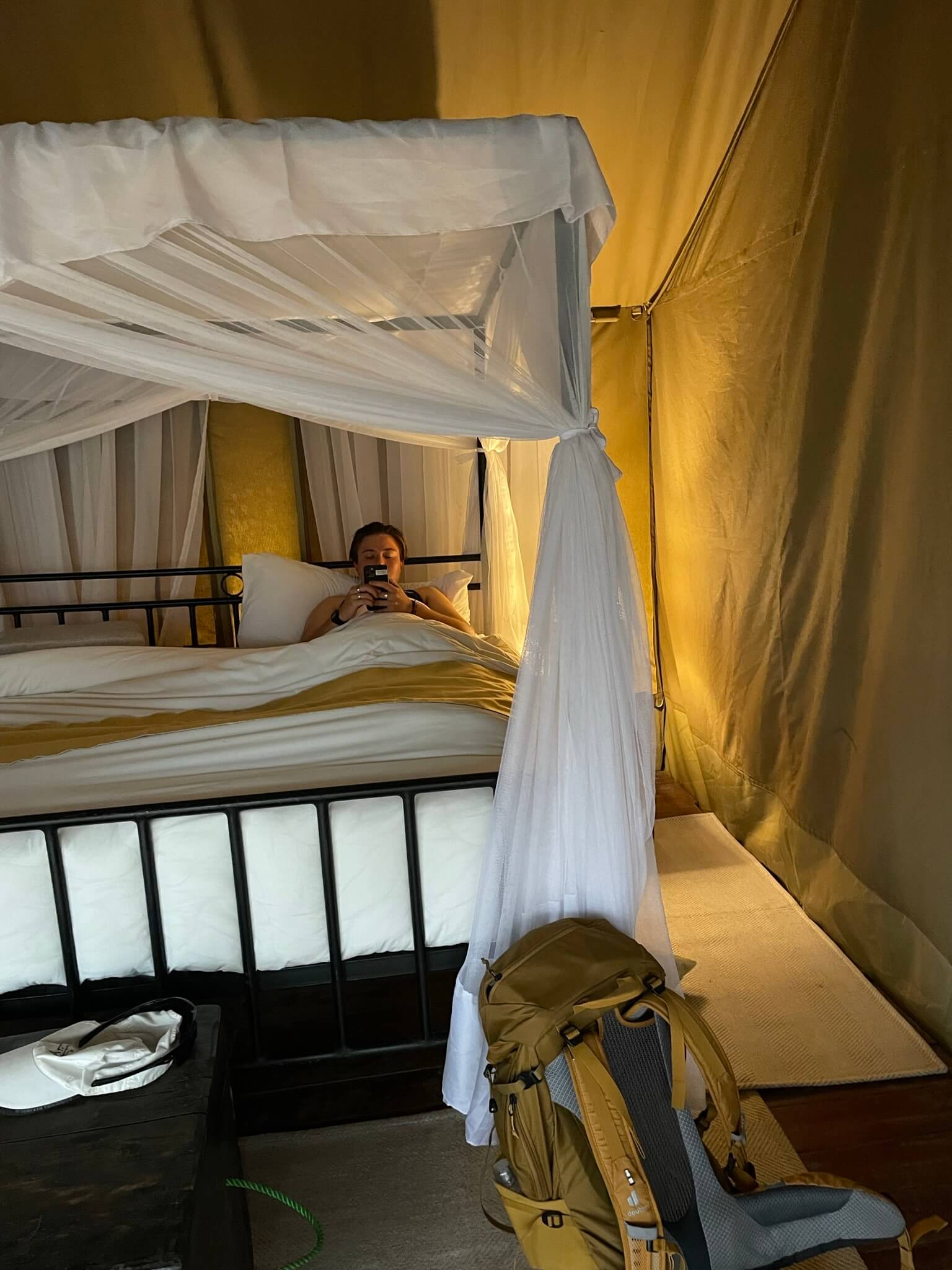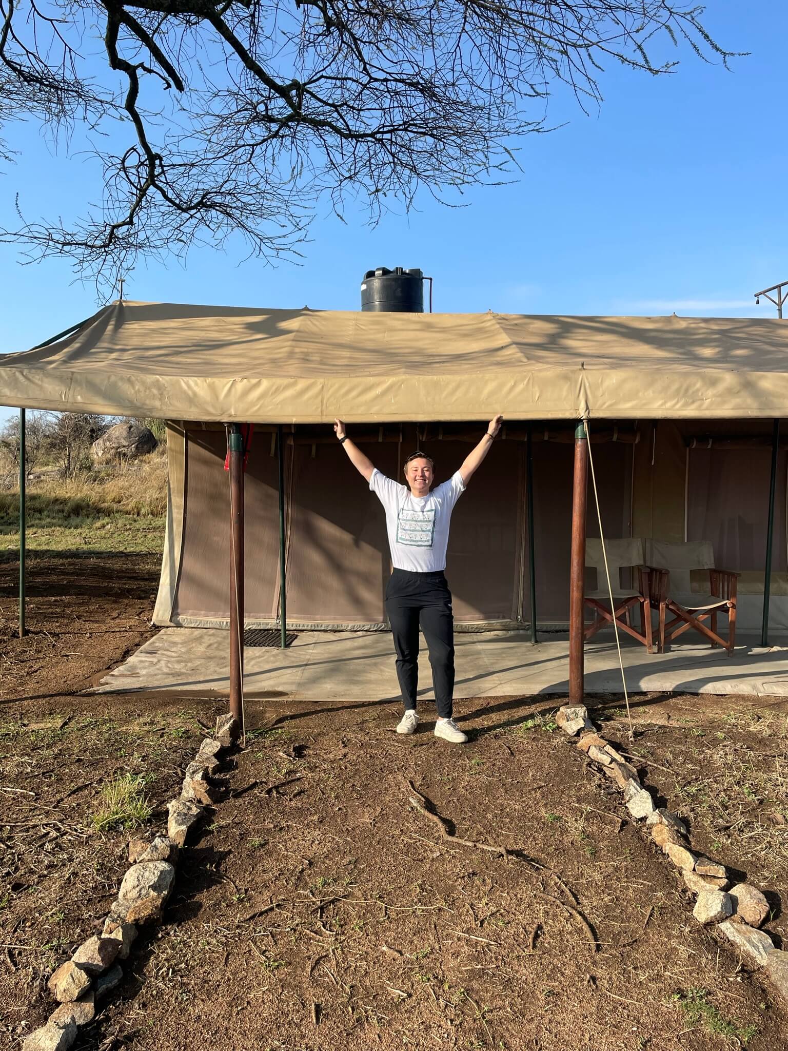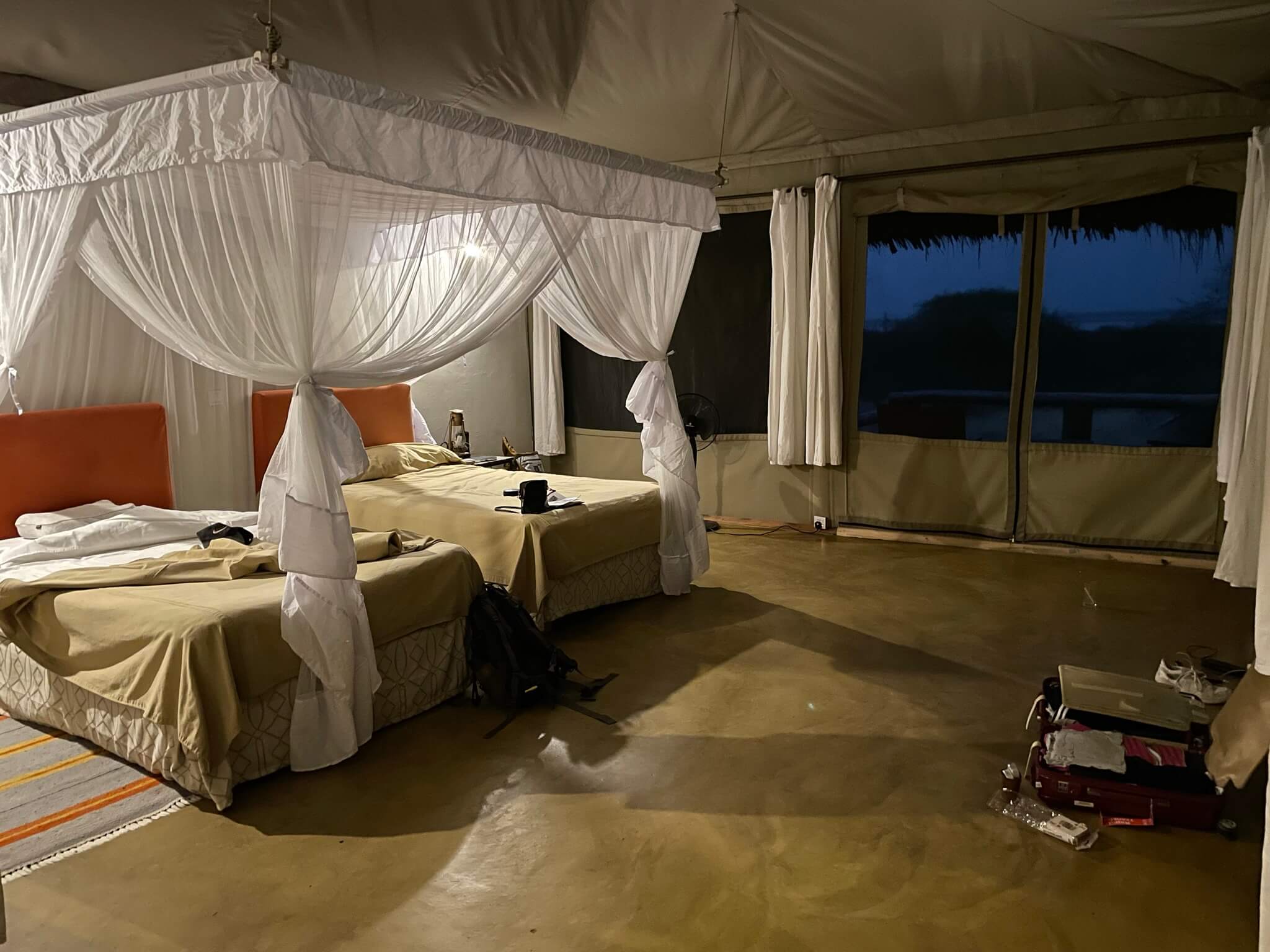 Nachdem wir sehr lange atmende Löwen betrachtet haben (fand ich bisschen langweilig), fahren wir wieder weiter und irgendwann hält unser Guide vor irgendwelchen sonderbaren Zelten an. Ich möchte gerade fragen, wer denn darin haust, als ich erfahre, dass ich das bin. Dies ist unser Lager für die nächsten zwei Nächte. Mir fällt die Kinnlade bis zu den Knien runter.