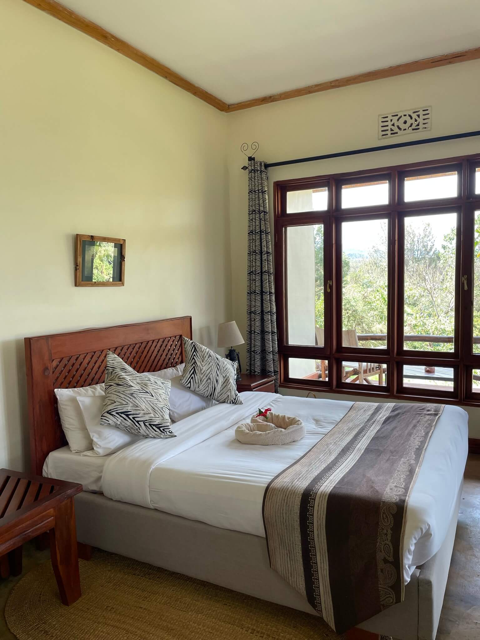 Die Zimmer sind einfach und zweckmäßig aus den 50-er-Jahren und haben sogar eine Feuerstelle. Vom Balkon aus sieht man in einem Garten, wo Zebras und andere Tiere weiden und es gibt noch mal eine herrliche Aussicht auf die Umgebung.