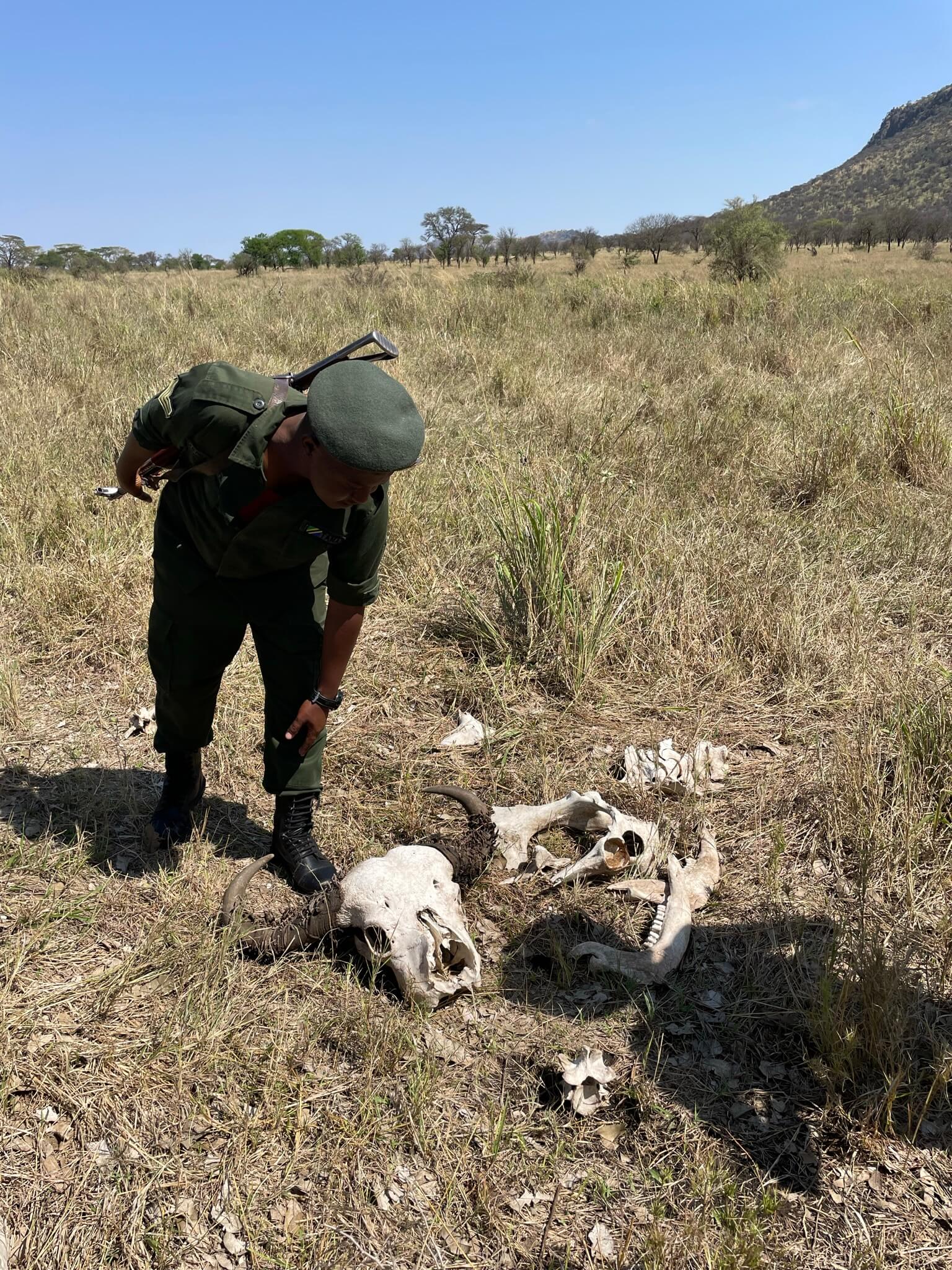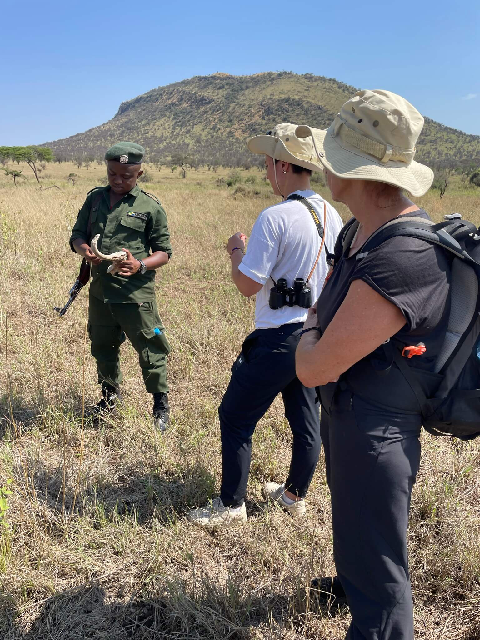 Heute steht eine Fußpirsch mit einem bewaffneten Ranger auf dem Programm. Dazu fahren wir erst mal eine Stunde lang mit dem Auto drei verschiedene Stellen an, wo Formulare ausgefüllt werden. Dann treffen wir auf ein kleines Männchen mit einem großen Gewehr, das uns durch die Savanne führen wird. Wir lernen die Spuren von verschiedenen Tieren lesen, lernen, wie deren Dung aussieht und treffen schon bald auf eine schwarze Mamba. Zum Glück nur eine ganz kleine. Die Mutter bleibt uns erspart. Ansonsten sehen wir noch von Weitem Herden von Zebras und Wildebeest (Gnus), die durch die Savanne ziehen. Nach zweieinhalb Stunden ist das Männlein ziemlich erschöpft und wir steigen wieder ins Auto ein, um von dort aus Tieren nachzujagen.