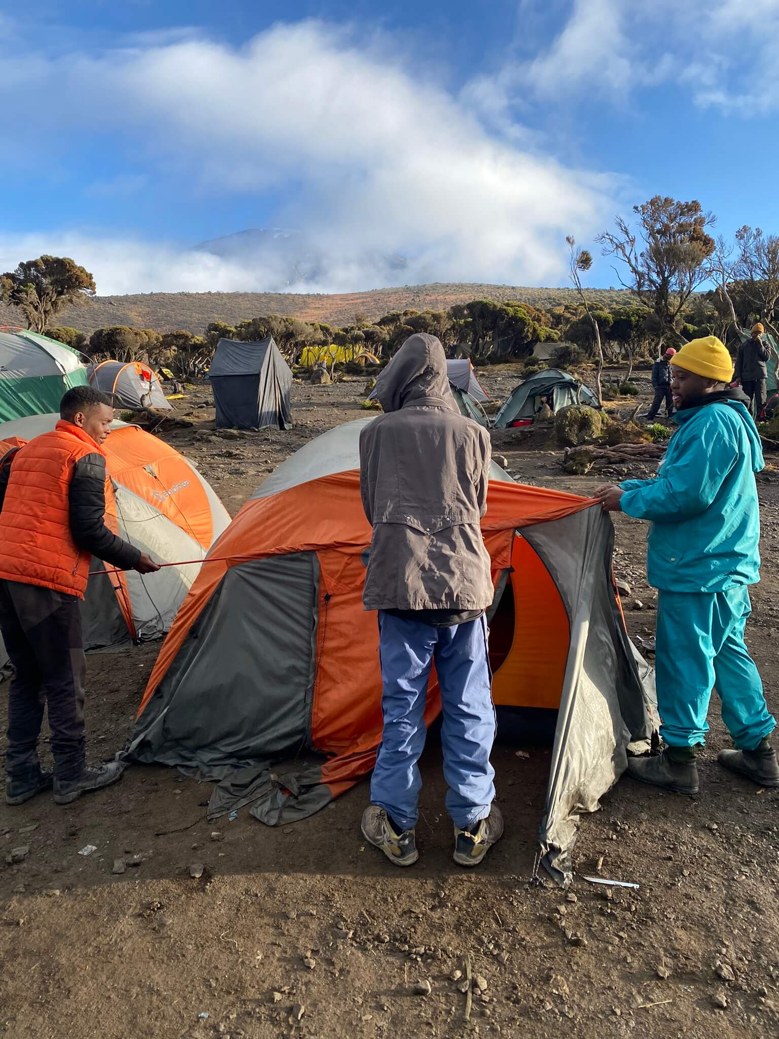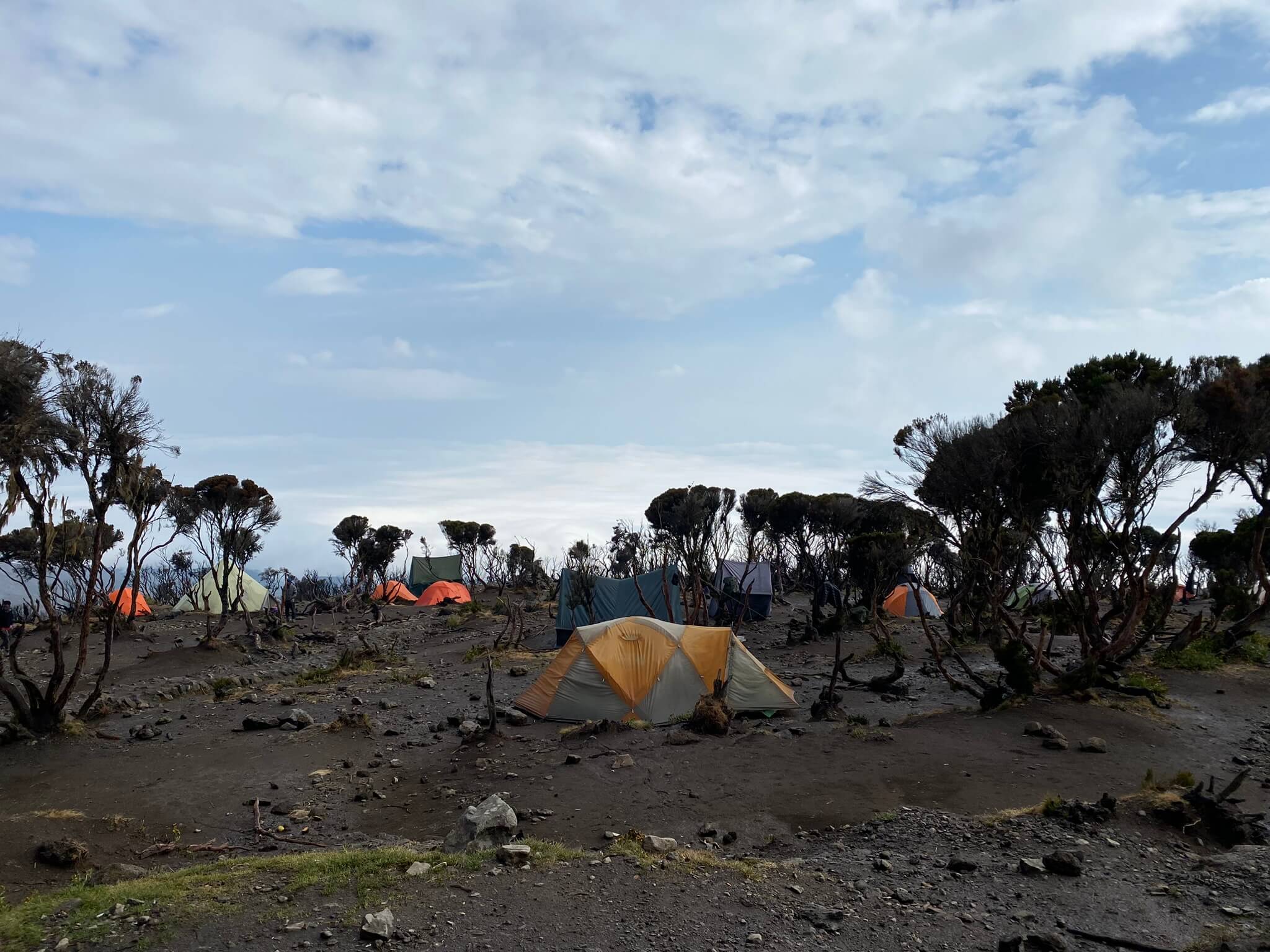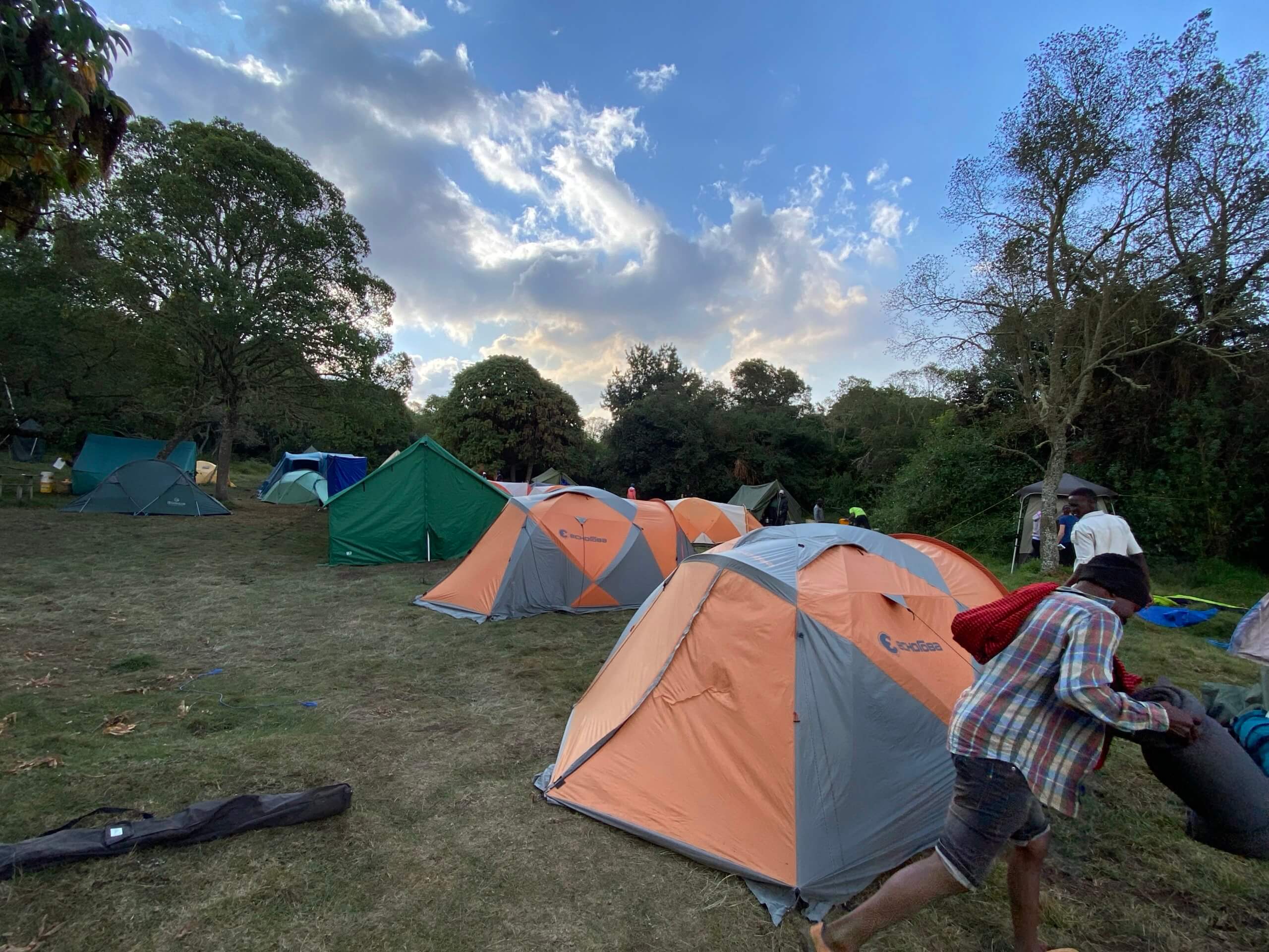 Gegen 17:30 Uhr erreichen wir das erste Zeltlager, das Simba Camp. Jede Menge Zelte stehen schon da. Wir fragen uns, wie viele Gruppen auf dieser Route unterwegs sind.
