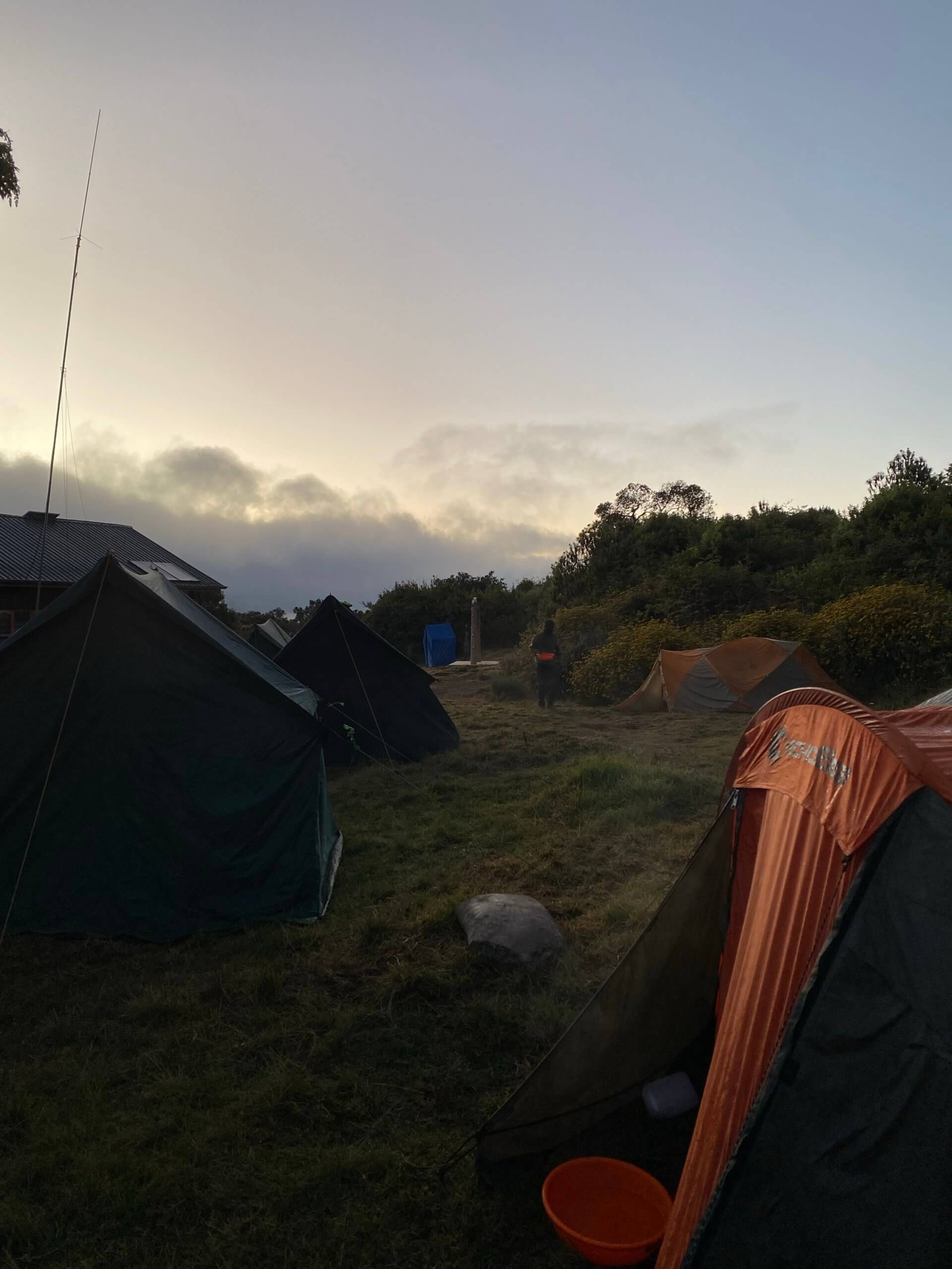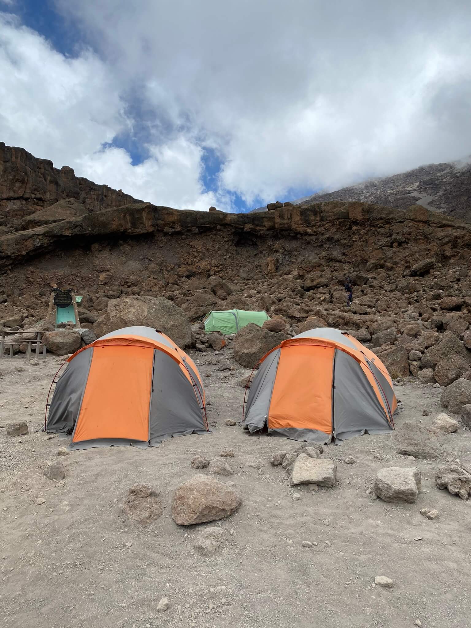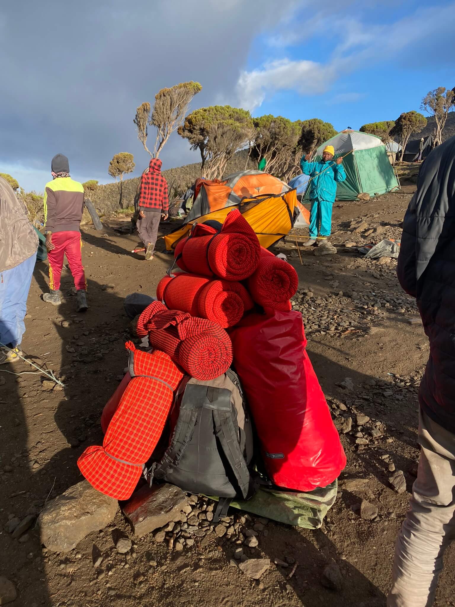 Gegen 17:30 Uhr erreichen wir das erste Zeltlager, das Simba Camp. Jede Menge Zelte stehen schon da. Wir fragen uns, wie viele Gruppen auf dieser Route unterwegs sind.