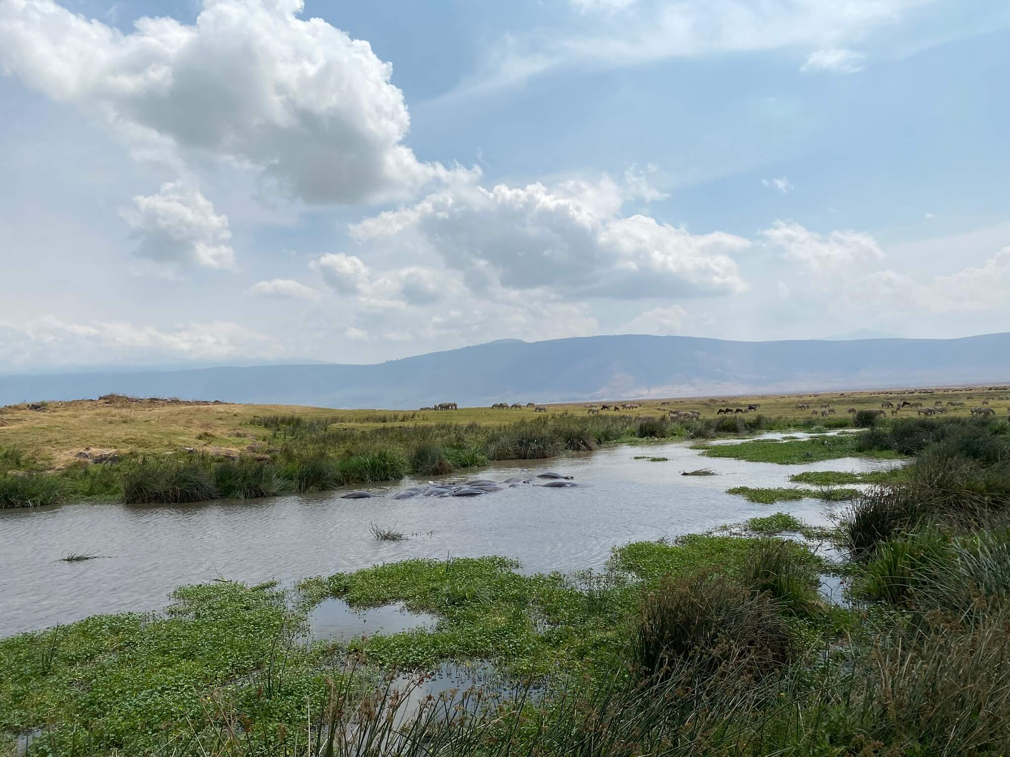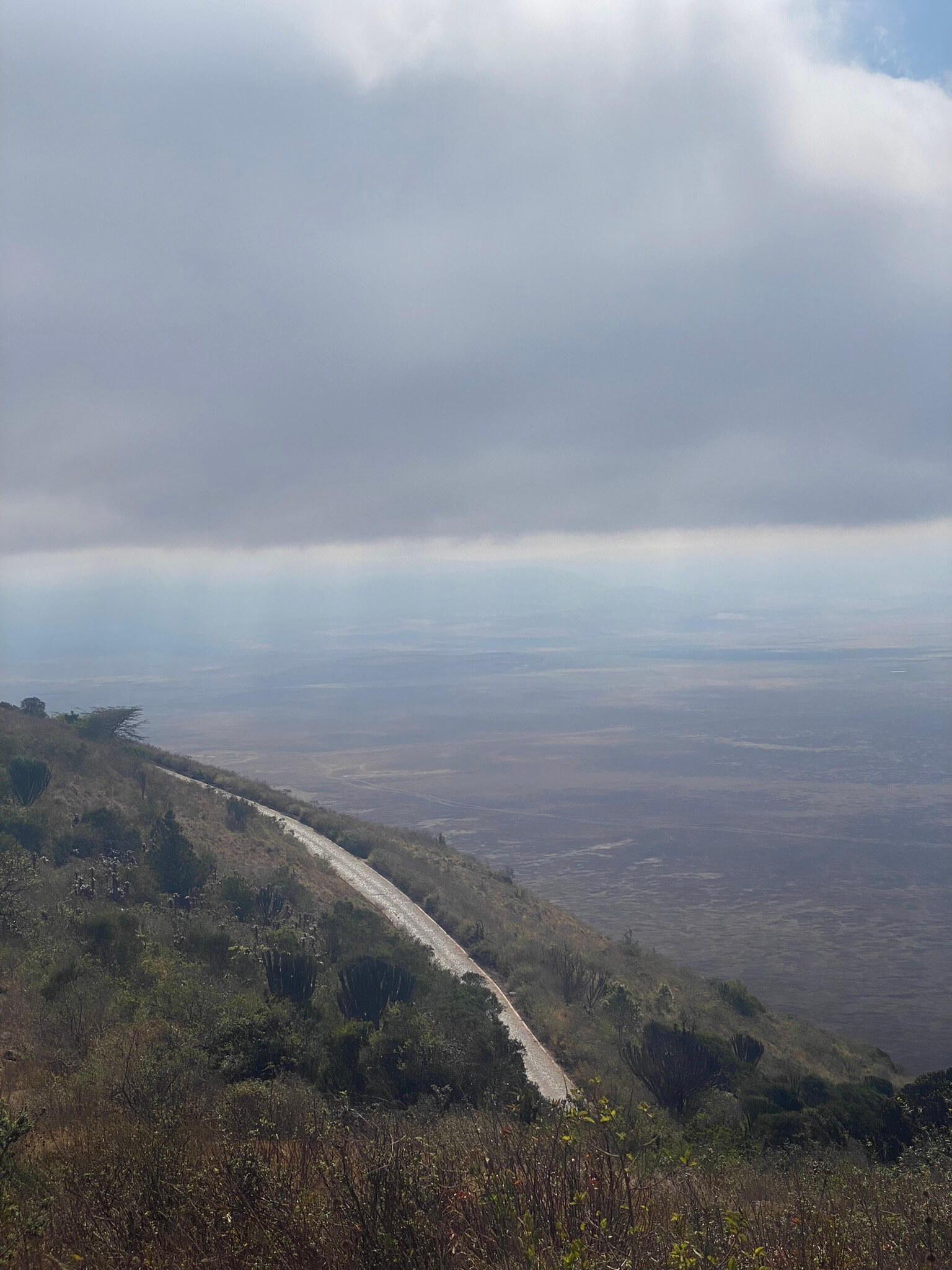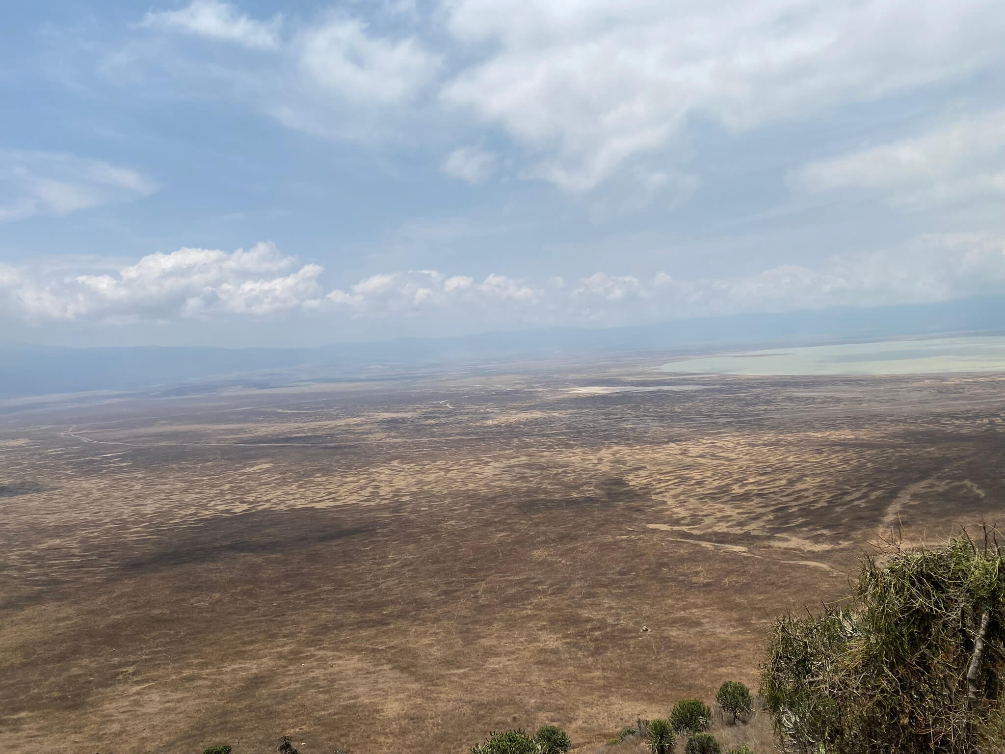 Auf dem Weg zur Serengeti fahren wir durch den Ngorongoro National Park, Auf holpriger Piste geht es auf dem Kraterrand stetig bergauf. Zeitweise ist es so neblig, dass man kaum die Straße sieht. Später reißt es auf und es bietet sich ein grandioser Ausblick über den Krater. Dieser ist so groß, dass man mit dem Auto drei Stunden benötigt, um ihn zu durchqueren.