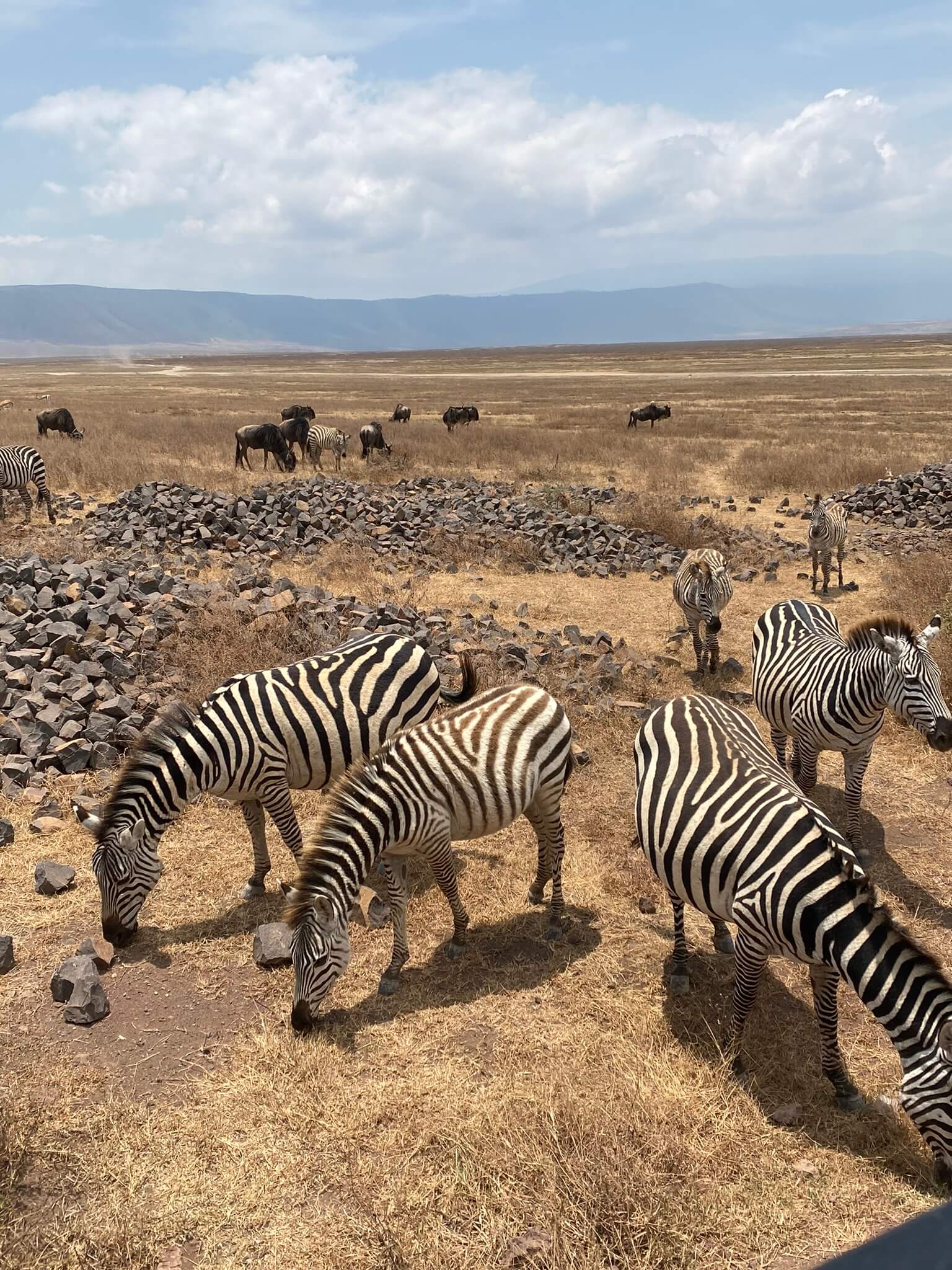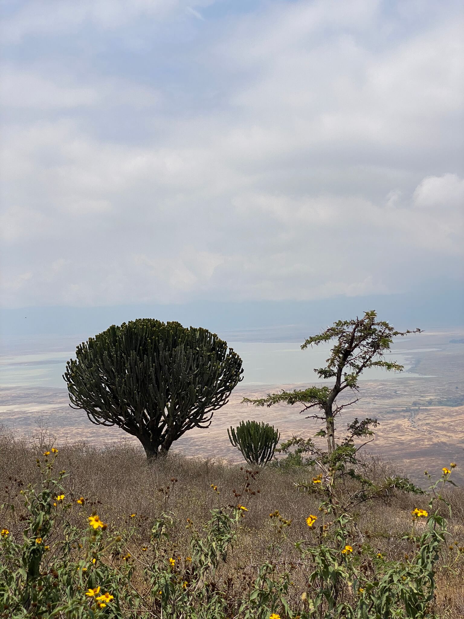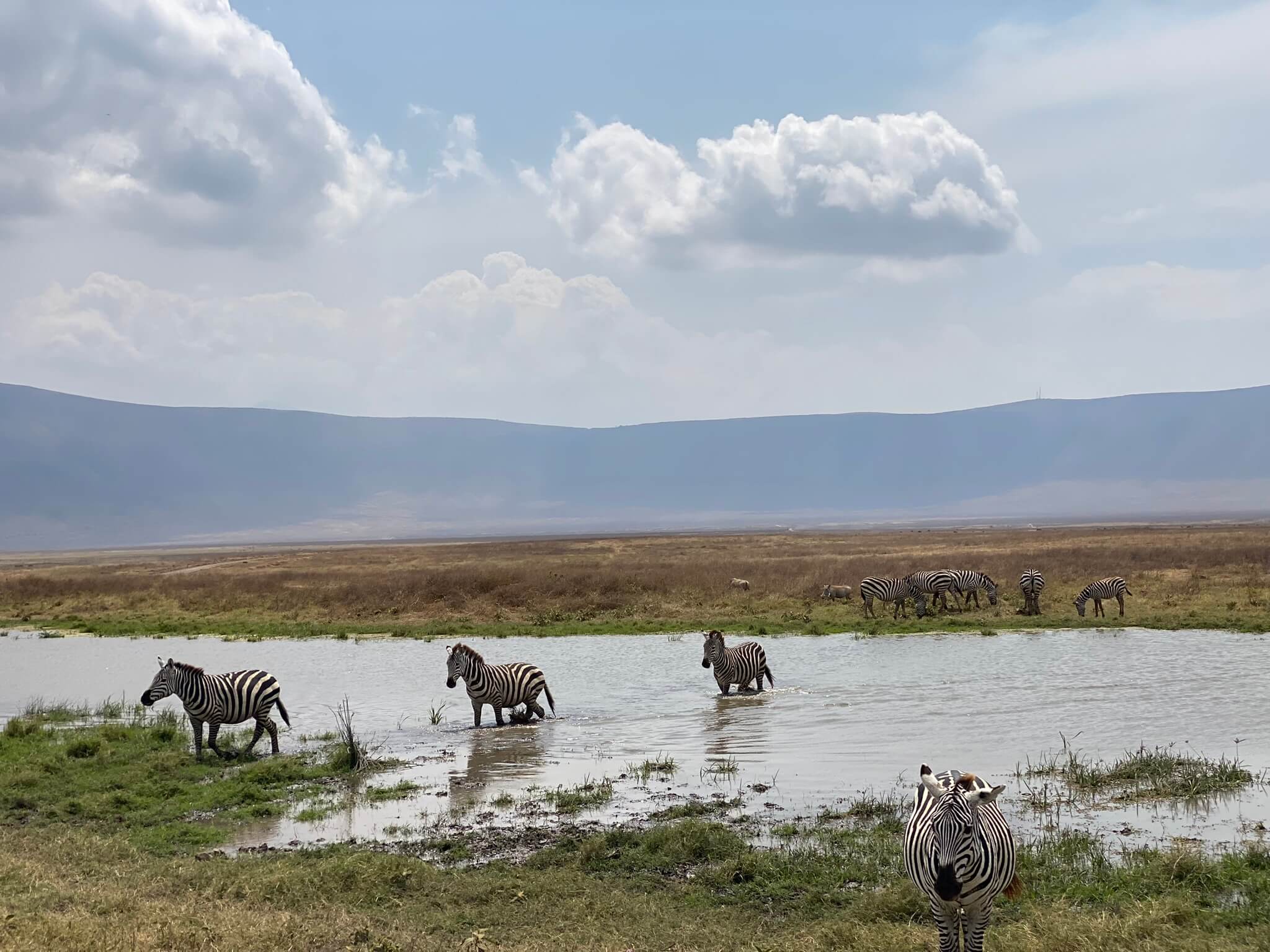 Auf dem Weg zur Serengeti fahren wir durch den Ngorongoro National Park, Auf holpriger Piste geht es auf dem Kraterrand stetig bergauf. Zeitweise ist es so neblig, dass man kaum die Straße sieht. Später reißt es auf und es bietet sich ein grandioser Ausblick über den Krater. Dieser ist so groß, dass man mit dem Auto drei Stunden benötigt, um ihn zu durchqueren.