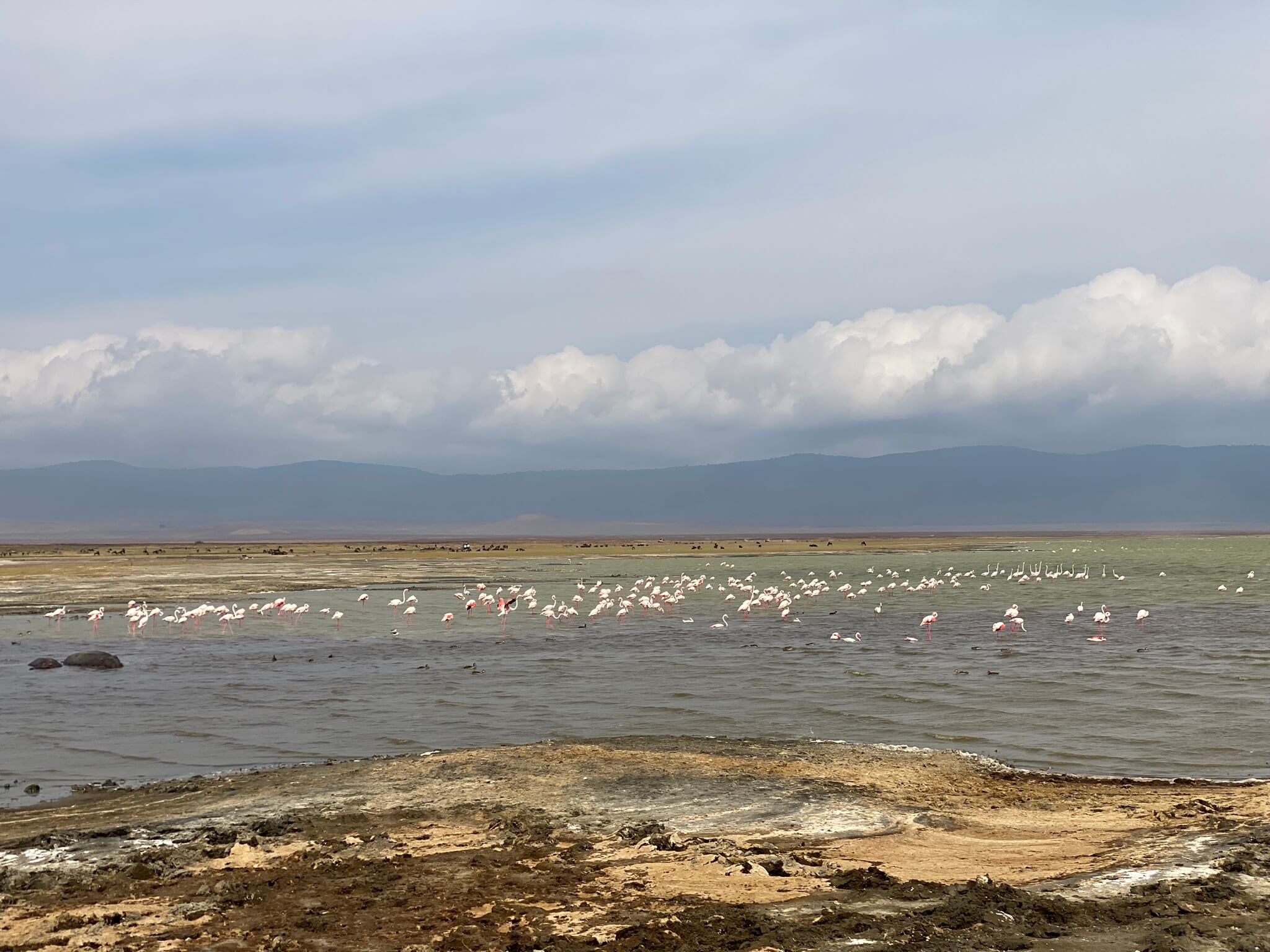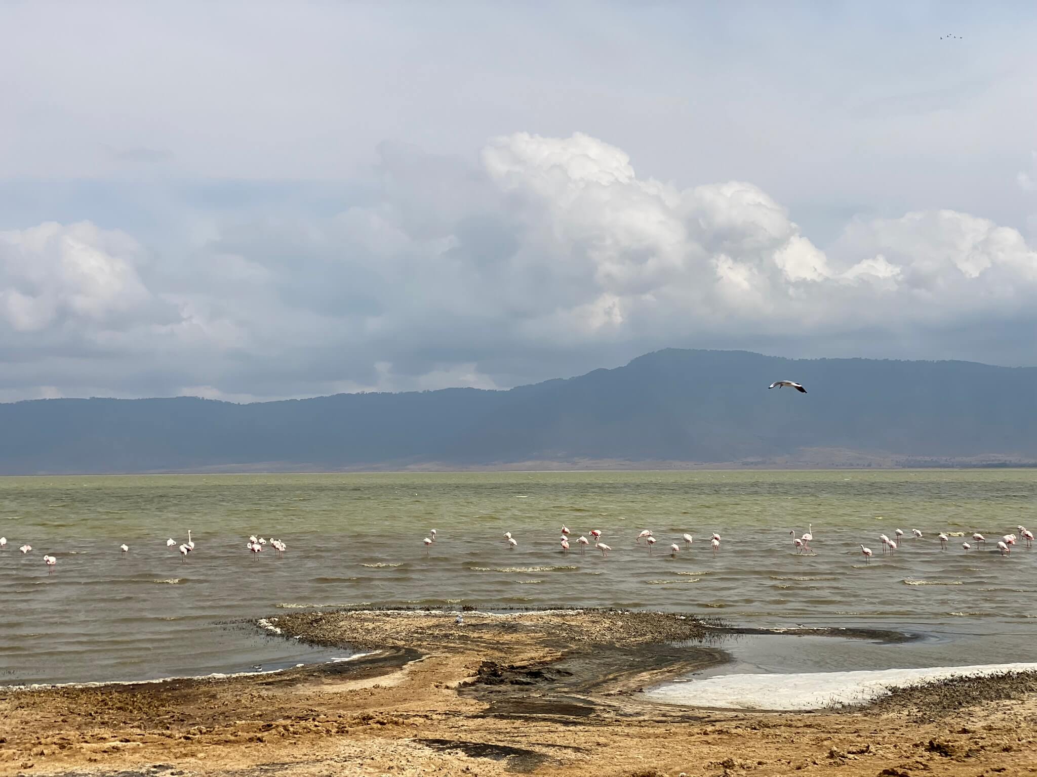 Weiter geht es zum Ngorongoro Krater. Eine steile Straße führt in den Krater hinein. Die Landschaft ist wieder ganz anders und wunderschön. In der Mitte des Kraters ist ein See mit Flamingos.