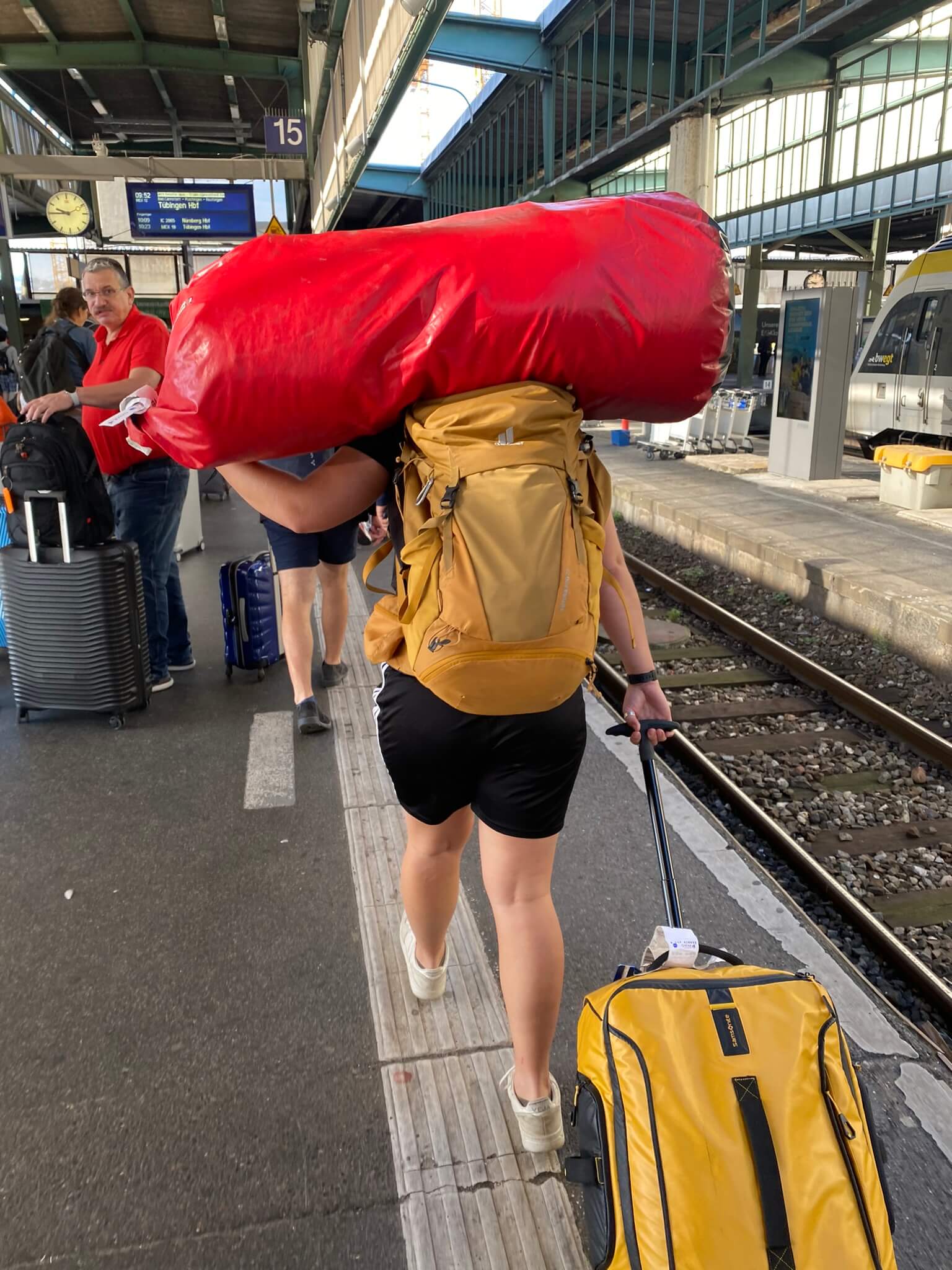 Um 12:00 Uhr geht es los. Mit dem Großraum Taxi fahren wir zum Bahnhof. Der Zug, für den wir Plätze reserviert haben, fällt aus, oder auch nicht. So genau weiß man das ja nicht bei der Deutschen Bundesbahn. Coni reserviert vorsichtshalber auch für einen anderen Zug. Auf jeden Fall steht, als wir am Bahnhof eintreffen, ein Zug da, der direkt nach Frankfurt Flughafen fährt. Und den nehmen wir. Er ist zwar so überfüllt, dass Anna und ich die ganze Strecke über, zusammen mit zahlreichen anderen Menschen, im Gang auf dem Boden sitzend verbringen, aber Hauptsache, wir kommen an.