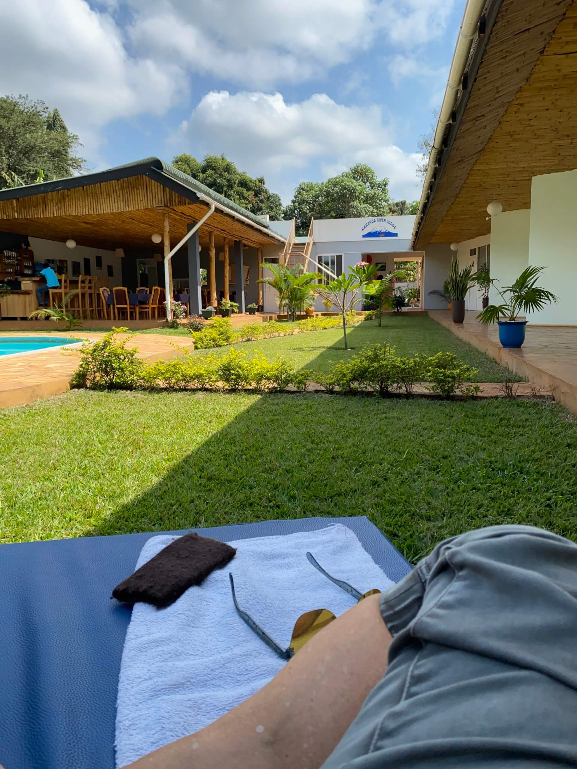 Ein kleines Hotel mit ungefähr zehn Zimmern. Jedes trägt den Namen eines afrikanischen Tieres. Coni und Anna wohnen im Rhinozeros, ich im Zebra. Wir sind die einzigen Gäste hier, und das Personal ist absolut reizend. Sowas von freundlich und aufmerksam. Man braucht die Sonnenliege im Garten nur anzuschauen, dann wird sie einem an die gewünschte Stelle getragen. Wir ruhen kurz im Garten. So richtig toll geschlafen haben wir im Flugzeug ja nicht. Und dann essen wir im Hotel. Es wird extra frisch für uns zubereitet. Wir entscheiden uns für einheimisches Essen, das köstlich schmeckt.