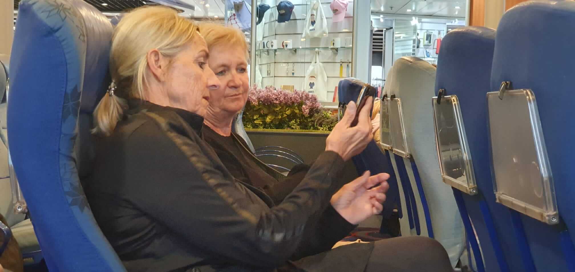 Auf der Fähre wird eingehend in mehreren Sprachen erklärt, wie man auszusteigen hat, nämlich Zone für Zone. Und während wir noch artig auf unseren Plätzen sitzen und warten, kommt schon eine Mitarbeiterin mit dem Besen und kehrt uns raus.
