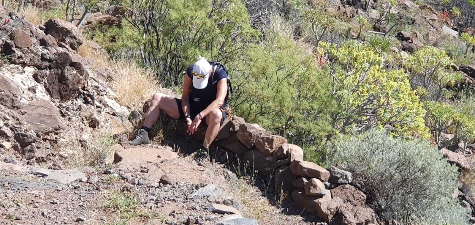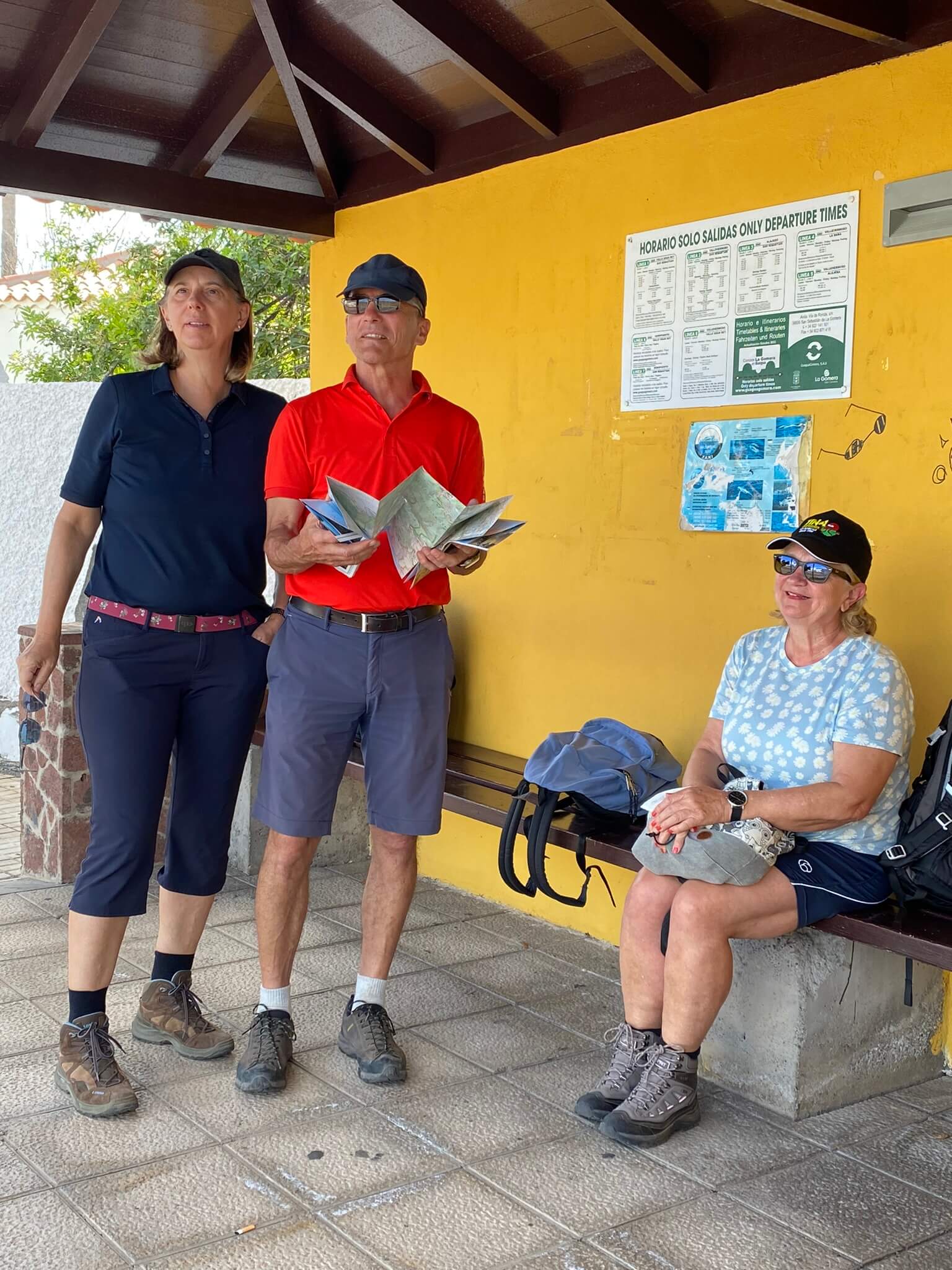 Natürlich kommen wir entsprechend langsam voran. Nach ungefähr zweieinhalb Stunden gibt es eine Vesperpause. Christa verzehrt das erste Vesper ihres Lebens. All das kann man von Golfern lernen. Es sind immer noch sechseinhalb Kilometer bis Tecina. Zu diesem Zeitpunkt ist noch alles gut und wir schauen fröhlich.