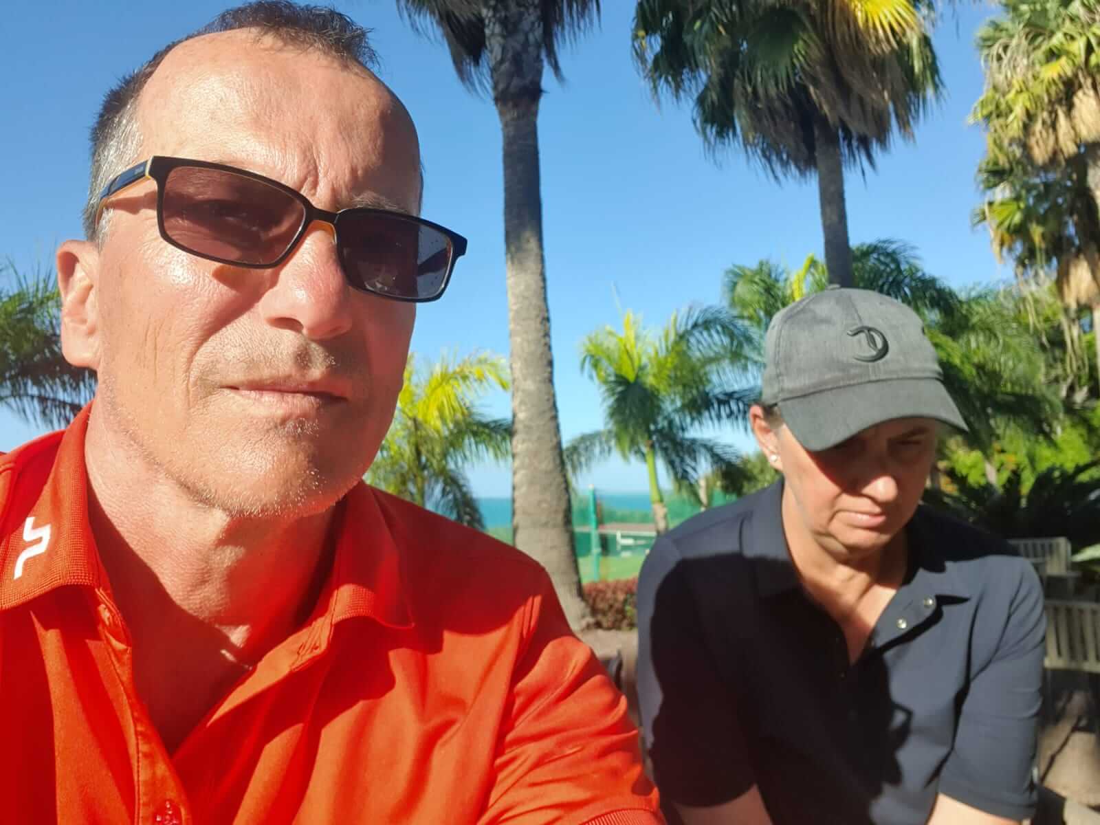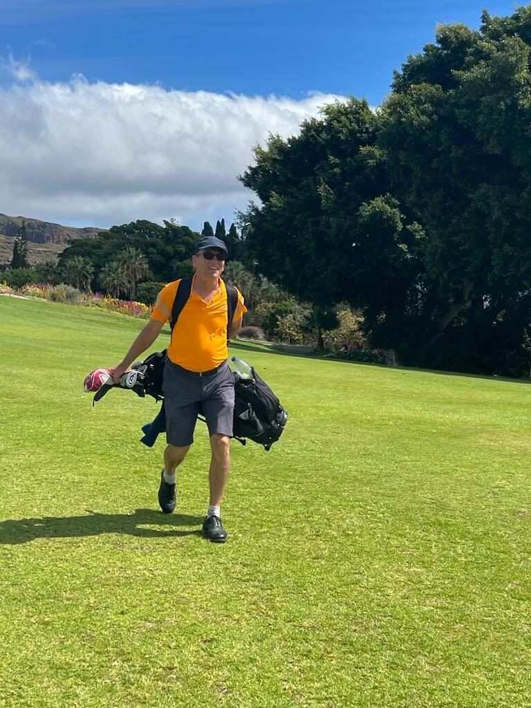 Heute spielen wir noch mal Golf. Christa geht als Caddy mit.