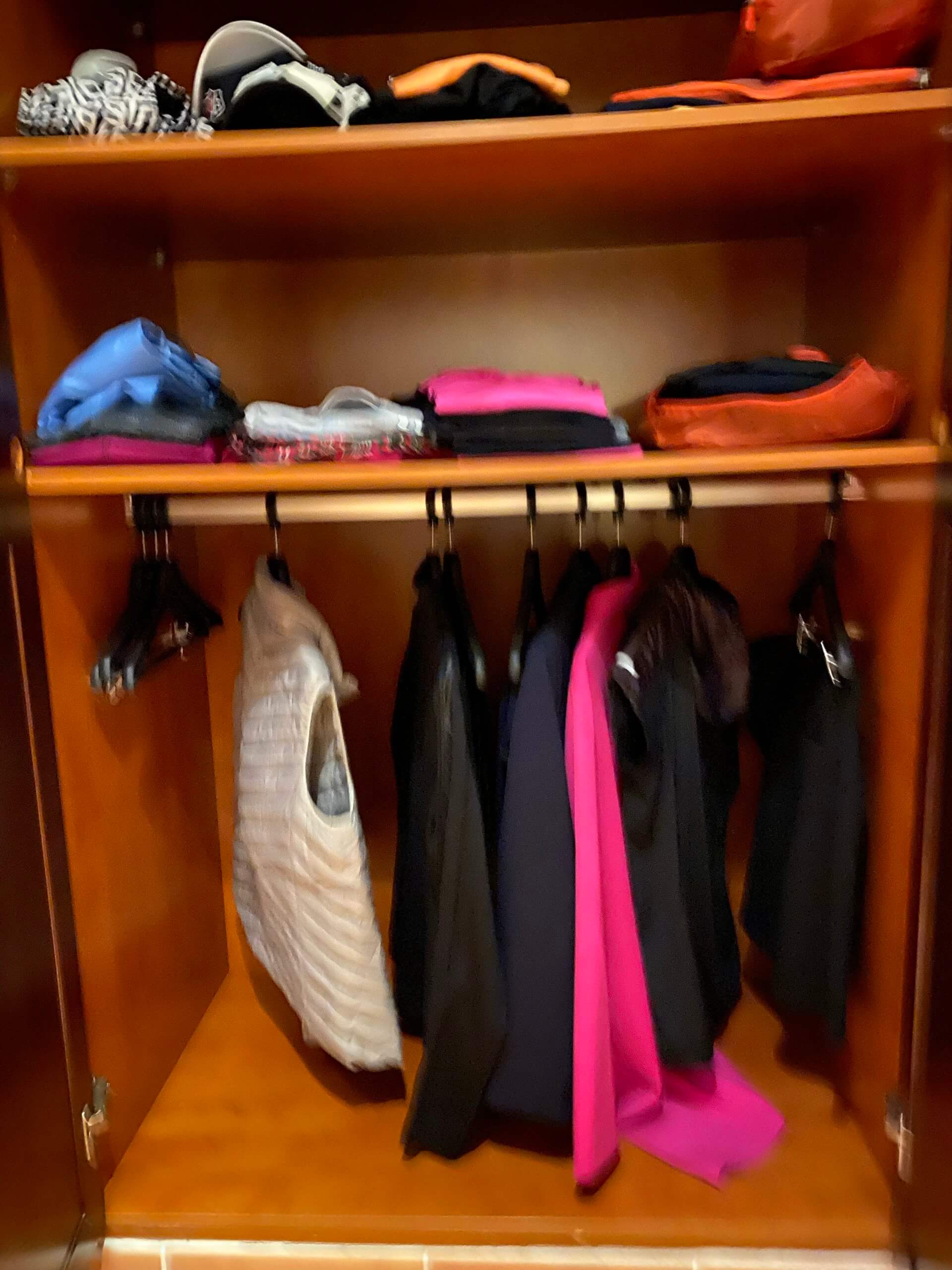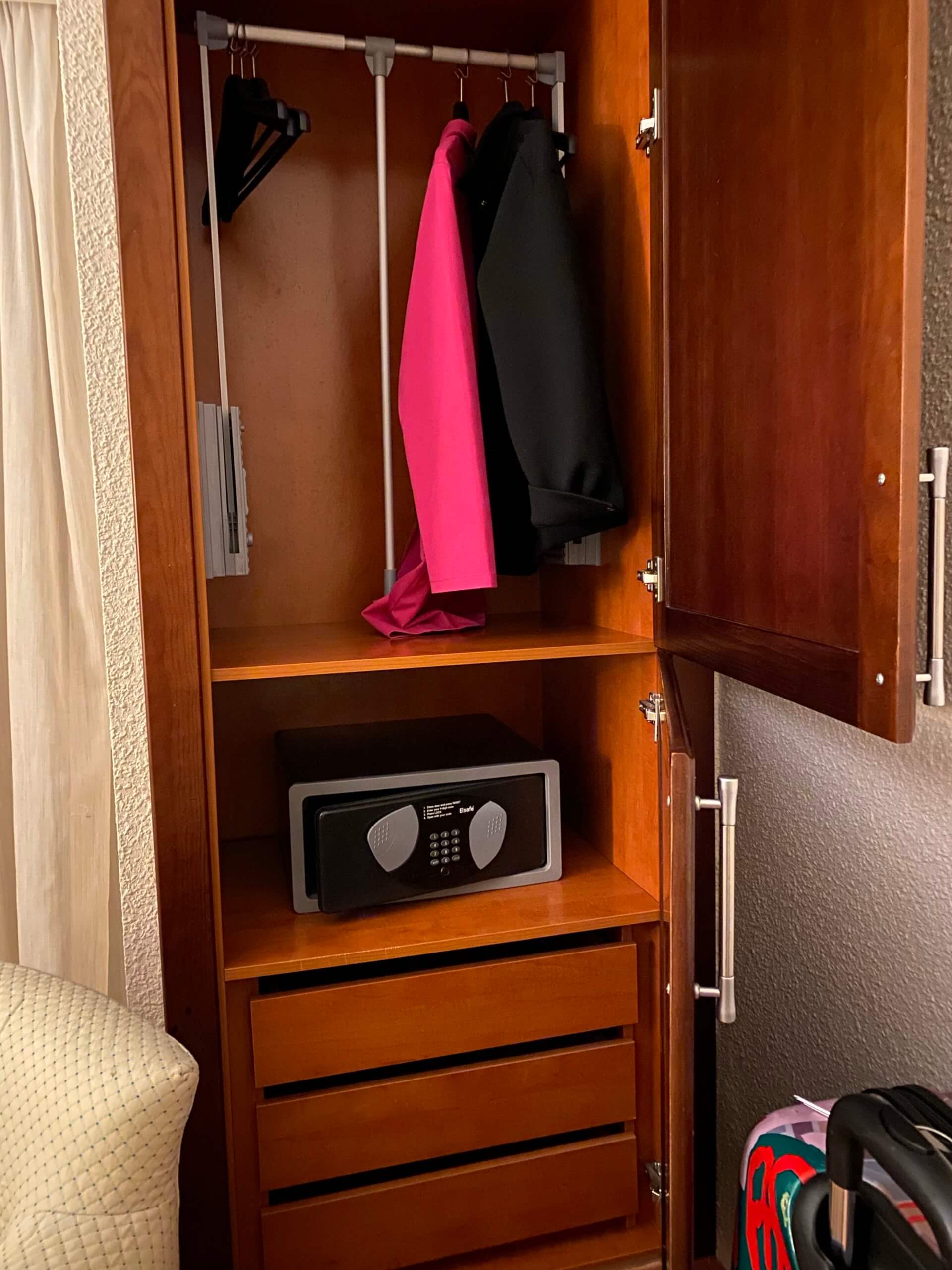 Allerdings handelt es sich um ein Zwergen-Zimmer. Der Schrank ist so niedrig, dass man ihn fast nur kniend einräumen kann. Gut, dass ich kein Kleid dabei habe, denn das würde am Boden schleifen. Außerdem sind da so komische Kleiderbügel, die man nicht rausnehmen kann. Als hätte ich jemals in einem Hotel Kleiderbügel klauen wollen.