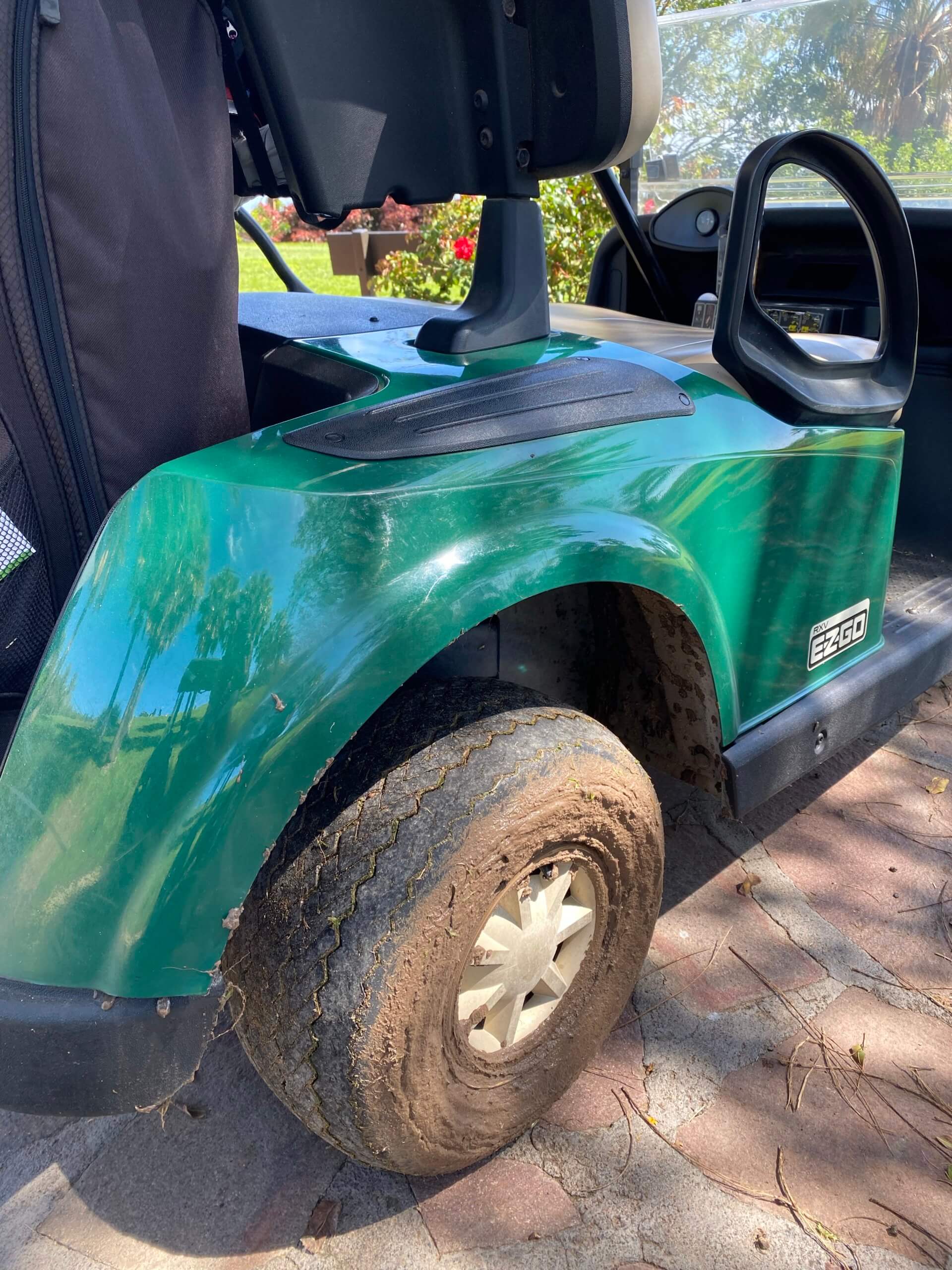 Ich setze mich in Monis Cart, um mit ihr und Christa zu dritt zum Tee 1 zu fahren. Wir kommen nur wenige Meter weit, dann hält uns ein Mitarbeiter des Golfclubs an und erklärt, dass wir nicht zu dritt im Wägele fahren dürfen. Kurz entschlossen springe ich zu ihm ins Cart und sage ihm, dass ich dann eben mit ihm nach oben fahre. Ich glaube, er hatte eigentlich andere Pläne, aber es bleibt ihm letztlich doch nichts anderes übrig, als mich nach oben zu bringen 🤣