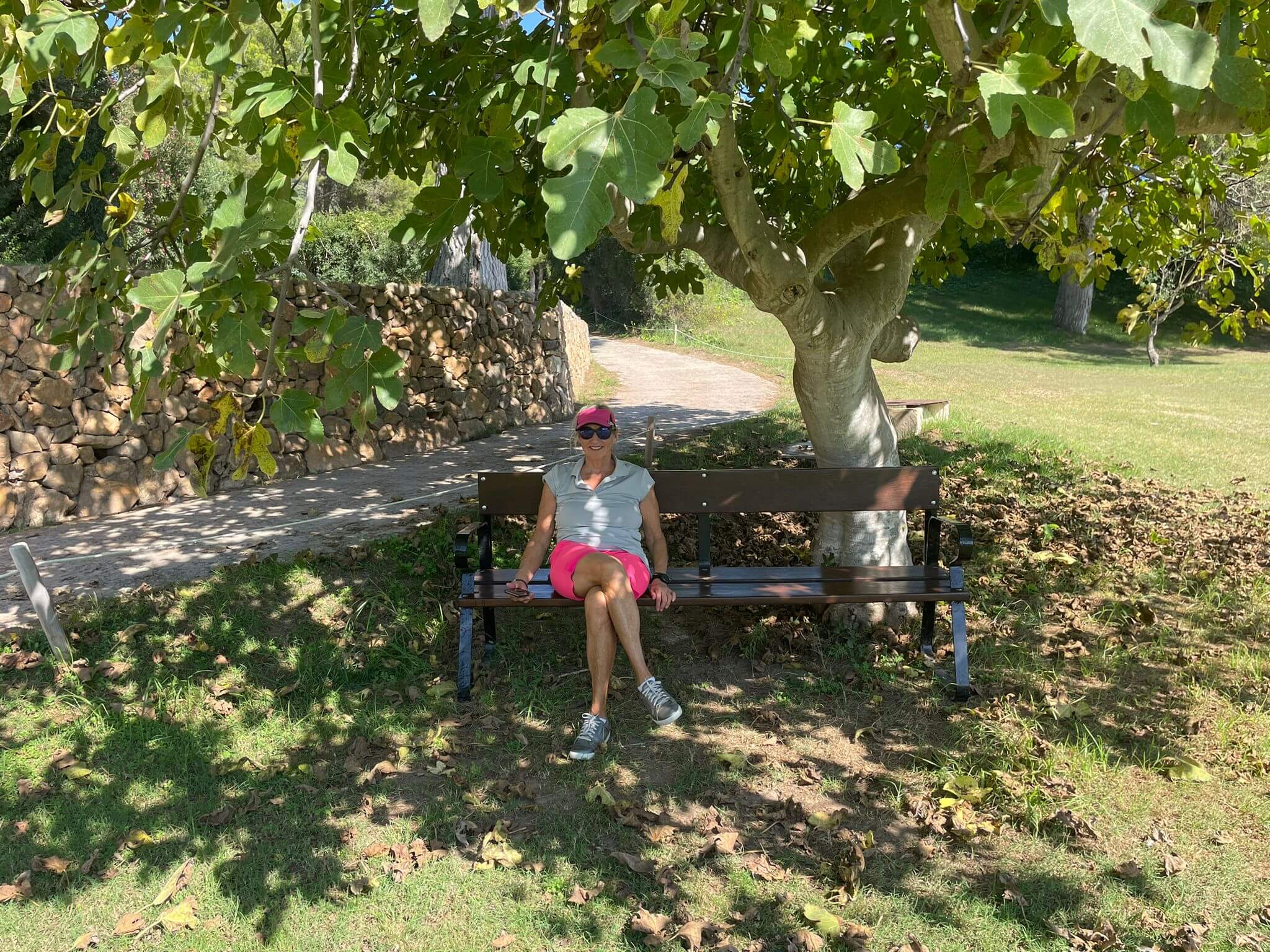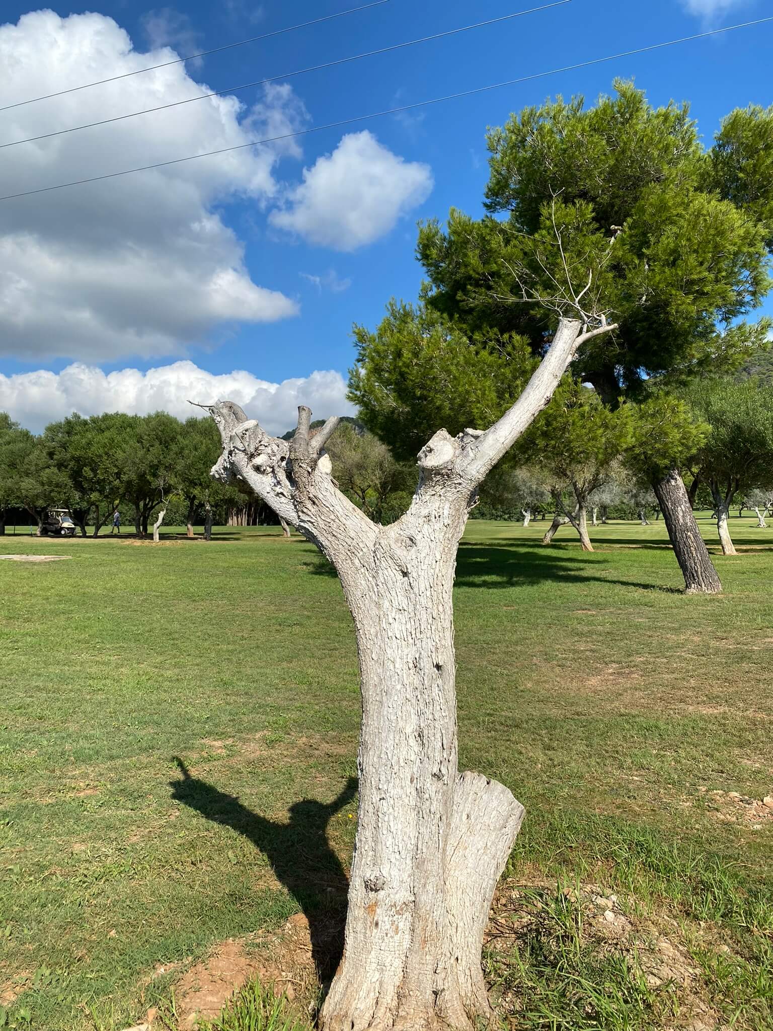 Die Dame an der Golfrezeption kann uns nicht mit Sicherheit sagen, ob unsere zwei eingebuchten Flightpartner kommen oder nicht und erzählt auch etwas von einem Turnier. Leicht verwirrt gehen wir zum Tee 1. Dort ist niemand, also starten wir. Bereits an Bahn 2 laufen wir auf einen sehr, sehr langsamen Flight mit älteren Herren auf. Das ist nun wohl das Turnier. Das wird ja lustig. Wir schleichen hinterher. An Bahn 3 geht es wieder in die Pine Trap. Die bewältigen die vier auch nicht wirklich zügig. An Bahn 4 kommt endlich ein Bänklein. Obwohl es noch vor 11 Uhr morgens ist, ist es extrem warm und schwül. Hier auf Mallorca ist es (wie übrigens auch in Deutschland) 5 bis 6 Grad wärmer als normal für diese Jahreszeit.