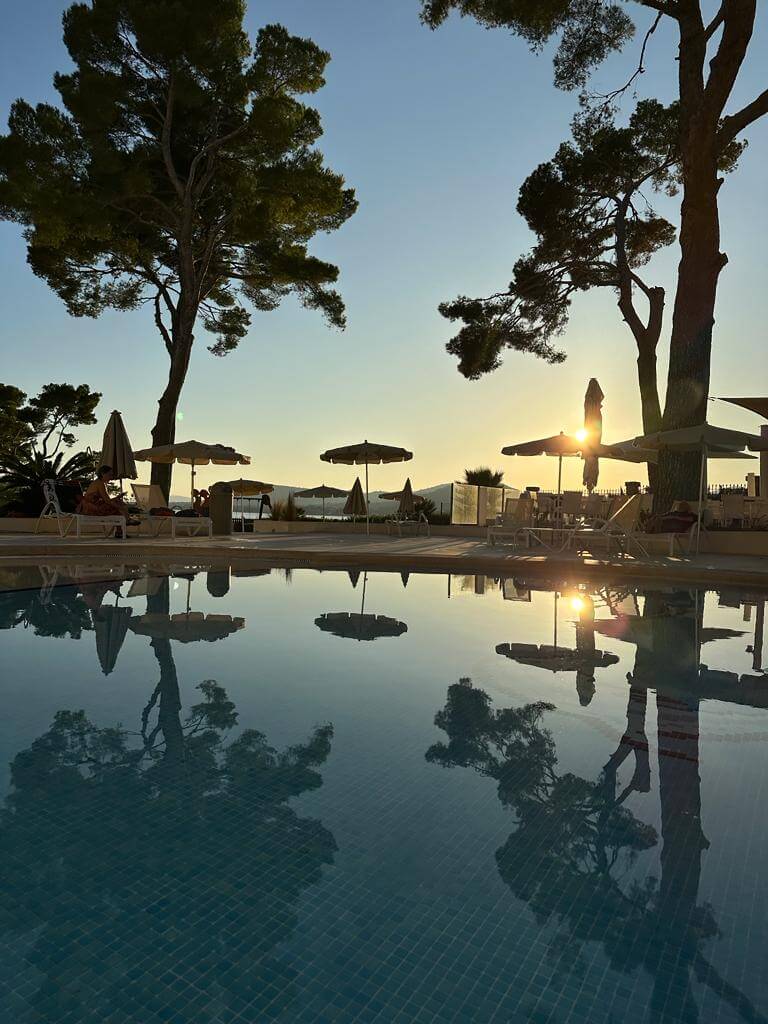 Zurück im Hotel gibt es einen leckeren Tinto di verrano an der Poolbar. Ein Stückchen weiter Richtung Meer ist eine Art große Terrasse mit Liegestühlen und wunderbarem Ausblick aufs Meer. Zum Meer selbst geht es noch einige Stufen hinab. Ein Steg führt ins herrlich klare Wasser, das auch noch schön warm ist. Morgen gehe ich rein!