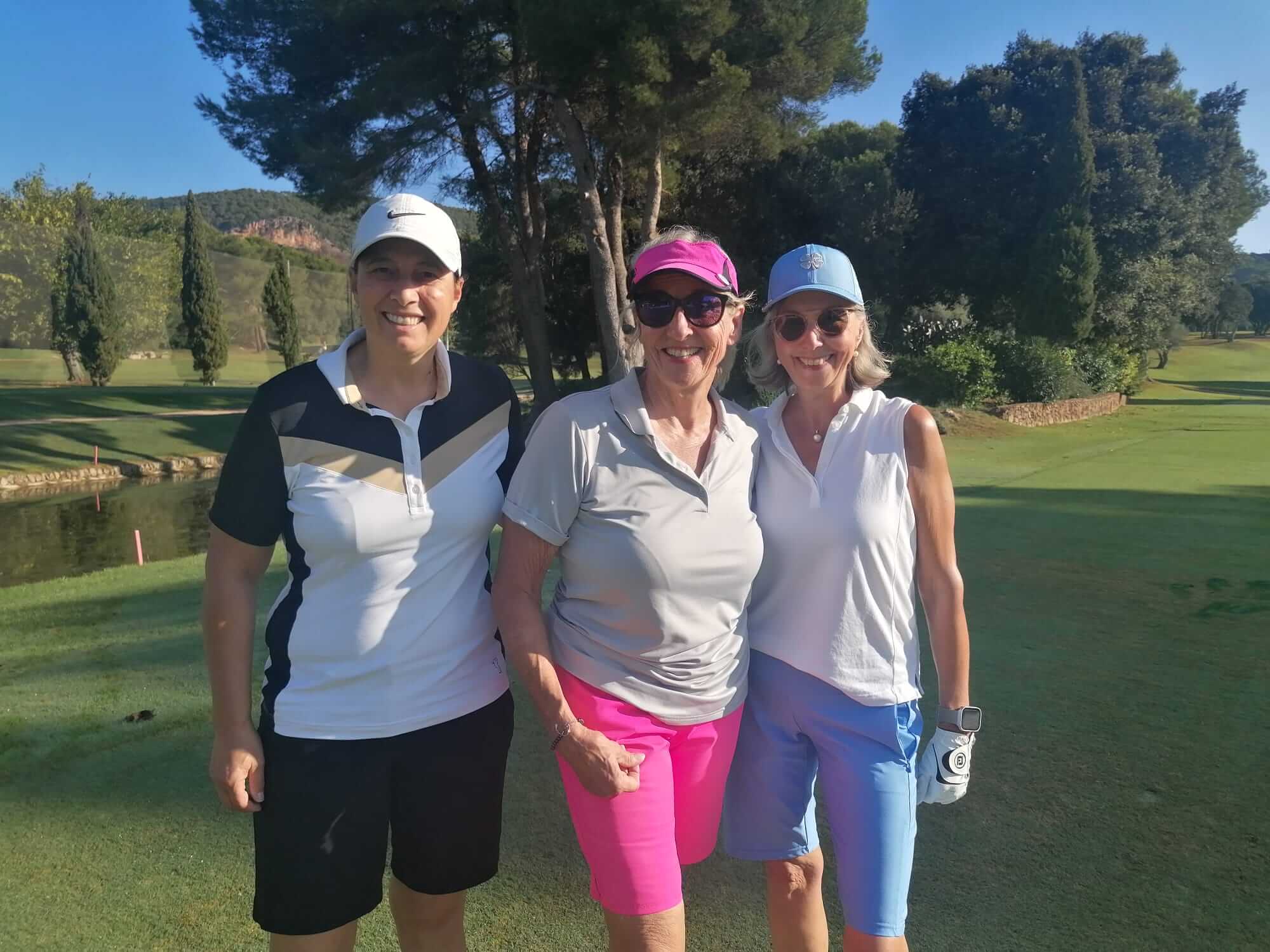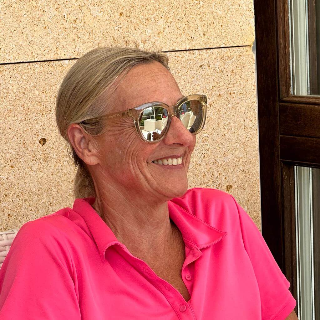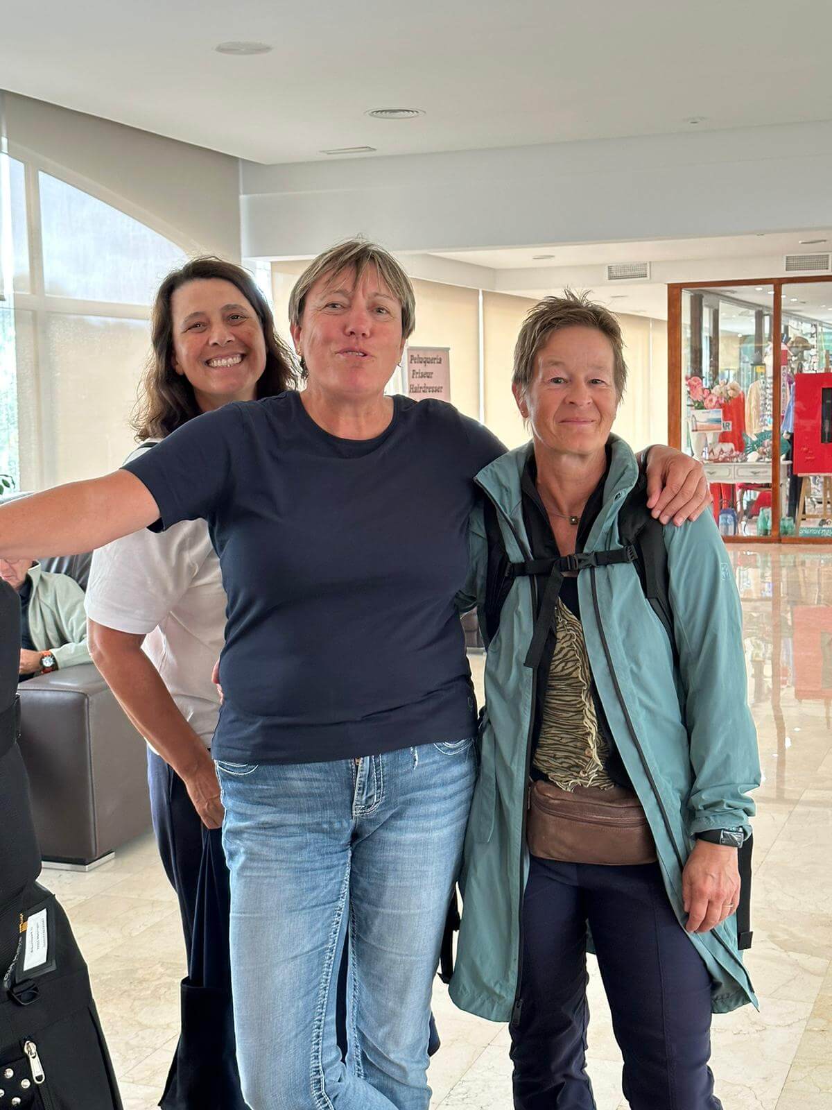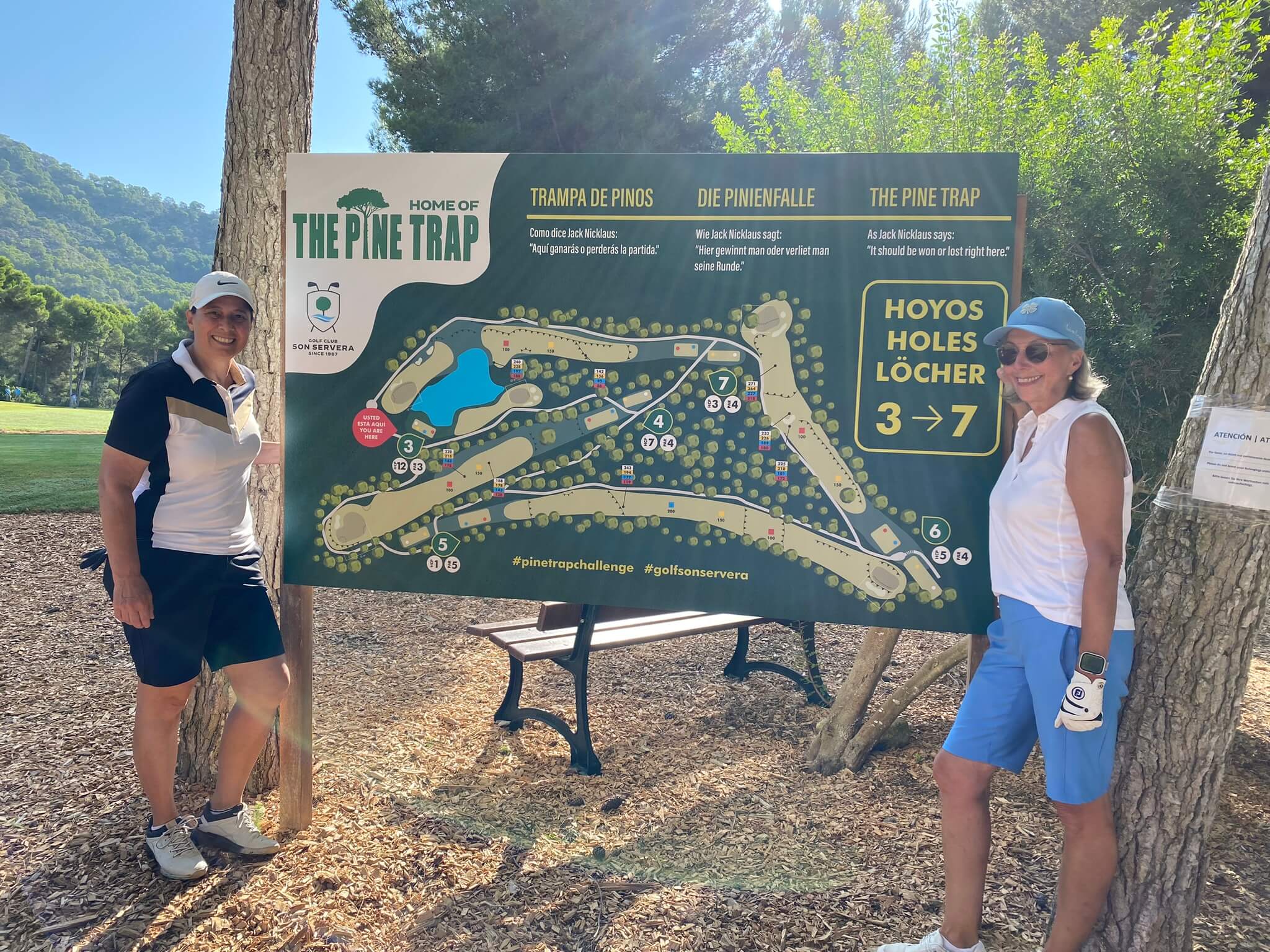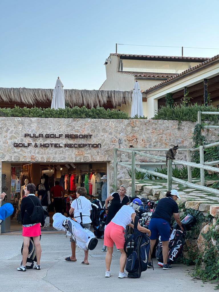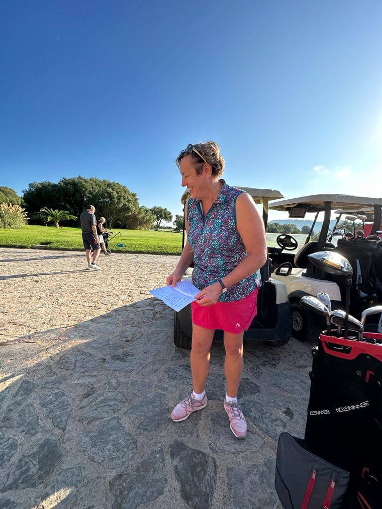 Son Servera ist ein sehr schöner Platz, der mit dem Slogan „Home of the Pine Trap“ wirbt. The Pine Trap sind fünf Bahnen, die durch üppig herumstehende Pinien erschwert werden. Es geht ordentlich auf und ab mit unseren Schiebetrolleys. Eine Besonderheit sind die Abschlagsmarkierungen. Die bestehen aus jeweils zwei großen Zahlen. Bei den Damen ist das immer die 49. Der Starter erklärt uns, dass das bedeutet, dass man auf 18 Loch 4,9 km geht, wenn man die Ideallinie spielt. Meine Uhr zeigt nach der Runde nicht etwa 4,9 sondern acht komma irgendwas an. Soviel zum Thema Ideallinie. Ich spiele heute mit Laura und Bini. Bini hat zunächst noch mit ihren geliehenen Schlägern zu kämpfen, groovt sich aber ziemlich schnell ein. Wir sind heute der erste Flight – zum Glück, denn die anderen lassen sich ganz schön Zeit, so dass der Transferbus einige Zeit auf sie warten muss.