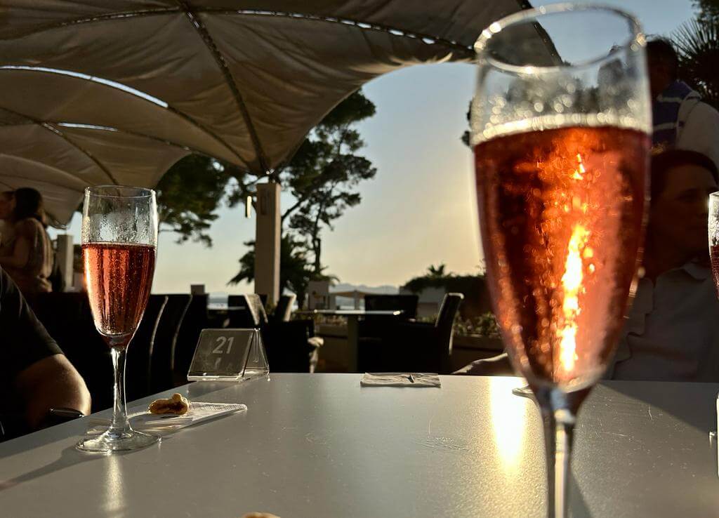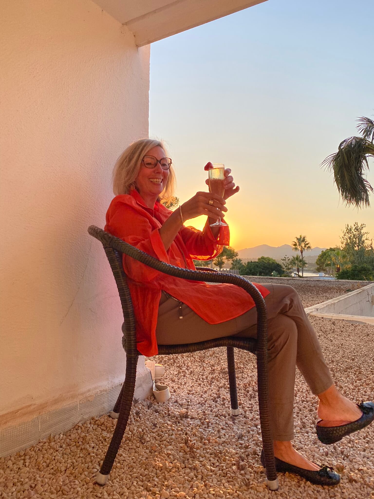 Heute abend besucht mich Bini zum Aperitiv in meinem Zimmer. Mein Zimmer ist gut 1 1/2 Meter unterhalb vom Dach des Speisesaals gelegen, was bedeutet, dass man gegen eine Mauer schauen würde, wenn man sich auf den „Balkon“ setzen würde. Aber natürlich habe ich Abhilfe gefunden. Man muss nur die zwei Balkonstühle auf das vorgelagerte Dach heben, um eine wunderbare Aussicht auf Meer und Sonnenuntergang zu haben. Hier geniesse ich mit Bini ein Glas Cava bevor es zum Abendessen geht.