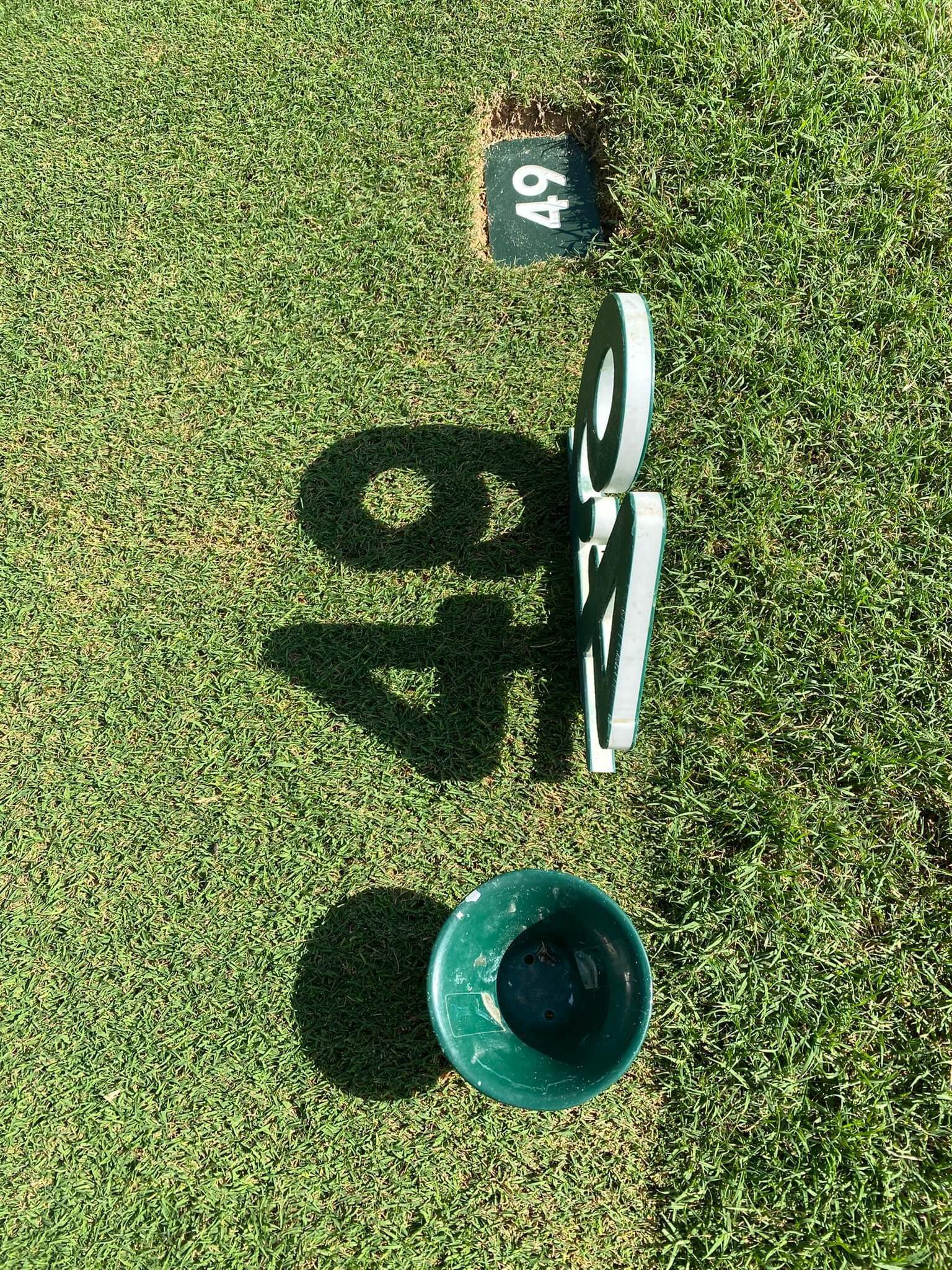Wir lassen uns also auf dem Bänkchen nieder und essen unser Vesper. Da kommt der Marshall herbeigefahren. Wir kommen sogleich mit ihm ins Gespräch. Er versteht ebenso wenig wie wir warum man uns direkt hinter dem Turnier rausgelassen hat. Er organisiert rasch etwas über sein Walkie Talkie, dann teilt er uns mit, dass er uns zu Bahn 11 bringen wird, von wo aus wir zuerst die zweiten neun Bahnen spielen können und dann wieder an der 1 starten. Wir sind begeistert.