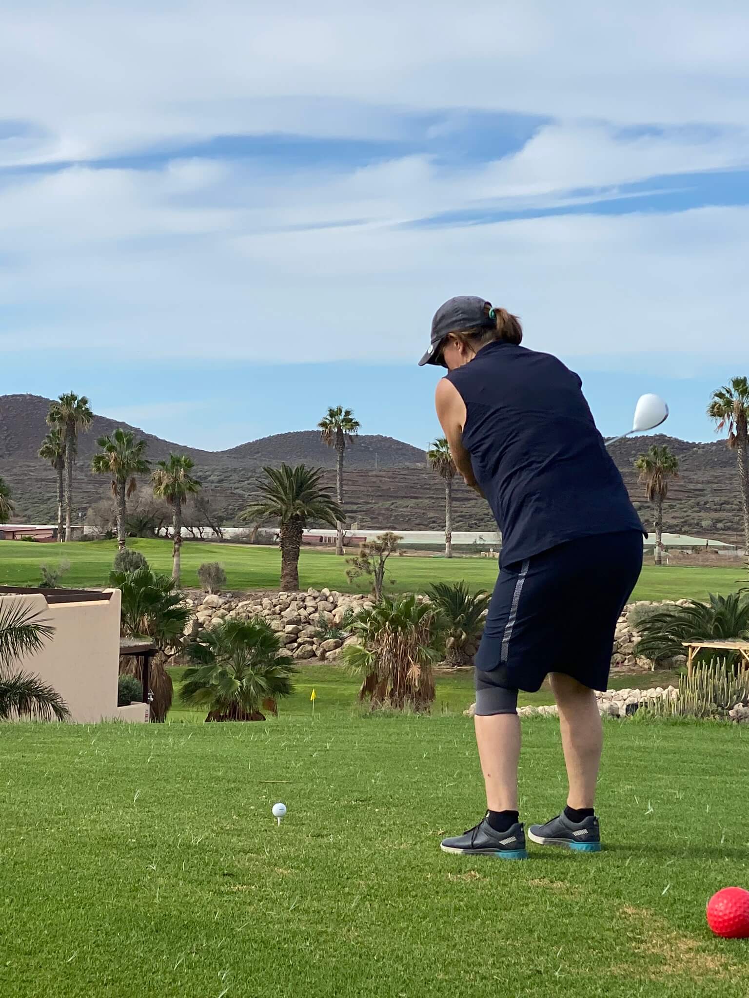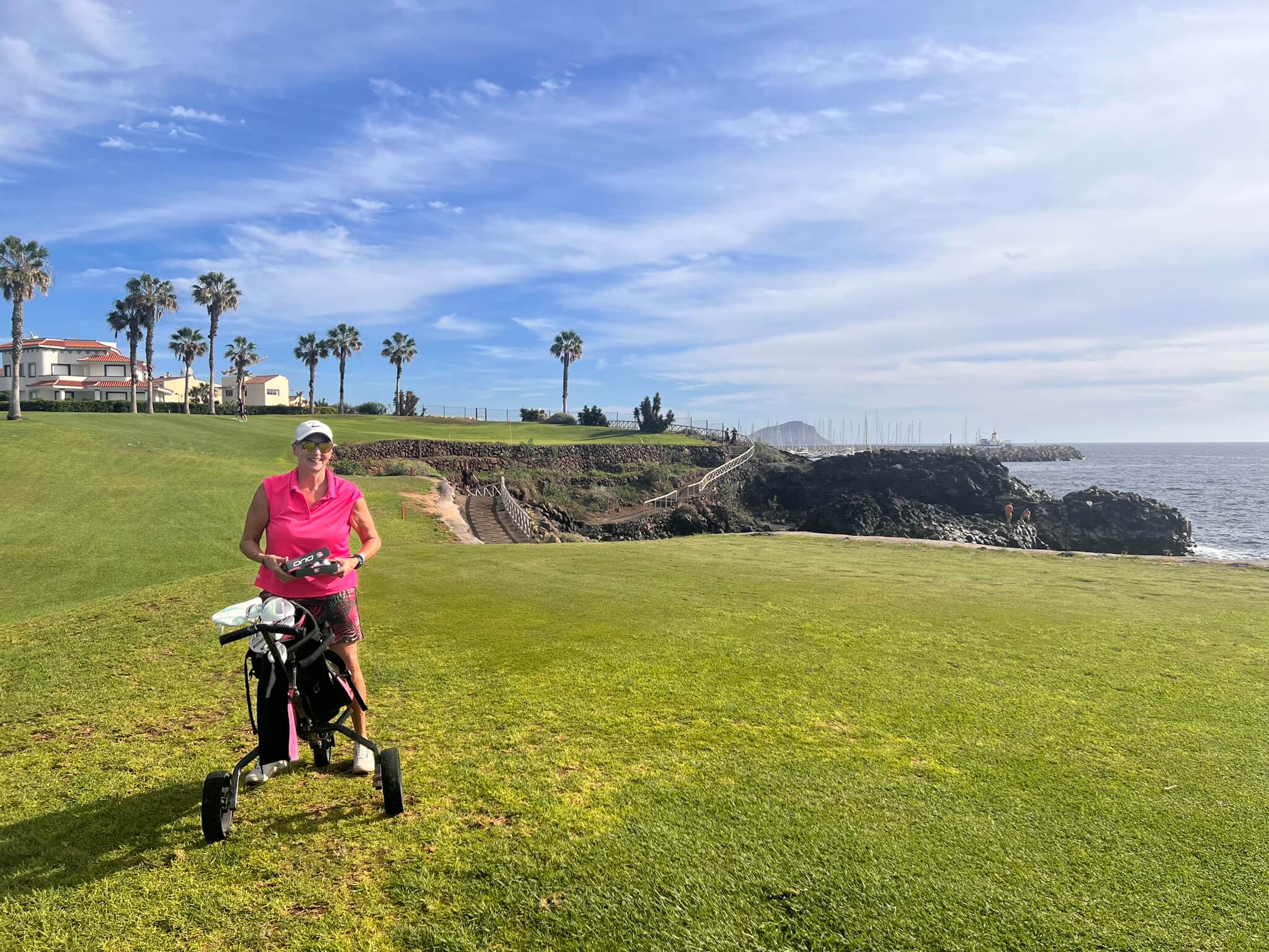 Wir spielen heute den Costa Adeje Golfplatz. Er ist nur ungefähr 10 Minuten entfernt. Wir spielen mit einem Österreicher und seinem Schwiegersohn. Die beiden fahren im Wägele während wir brav zu Fuß gehen.