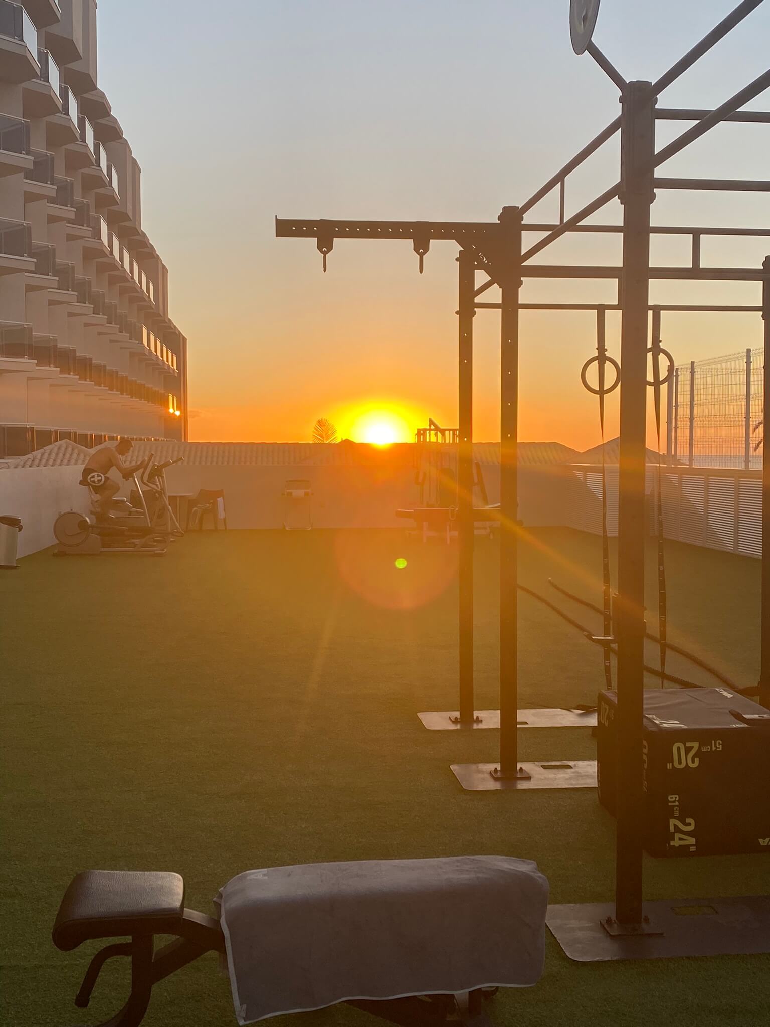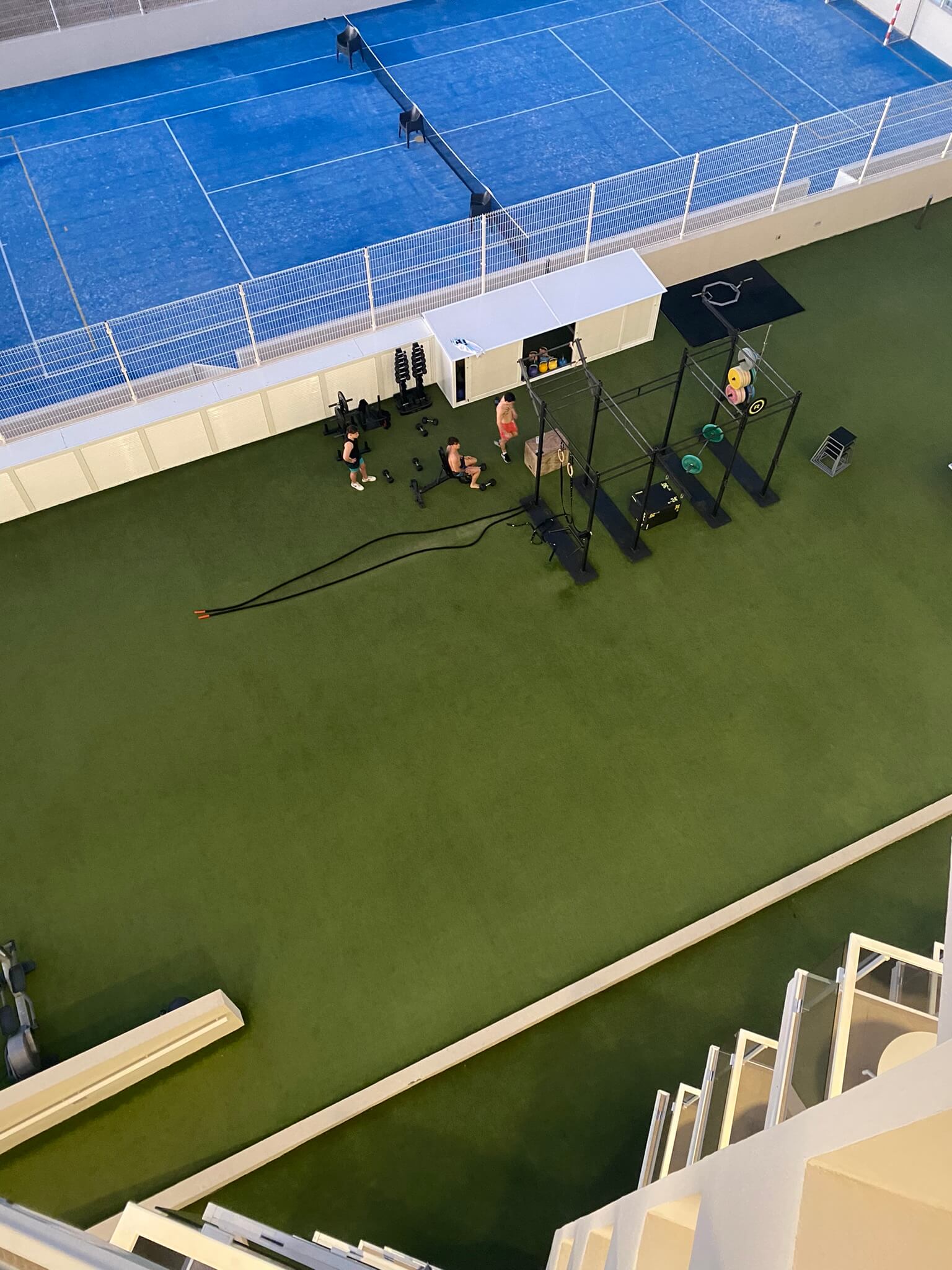 Ich trainiere noch ein wenig im Outdoor Fitnessbereich. Er ist sehr weitläufig. Geräte gibt es nicht viele und die sind auch total vergammelt. Trotzdem könnte man dort was anfangen, wenn man WLAN hätte. Dann könnte man schön Yoga machen oder auch Line Dance üben. Es schauen einem 250 Leute aus den Zimmern oben zu, aber das ist ja egal.