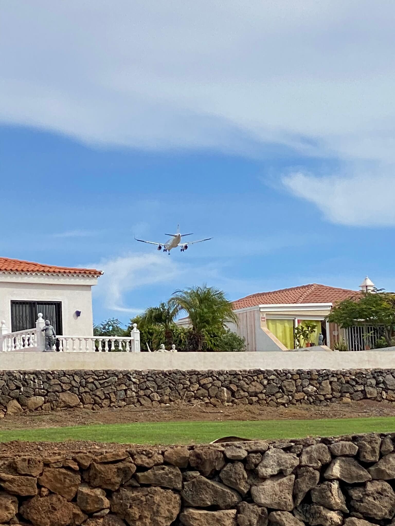 Rechts und links des Platzes sind immer wieder mal sehr schöne Anwesen und auch wirklich zauberhafte kleine Häuschen. Will man aber nicht mal geschenkt, denn der Platz liegt mitten in der Einflugschneise vom Flughafen Teneriffa Süd. Im 2-3 Minuten Rhythmus fiegt eine Maschine ein. Man kann den Leuten, die darin sitzen, fast zuwinken. Und ich kann es einfach nicht lassen, zu jedem einzelnen Flugzeug hochzuschauen.