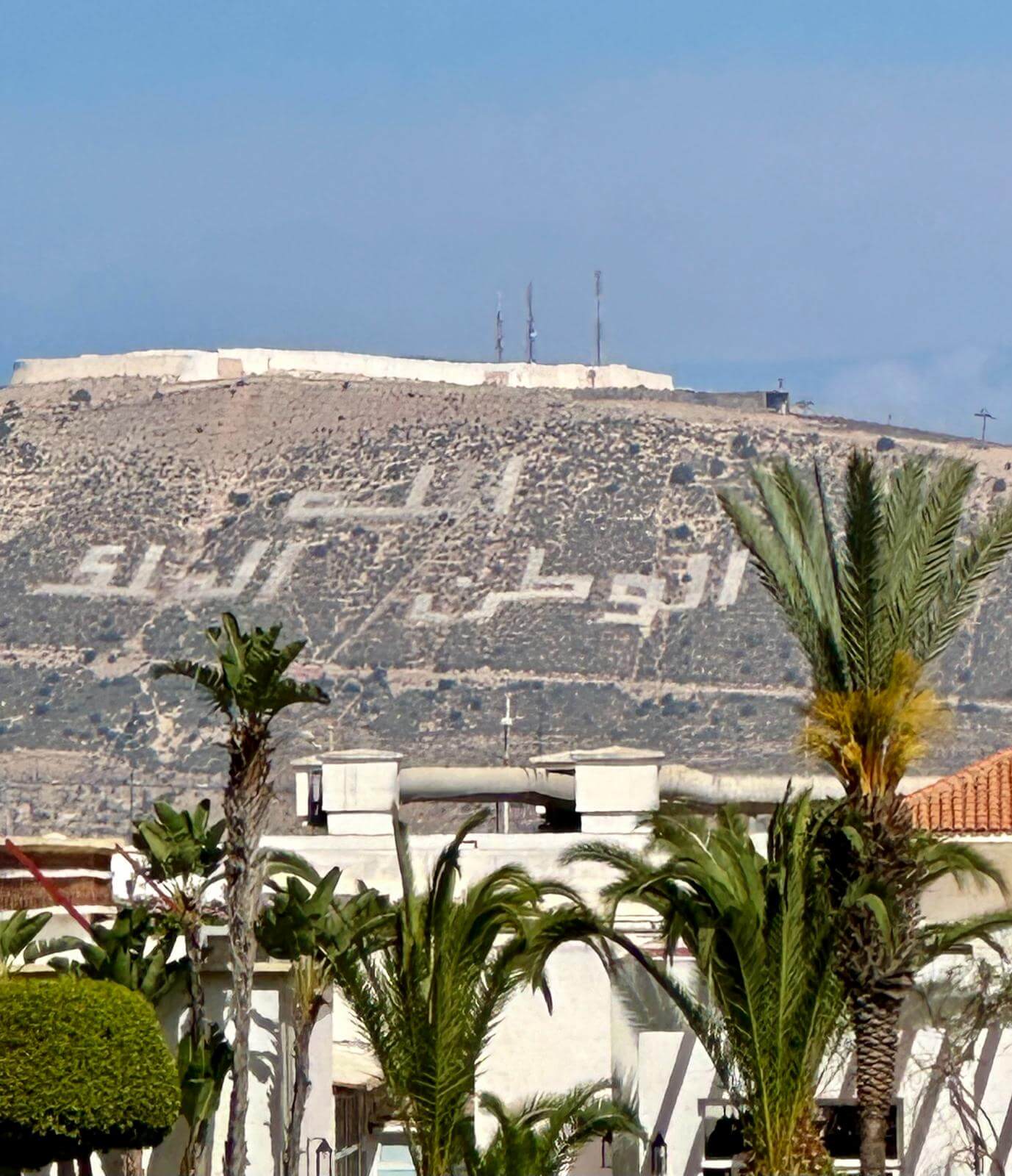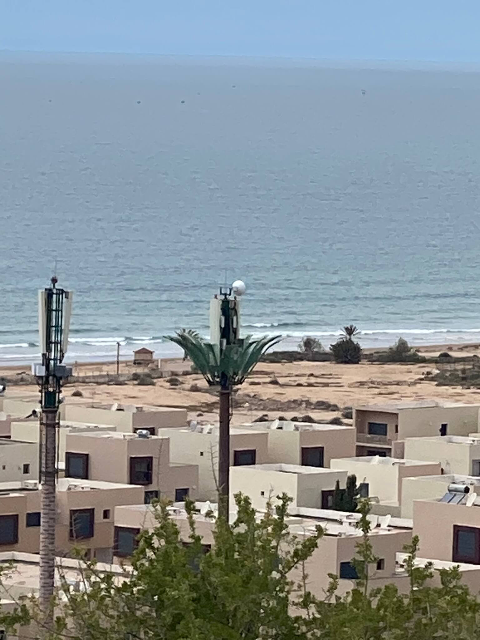 Auf den Straßen gibt es massenhaft Huppel, die eigentlich Temposchwellen heißen. Das ist ziemlich lästig, weil der Bus andauernd bis auf Schritttempo abbremsen muss. Cool finde ich, dass die Mobilfunkmasten als Palmen verkleidet sind.