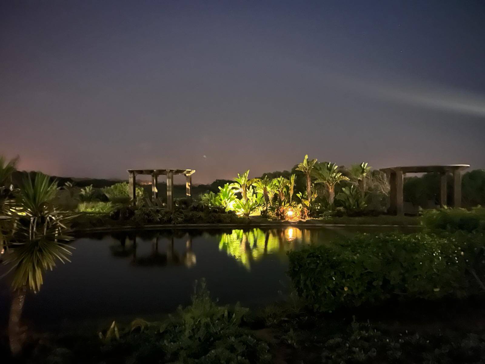 Das Abendessen beginnt etwas ungeordnet. Da wir nicht pünktlich um 19:30 Uhr vor dem Speisesaal anstehen, sondern am Pool noch einen Aperitif nehmen, ist es schwierig, einen Tisch zu finden, der allen genehm ist. Eigentlich möchten wir außen sitzen, aber da findet sich wohl kein Platz mehr. Moni, als Food & Beverage-Beauftragte unserer Gruppe, schiesst zwischen dem Außenbereich und einzelnen Speisesälen hin und her. Als wir schließlich einen Tisch finden, wo schon zwei Leute sitzen, weigert sich Horst, sich zu denen zu gesellen und die Suche geht erneut los. Schließlich finden wir einen Tisch in einer Ecke. Dort werden wir dafür erst mal von den Kellnern übersehen. Letztendlich werden wir aber alle satt und sitzen nach dem Essen noch eine Weile draußen. Aber sehr spät wird es auch heute bei uns nicht. Die 18 Loch bei 35°C fordern ihren Tribut.