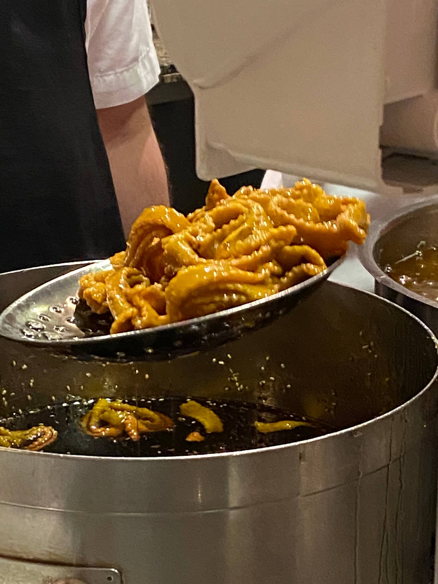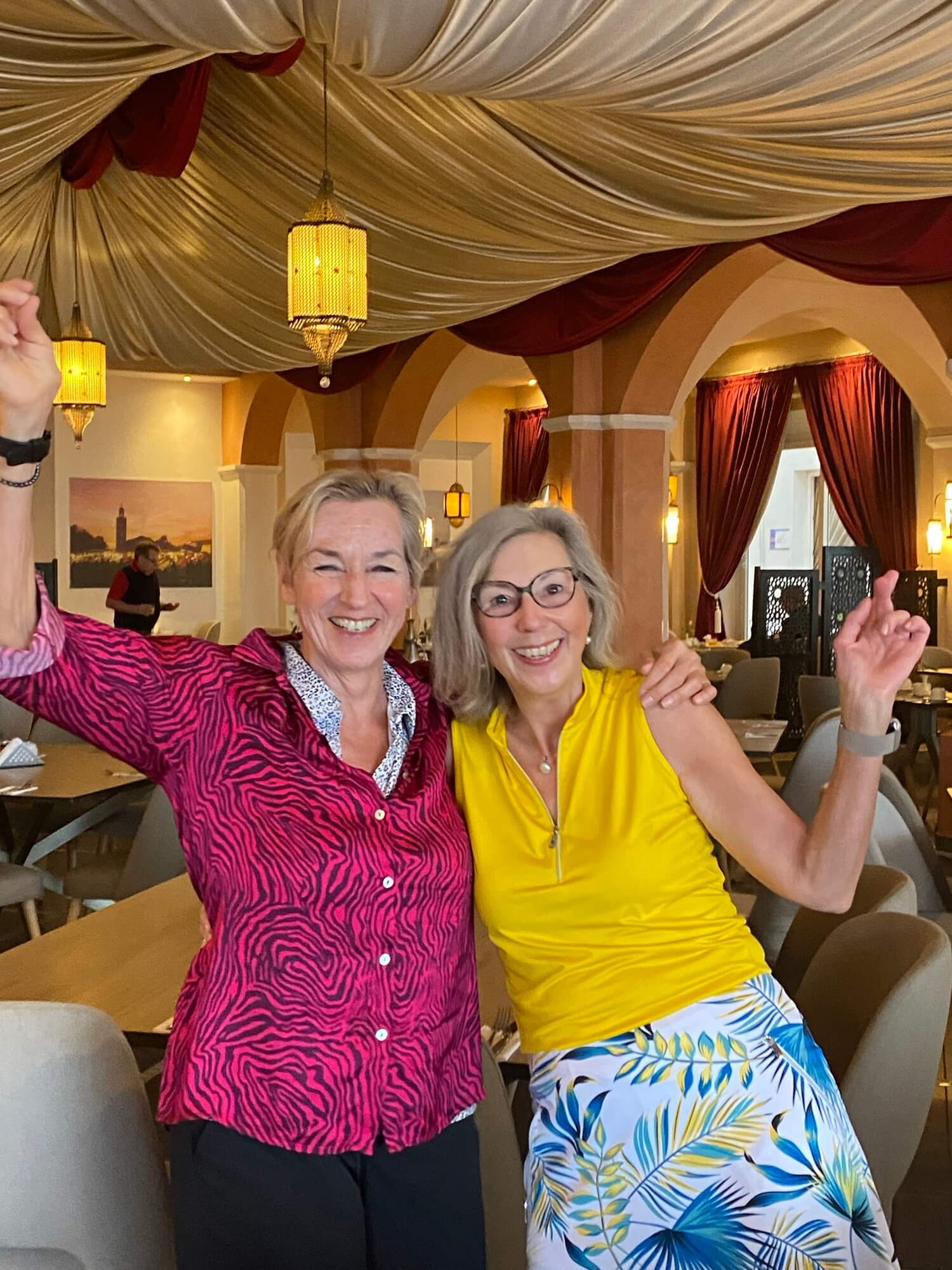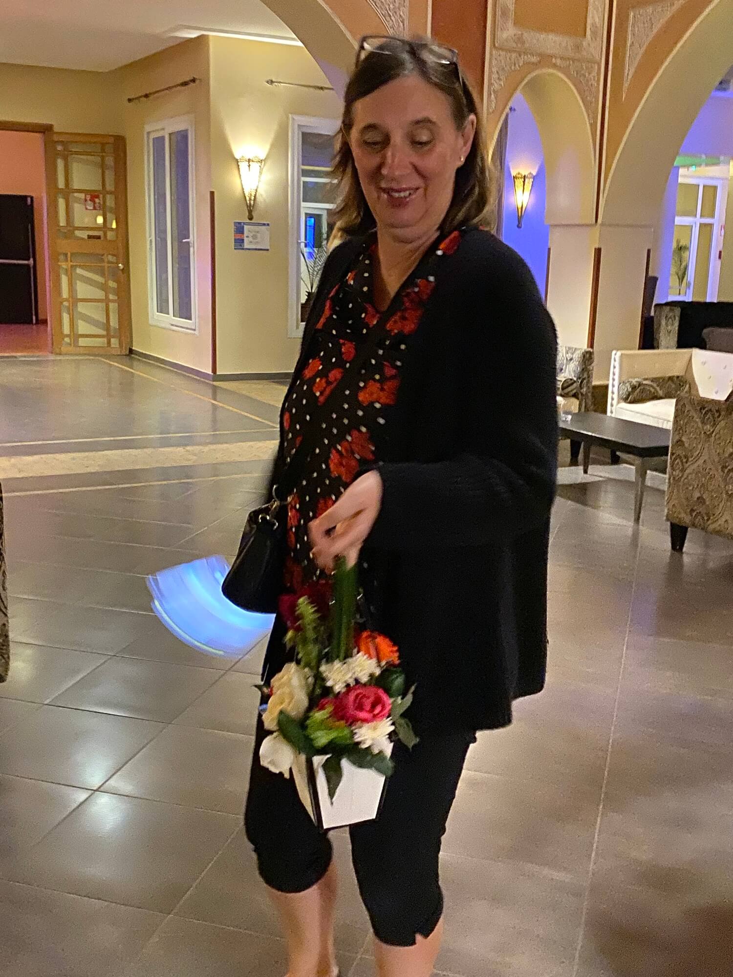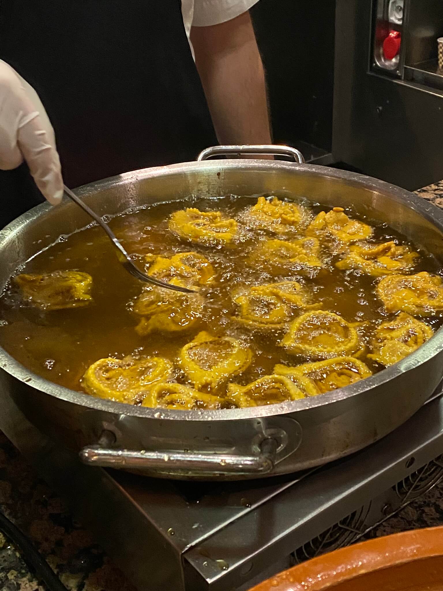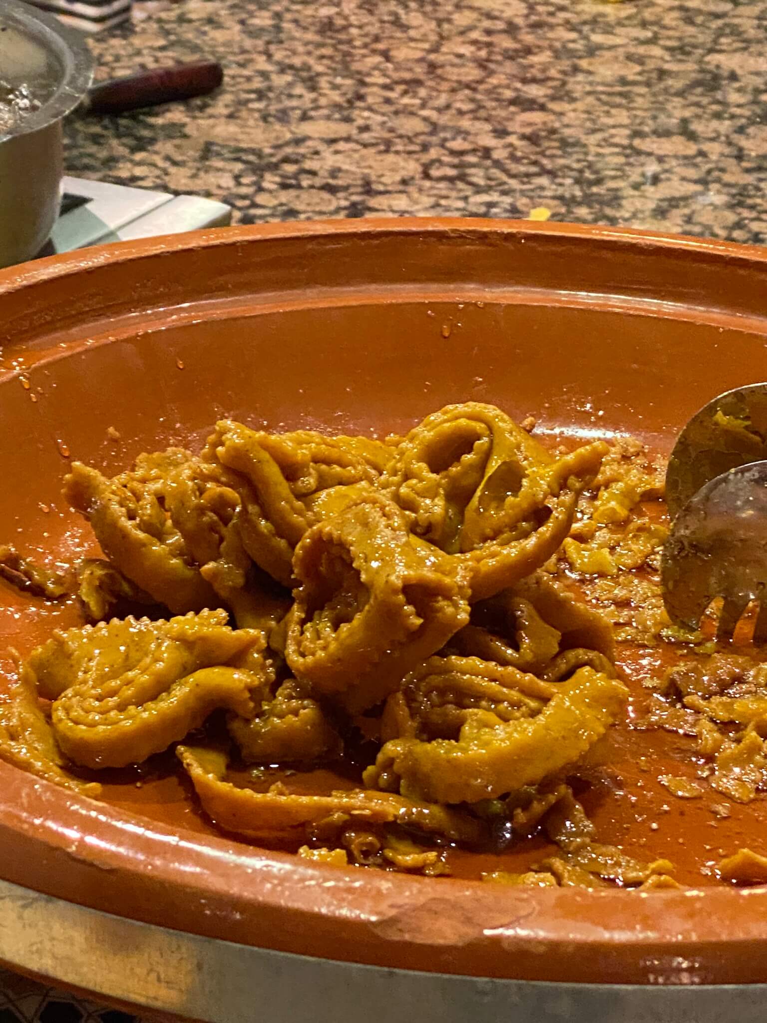 Heute ist marokkanischer Abend. Es gibt ein unglaublich köstliches Dessert – Chebakia. Eine Jellabah trägt fast niemand – die wird hier nämlich nicht zur Verfügung gestellt – und die marokkanische Show schauen wir auch nicht bis zum Ende an.